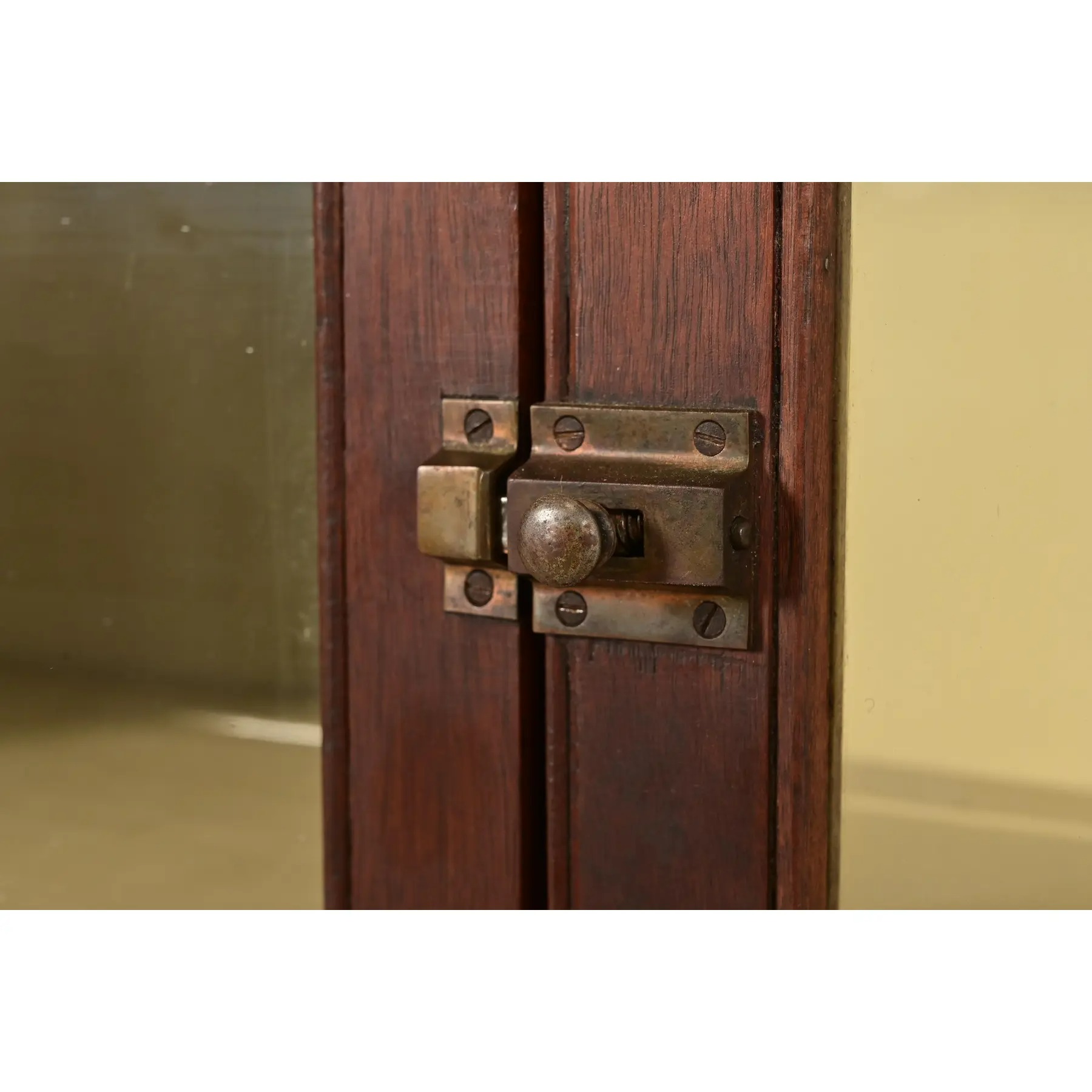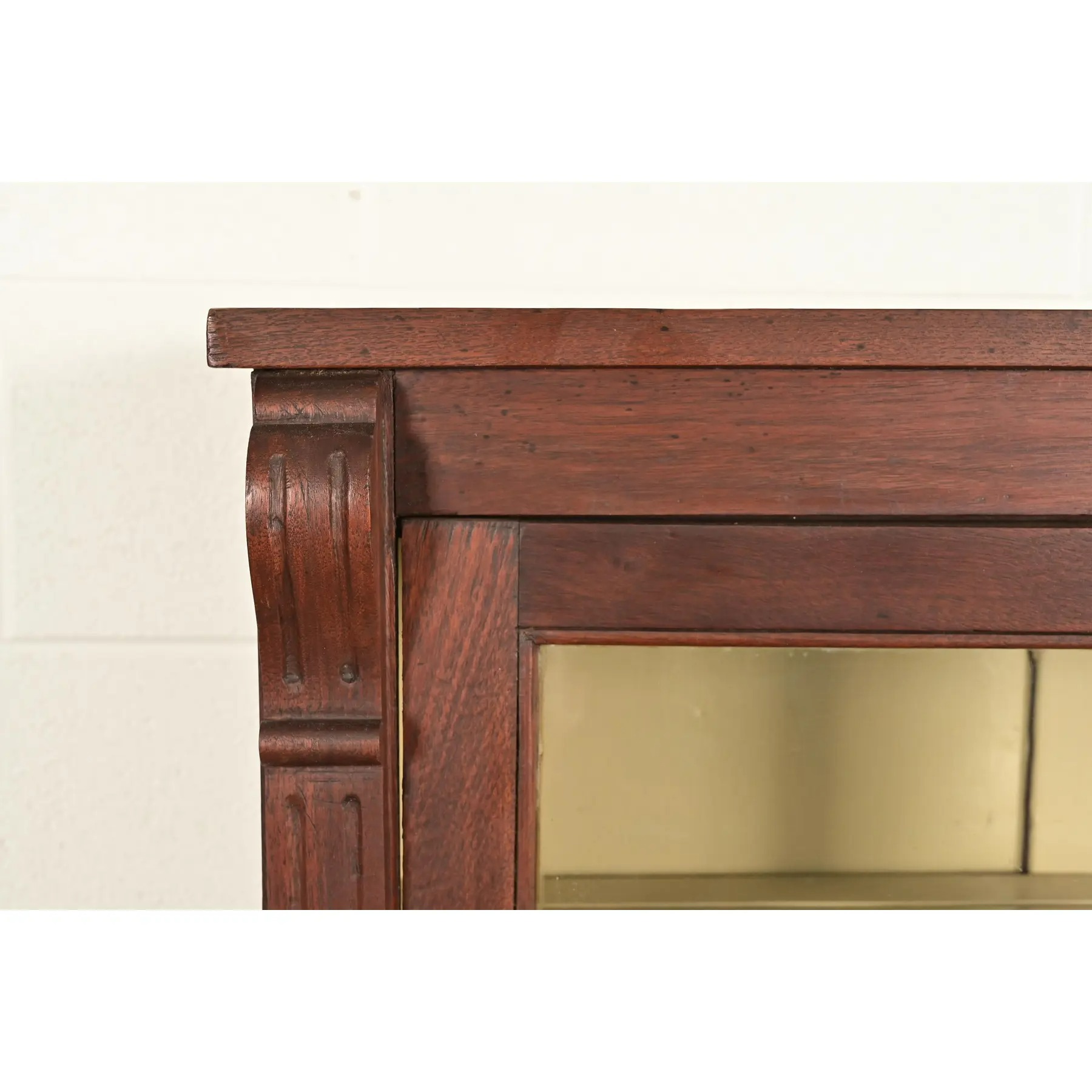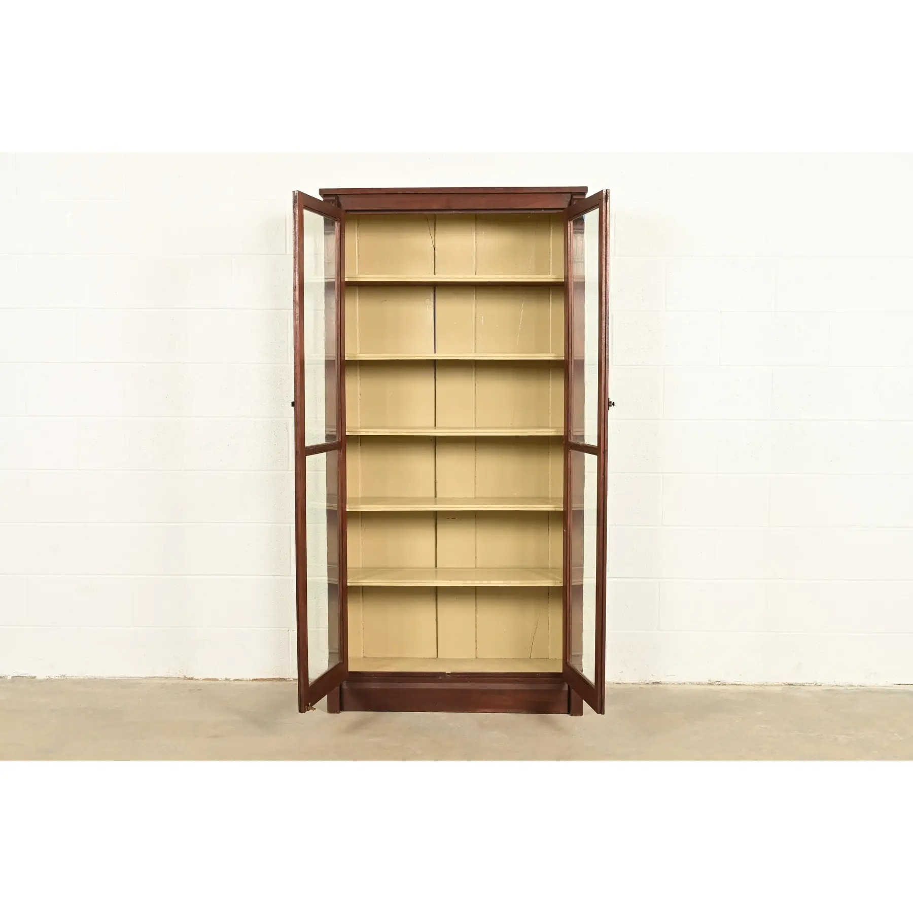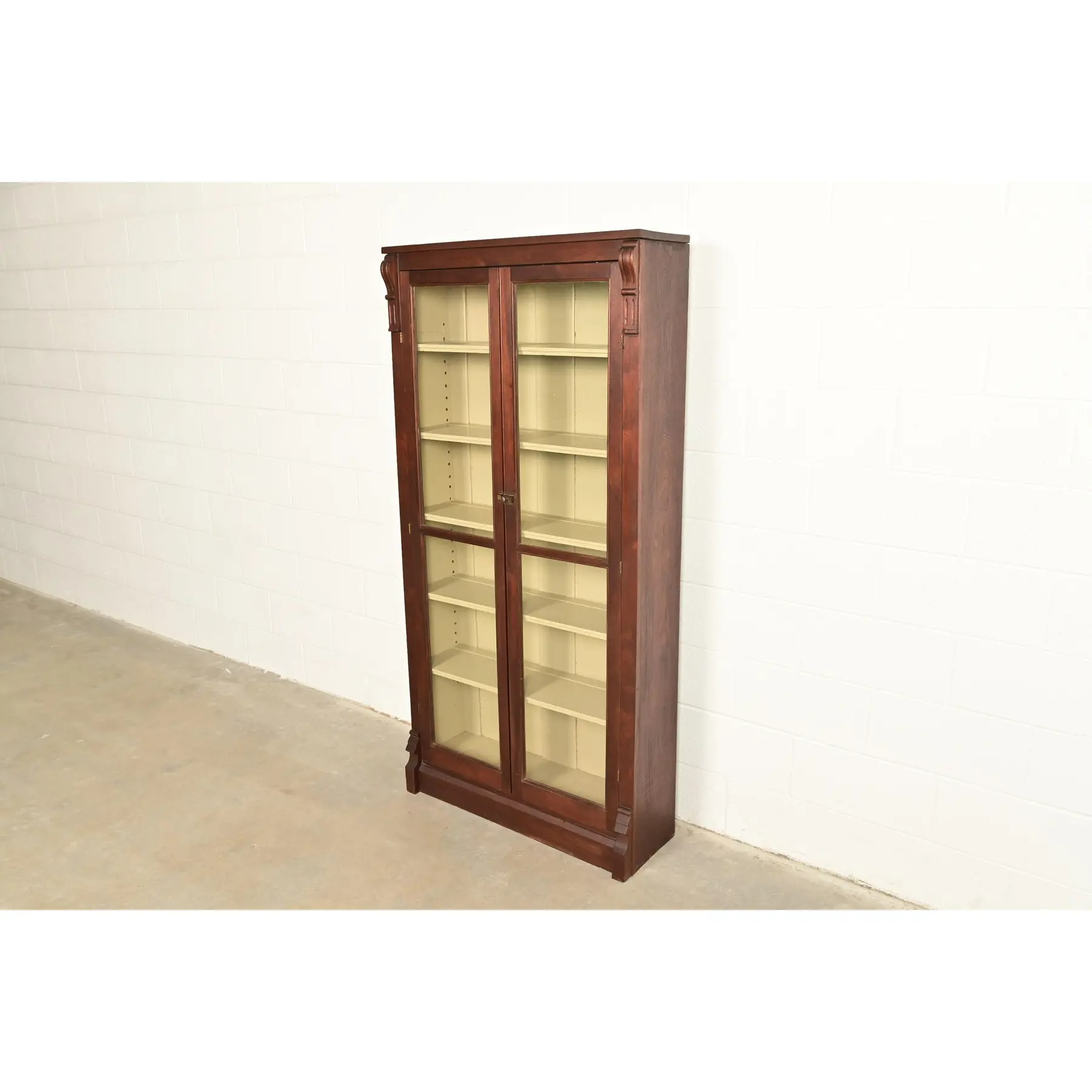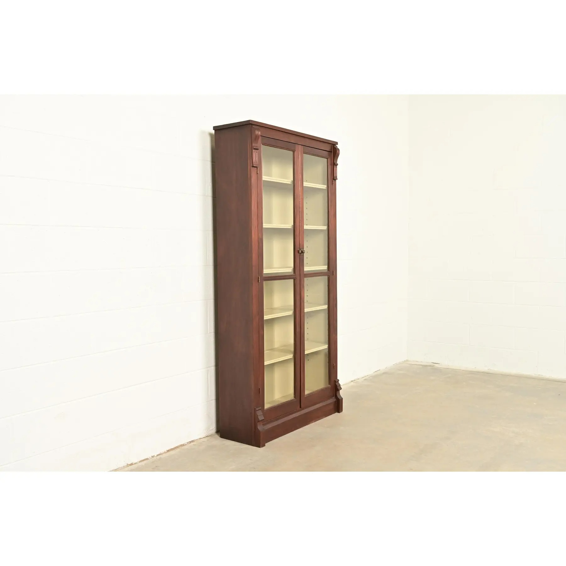 Carved walnut, with glass front doors, cream painted interior, and original brass hardware. Interior shelves are adjustable and removable.
