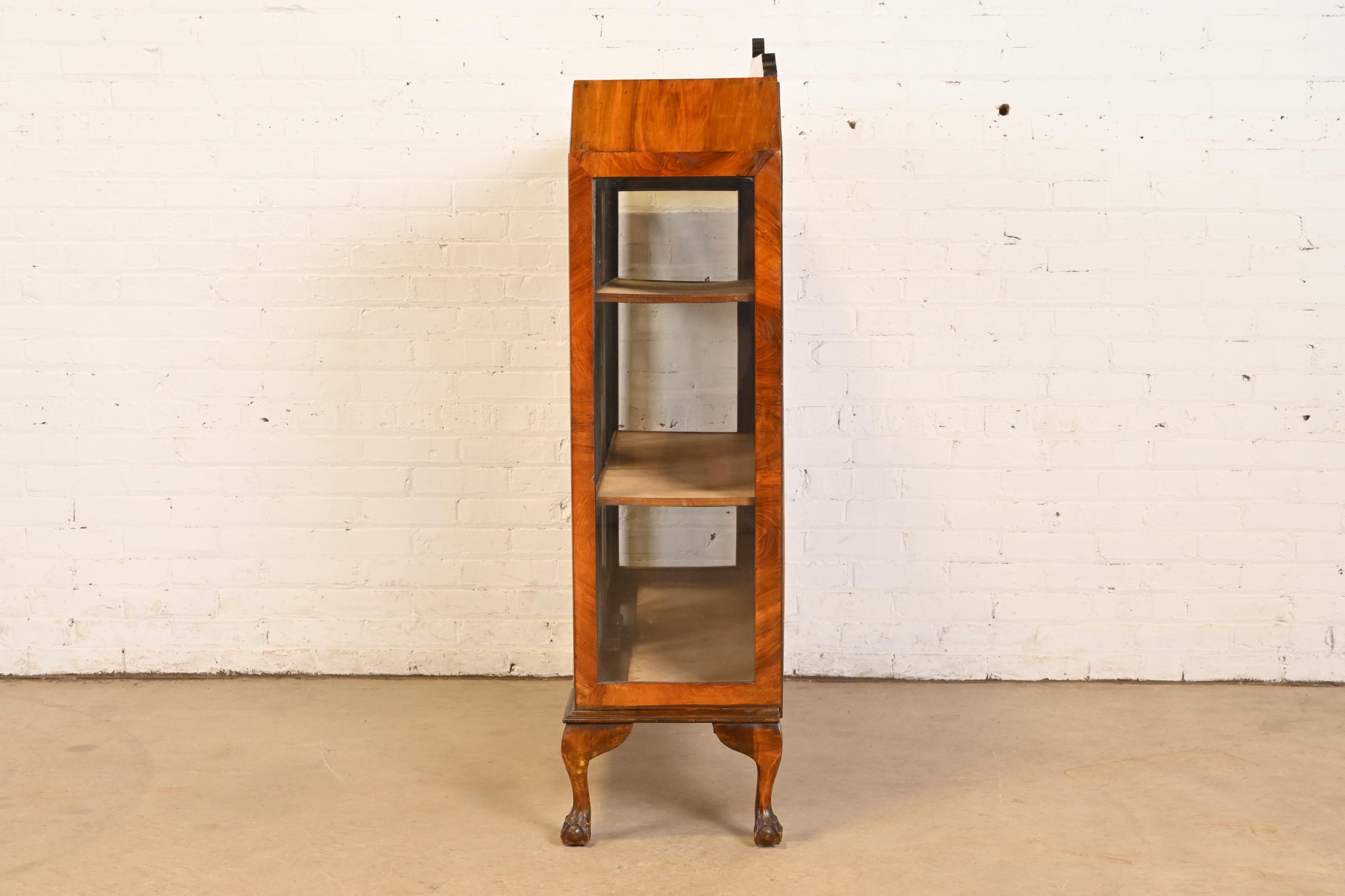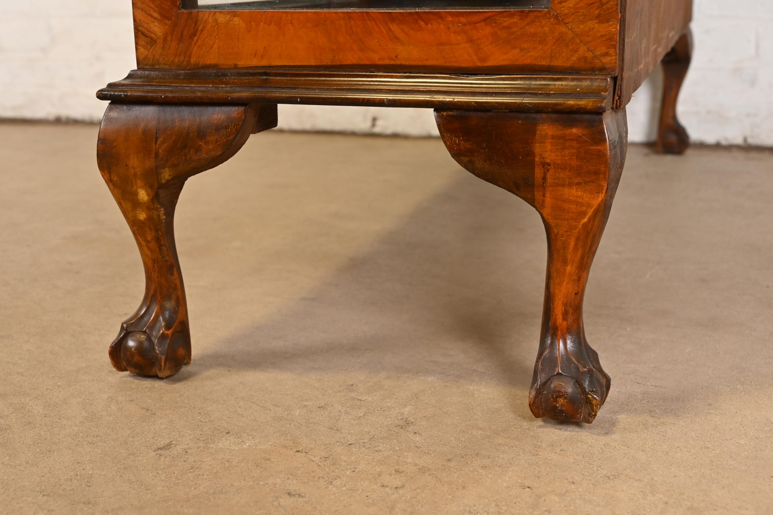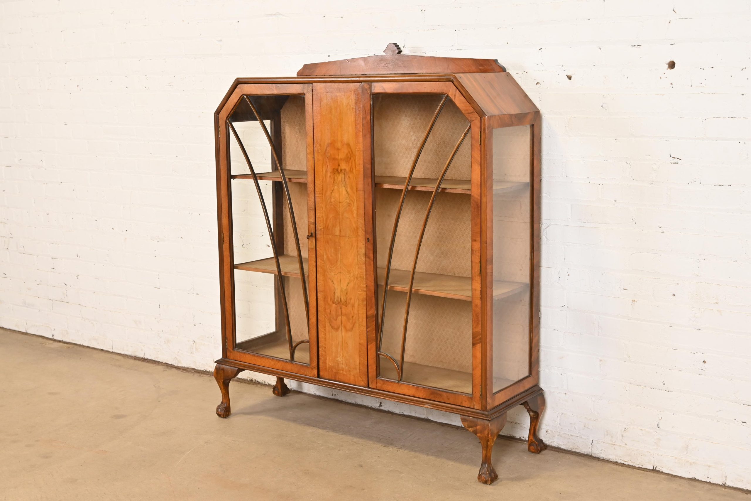 Gorgeous book-matched burled walnut, with glass front and sides, and carved ball and claw feet. Cabinet locks, and key is included.