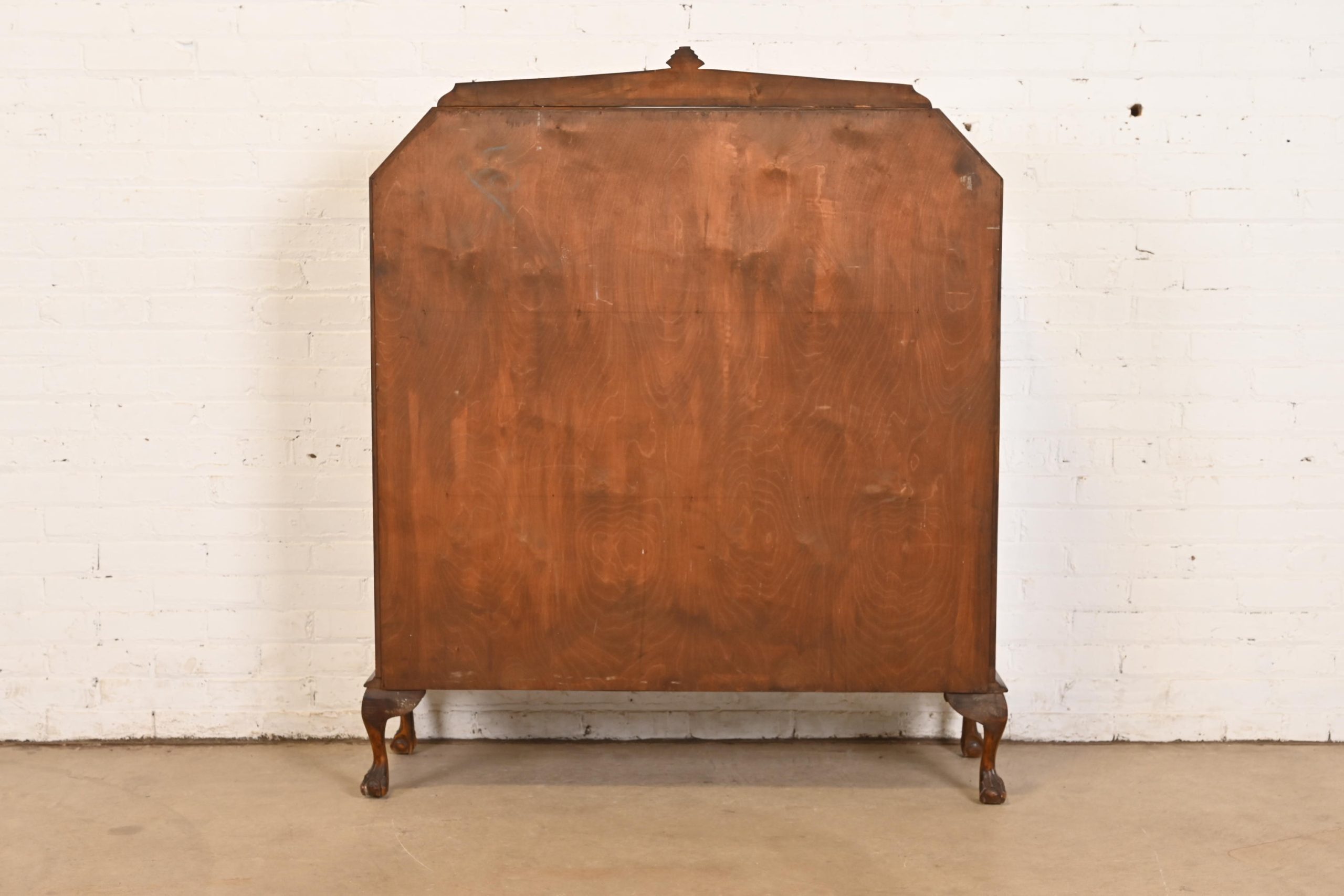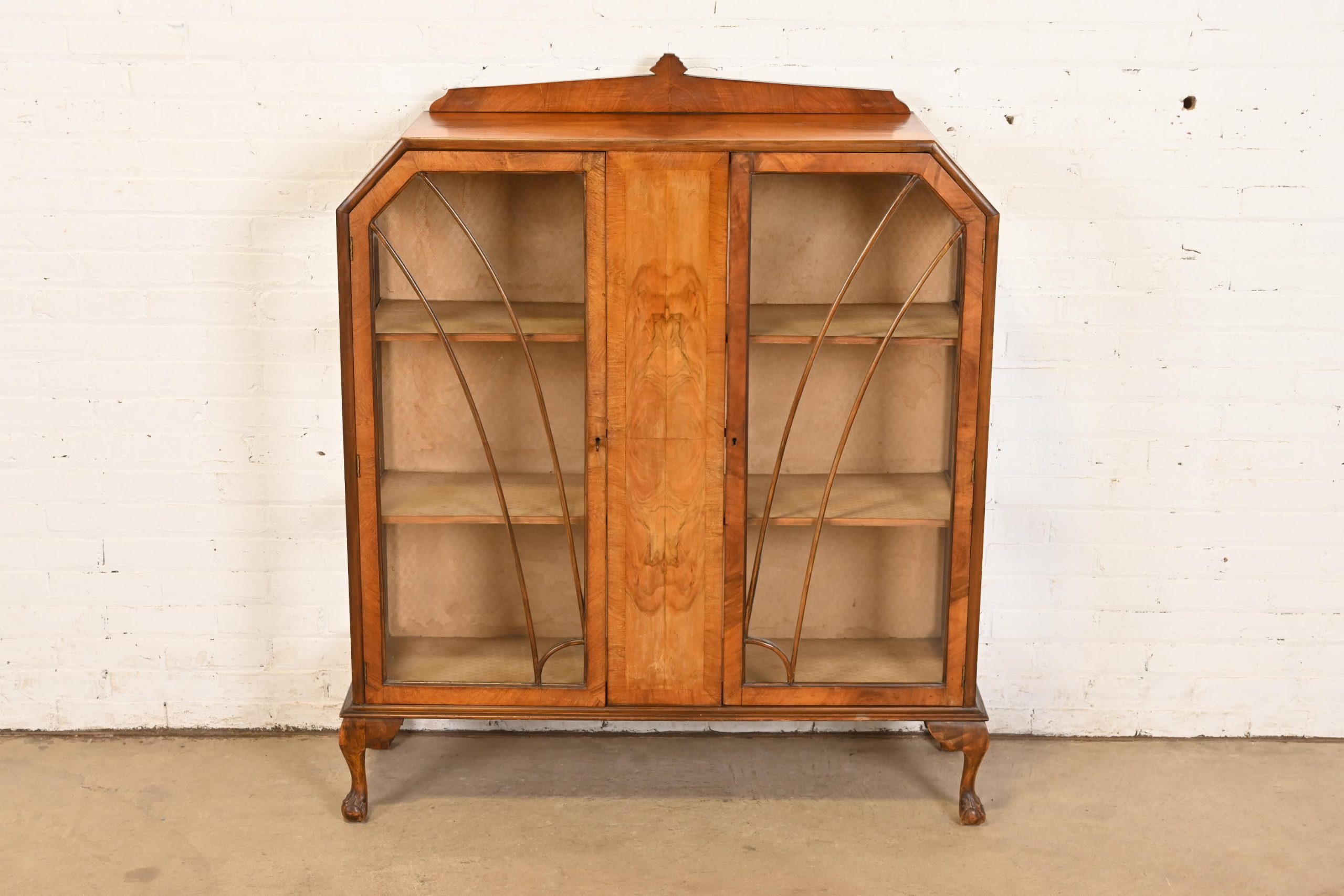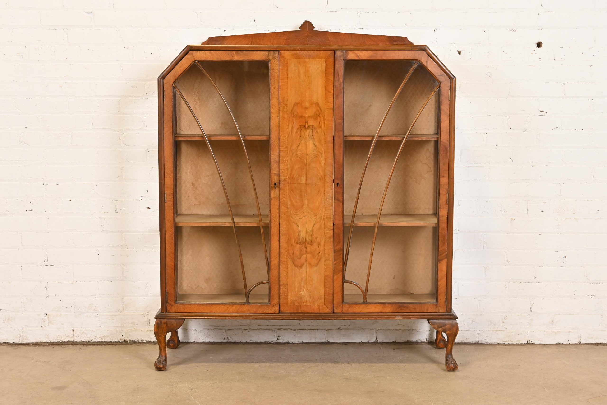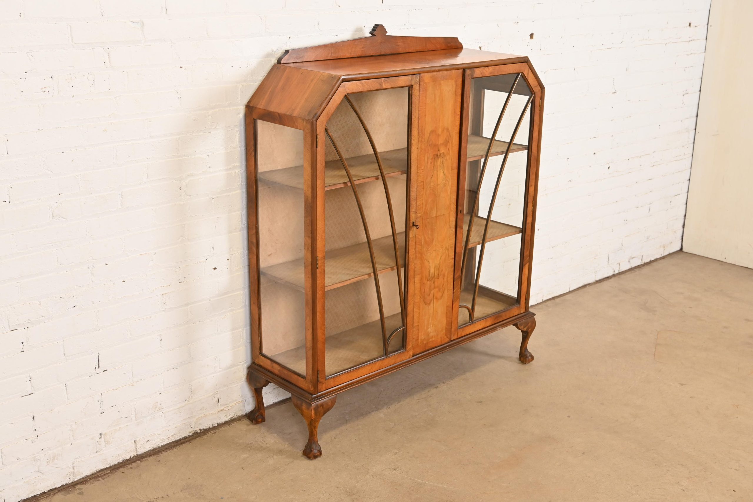 Gorgeous book-matched burled walnut, with glass front and sides, and carved ball and claw feet. Cabinet locks, and key is included.