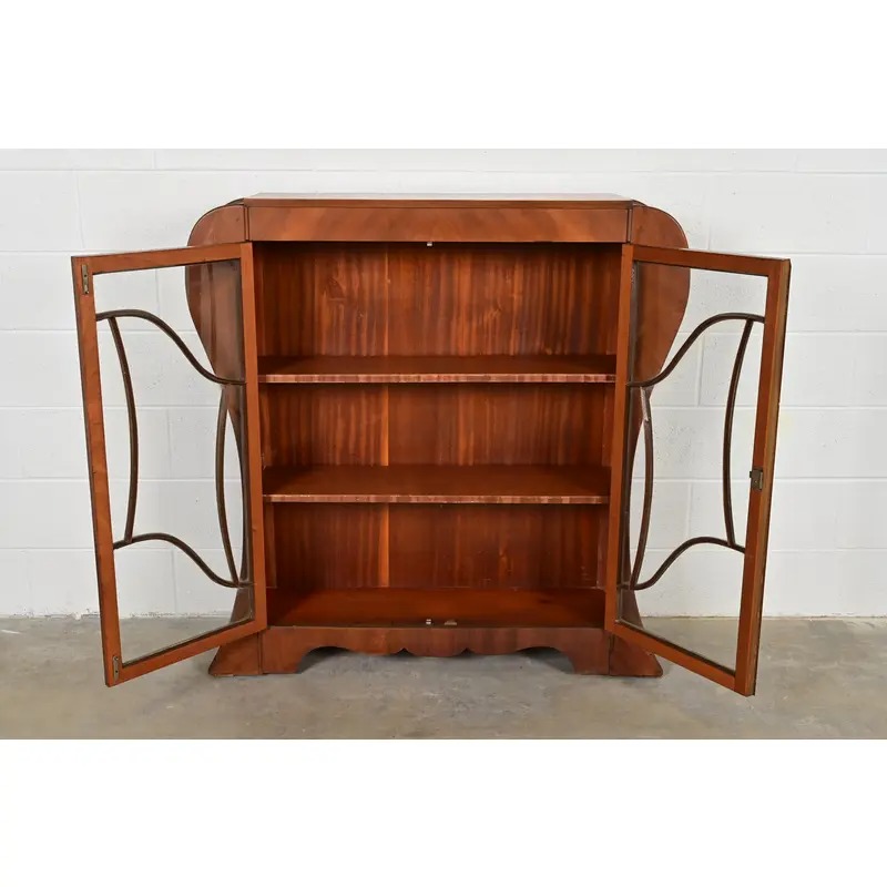 Walnut, with beautiful book-matched burled walnut top, and mullioned glass front doors.