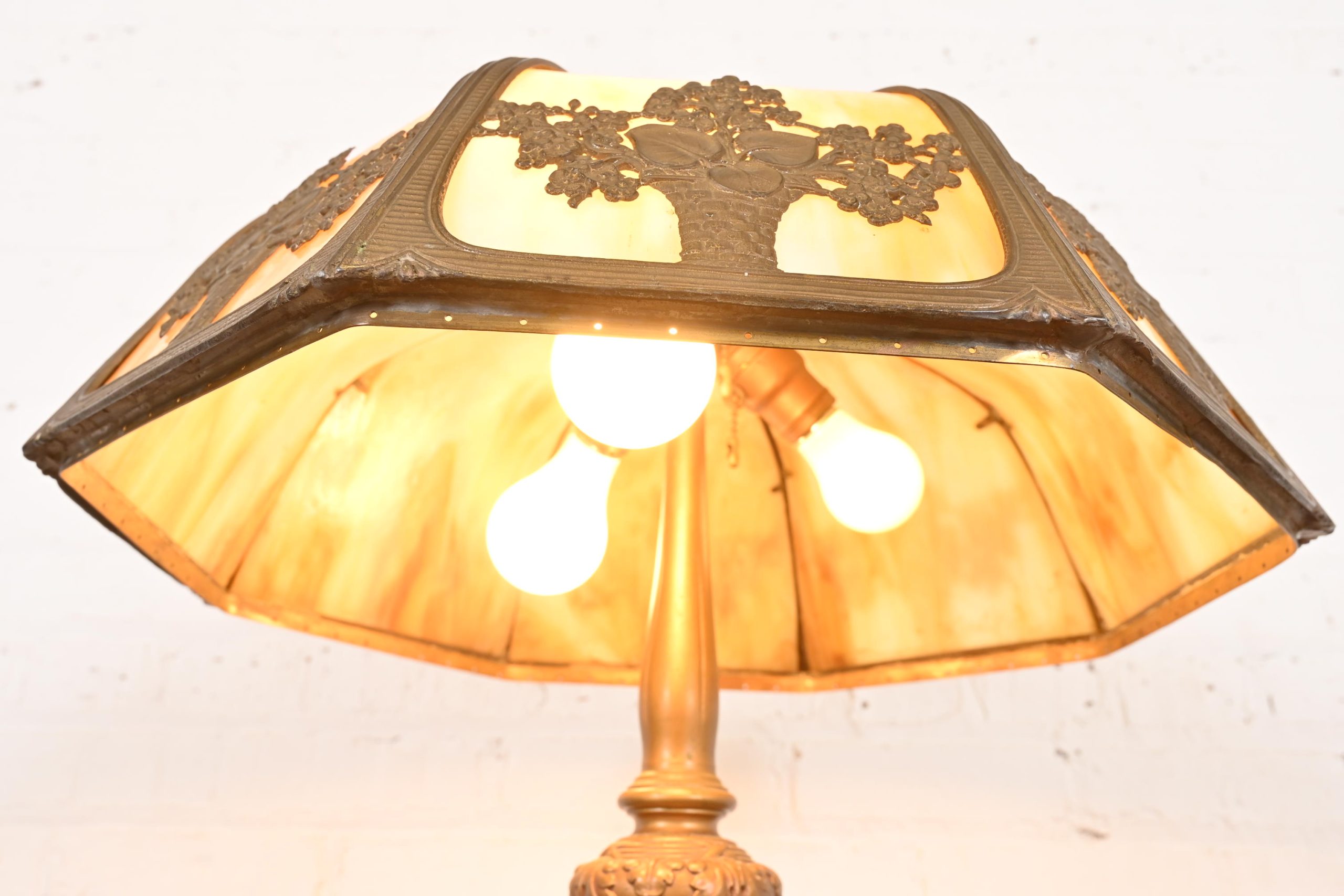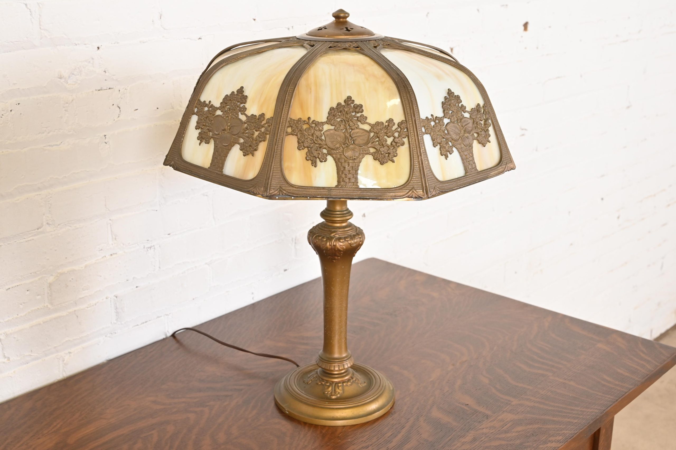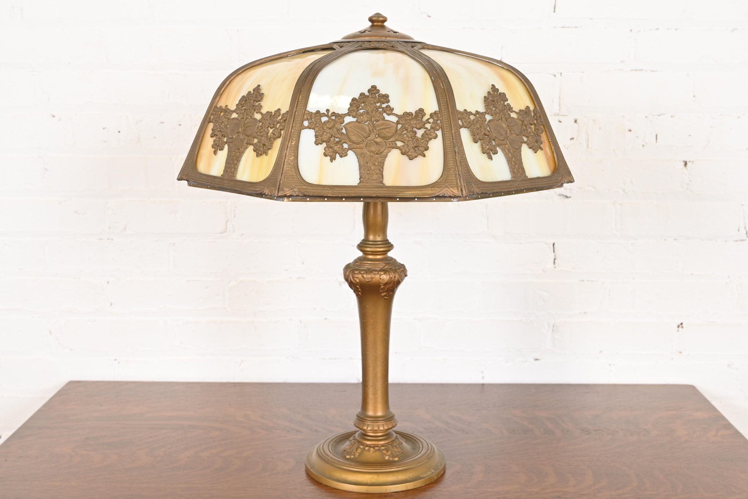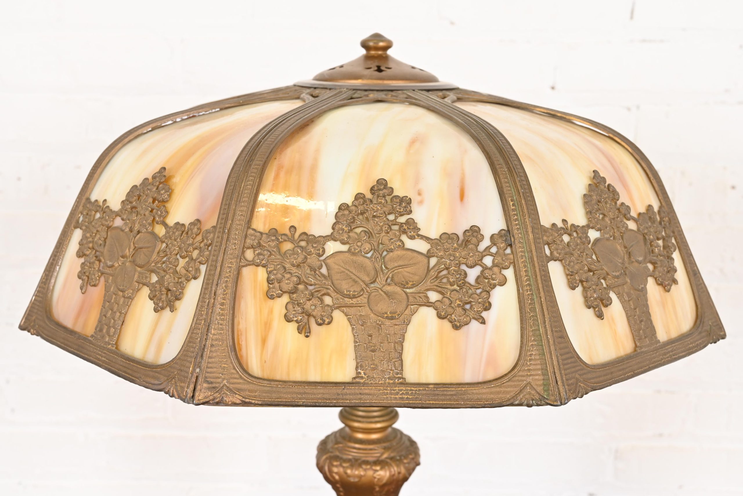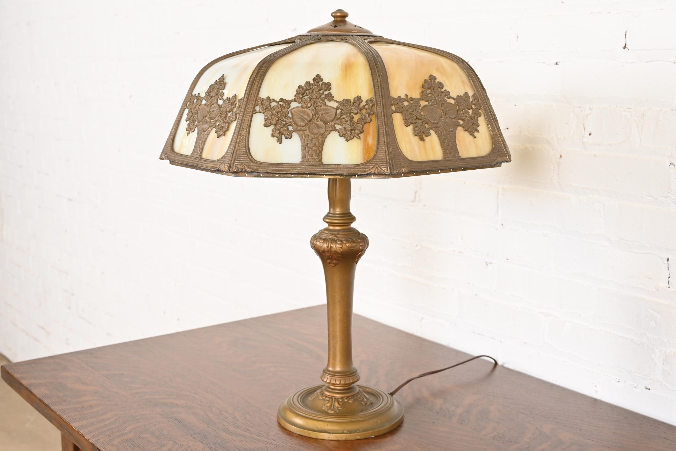 An exceptional antique Art Nouveau period table lamp with gorgeous eight-panel curved caramel slag glass shade