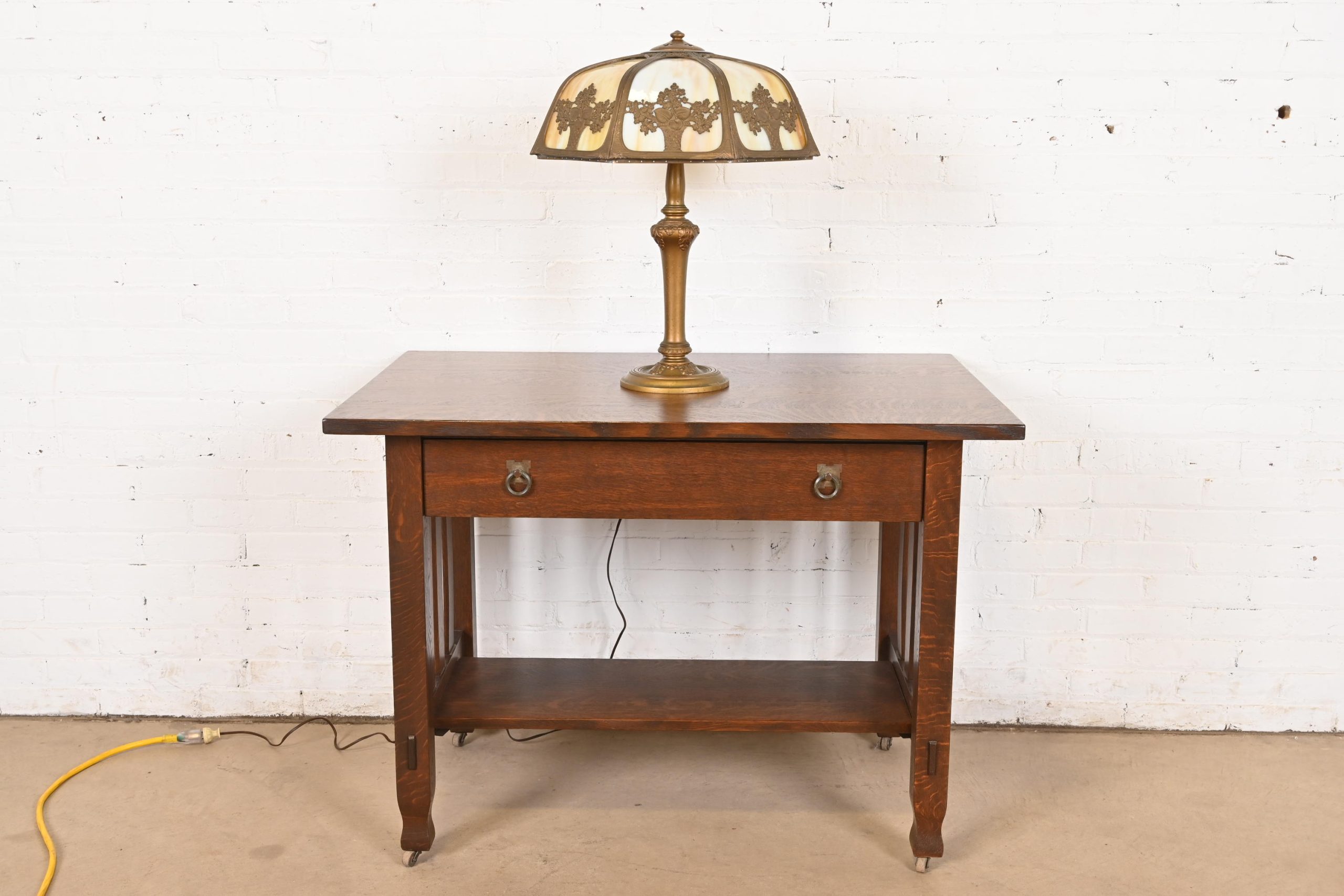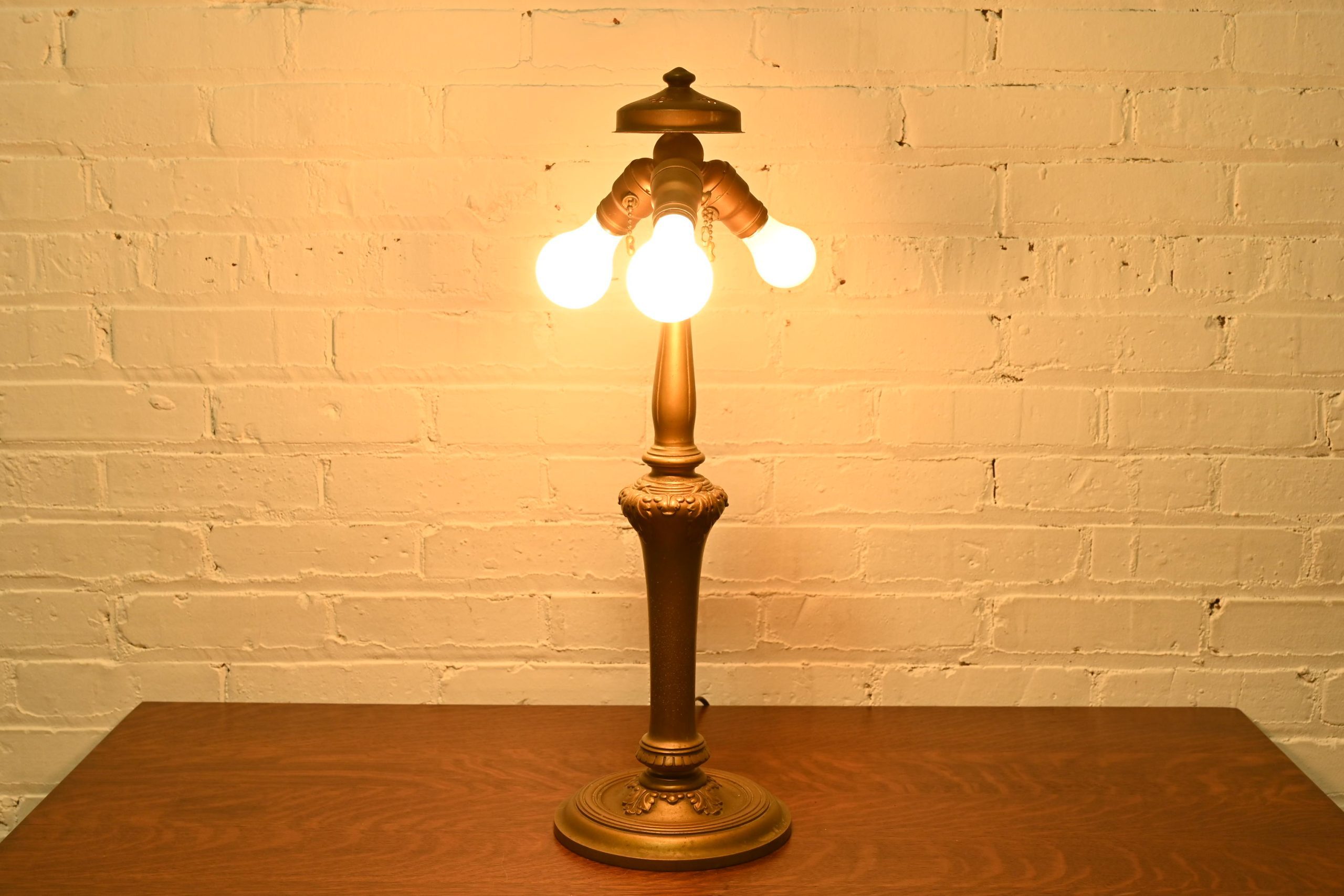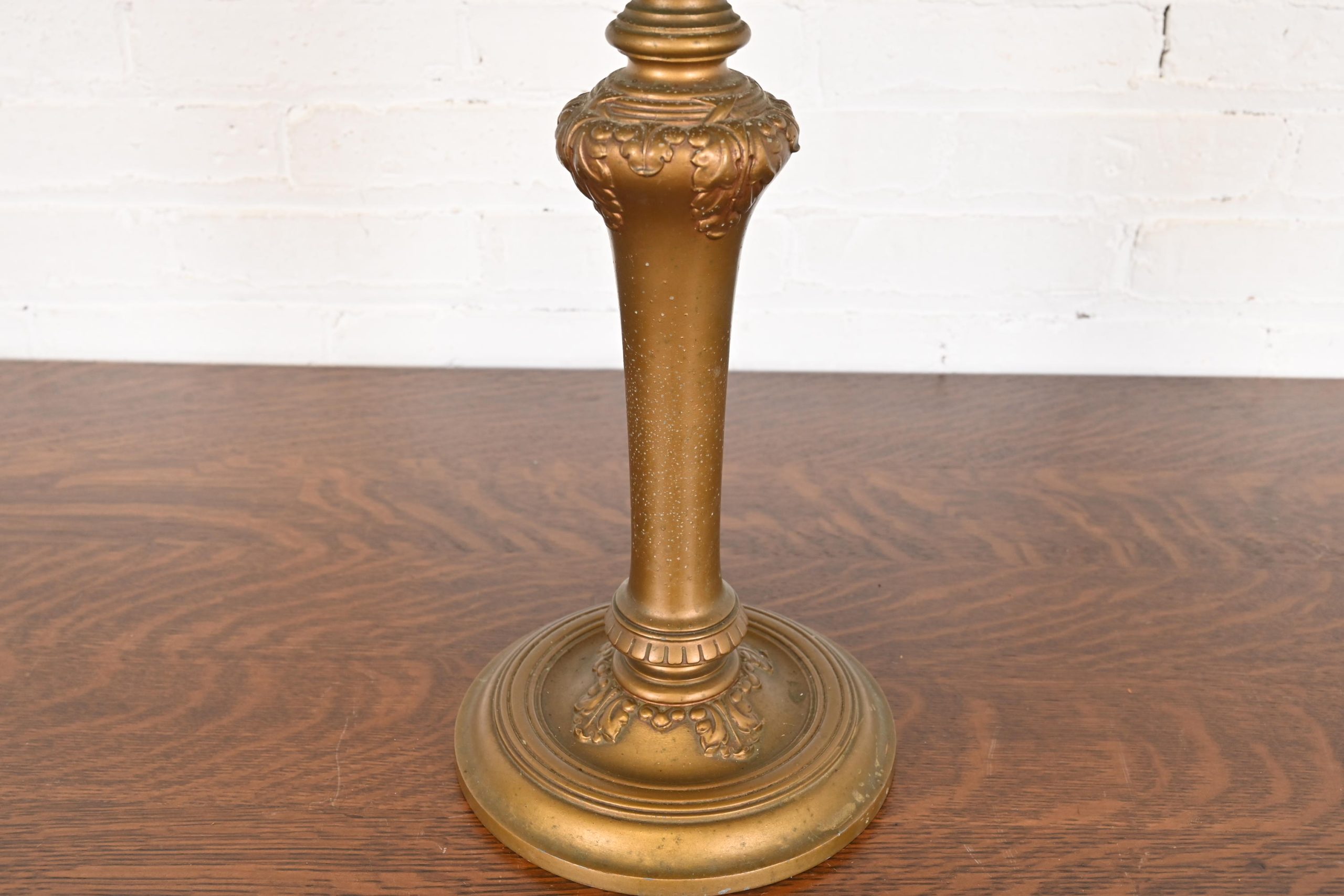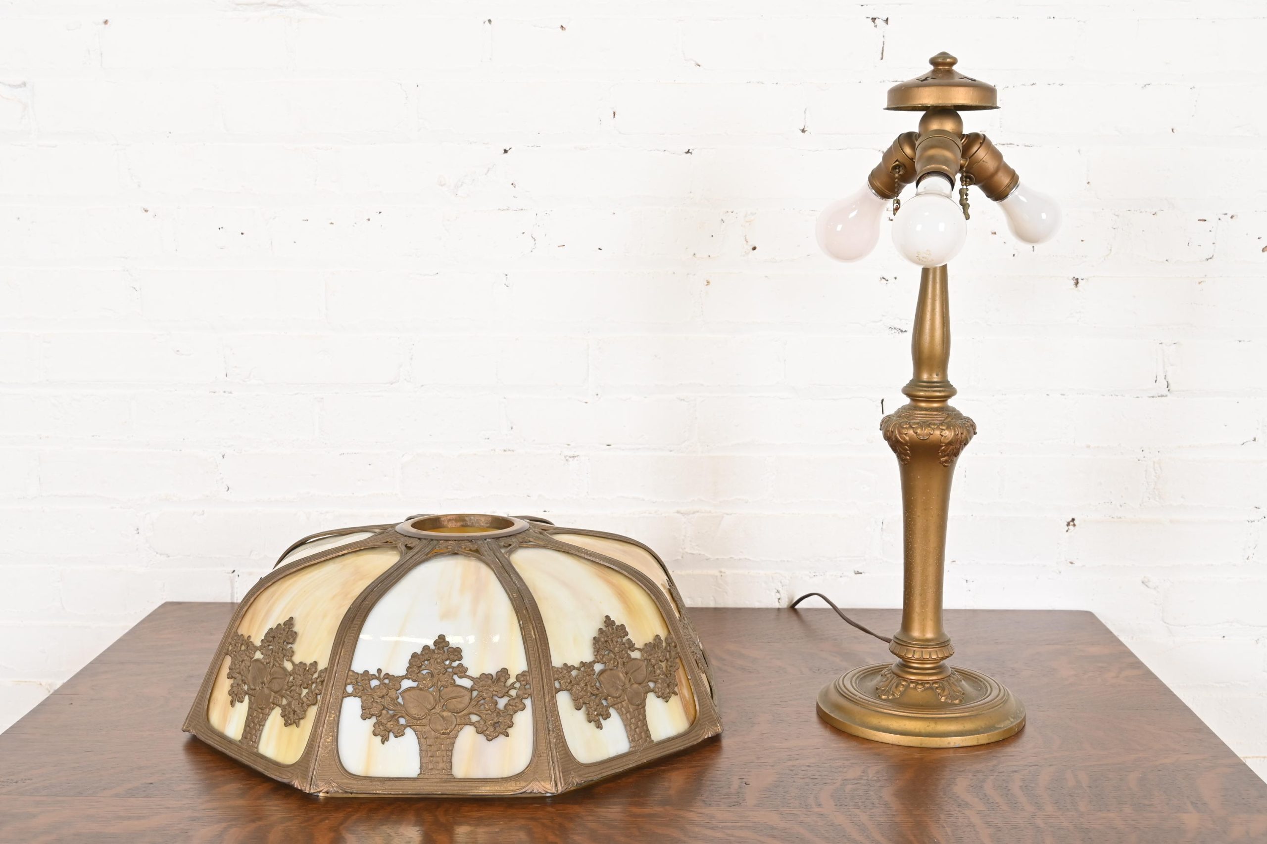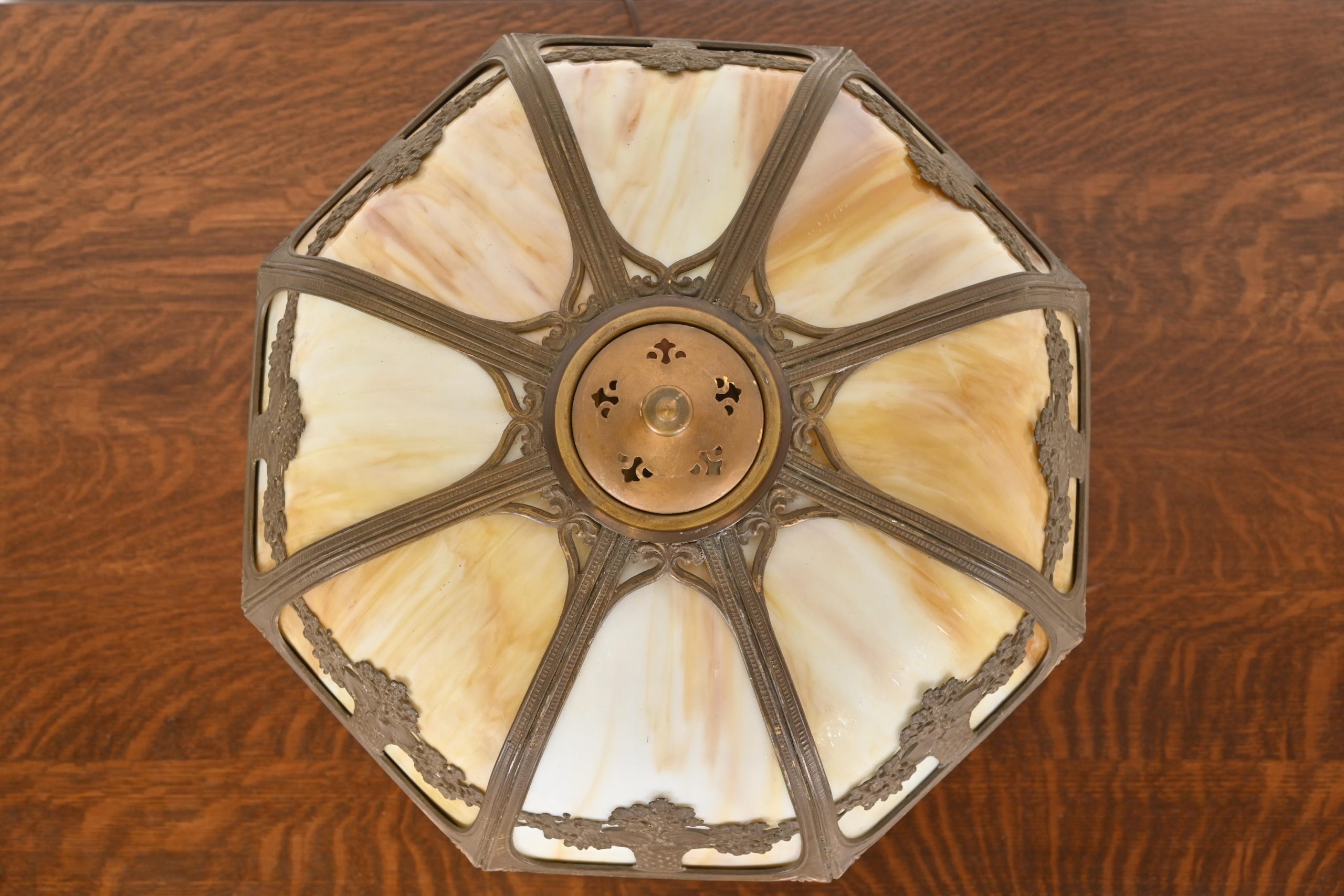 An exceptional antique Art Nouveau period table lamp with gorgeous eight-panel curved caramel slag glass shade