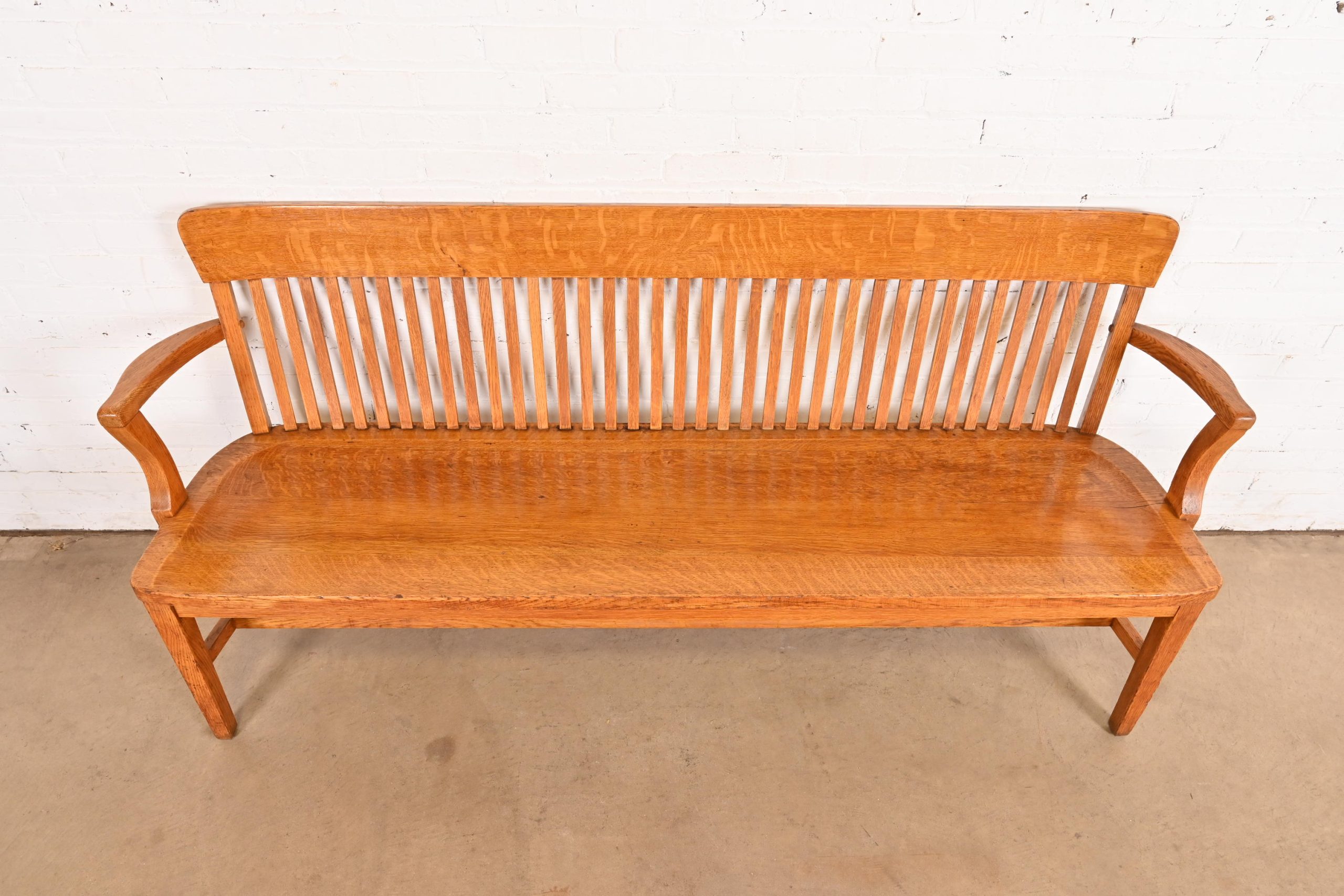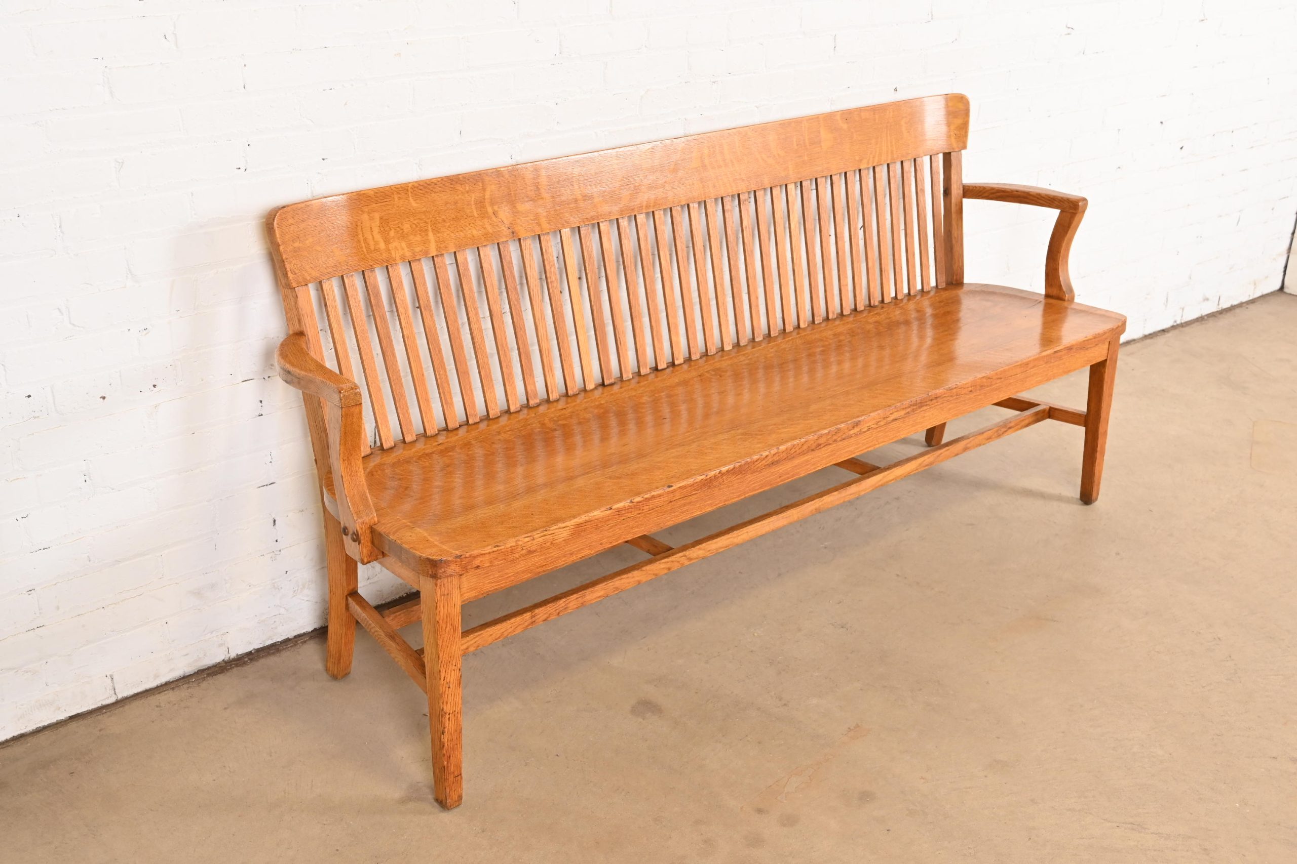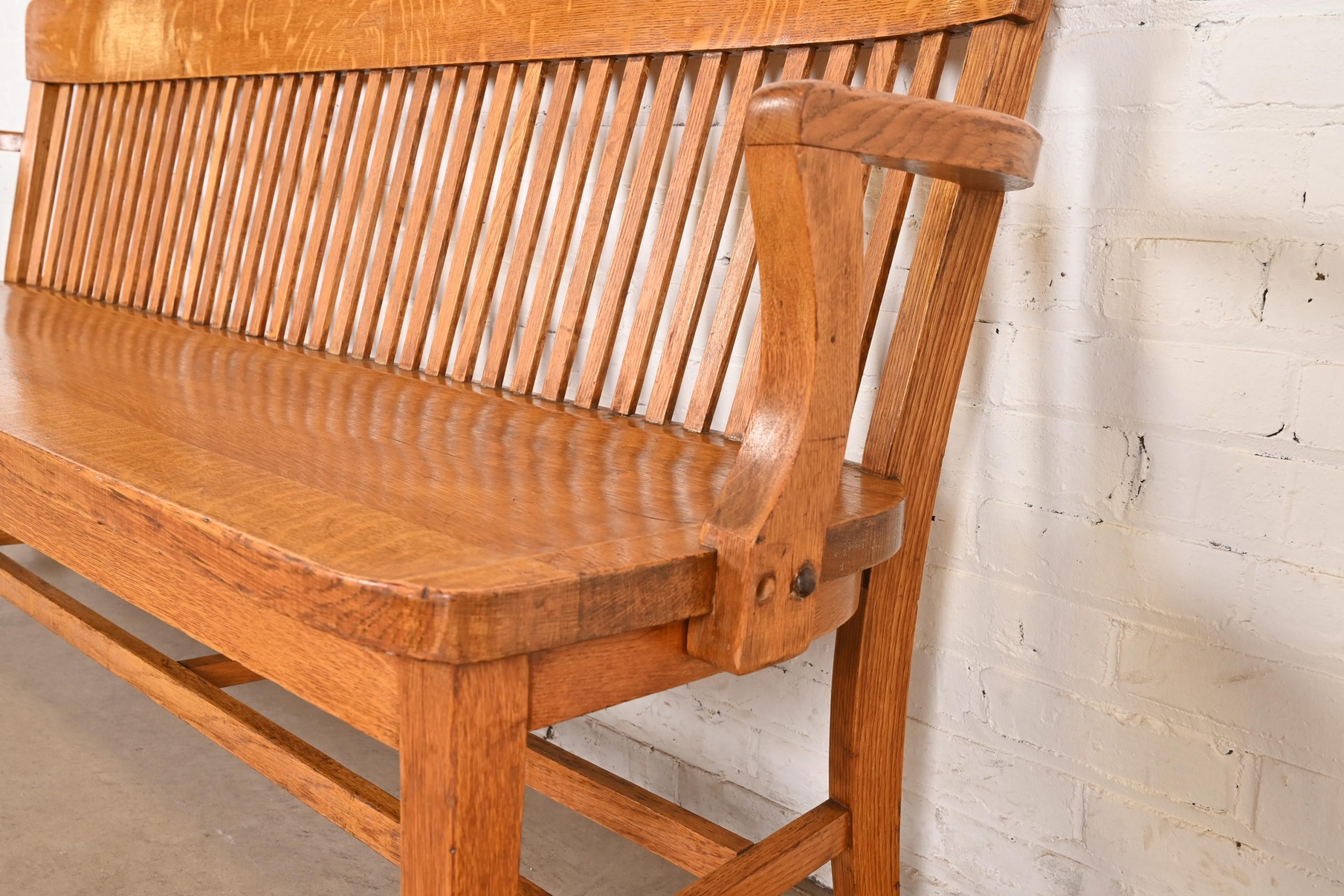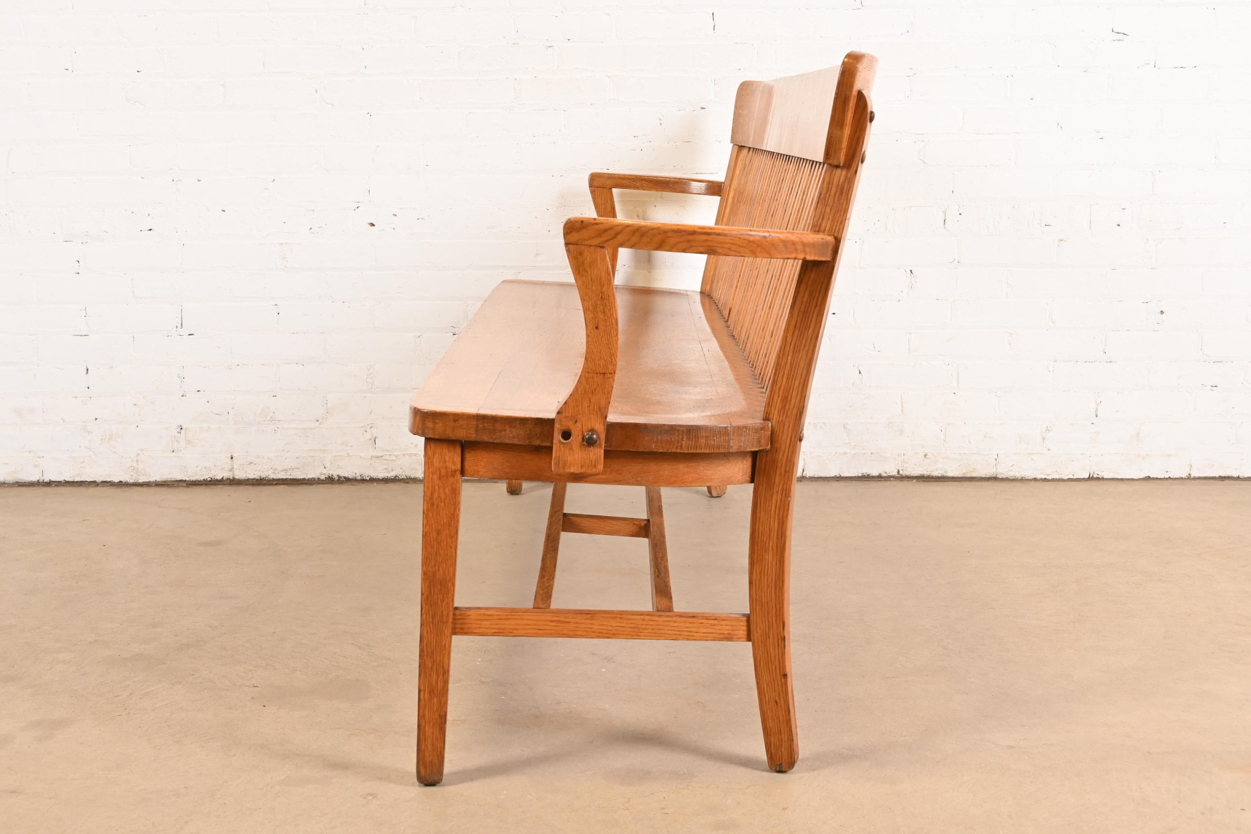 An exceptional antique Arts & Crafts solid oak spindle back banker or lawyer bench