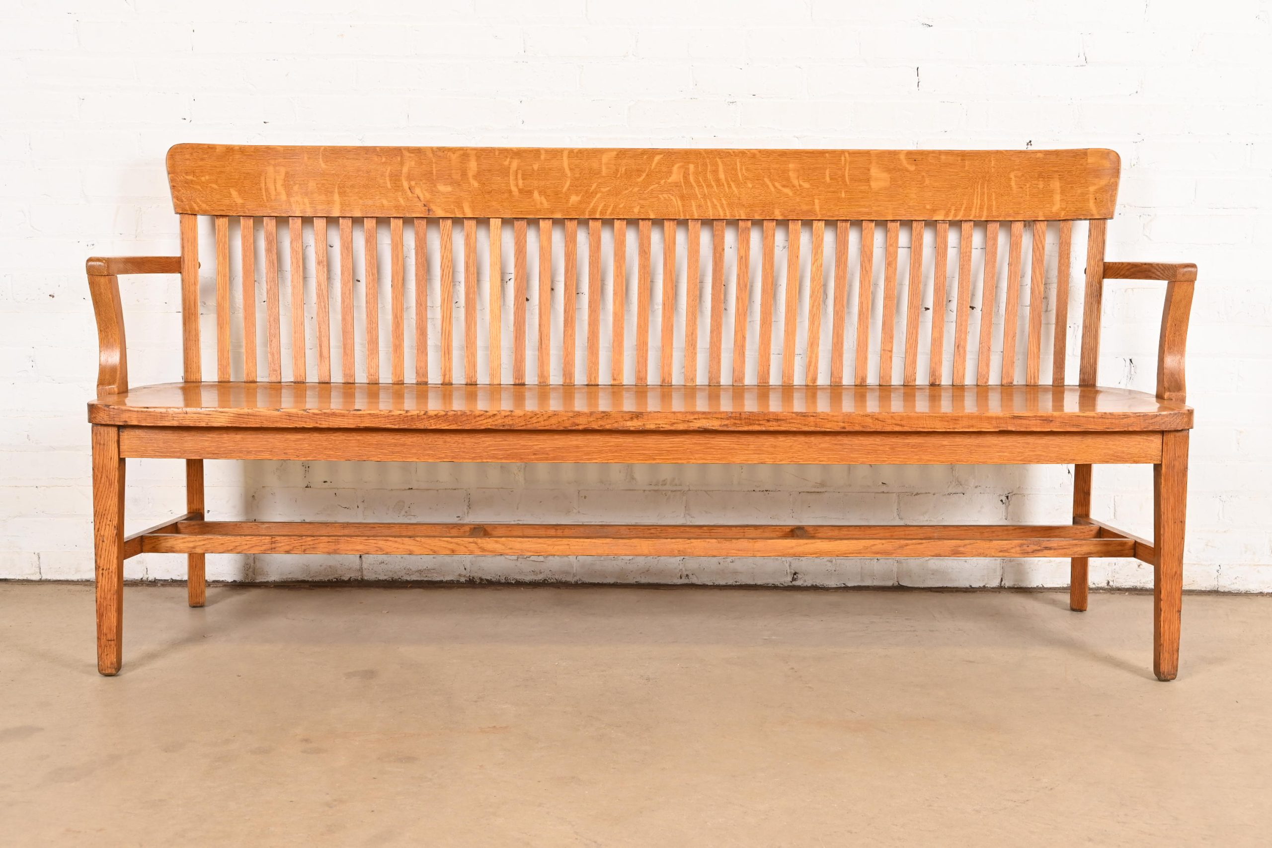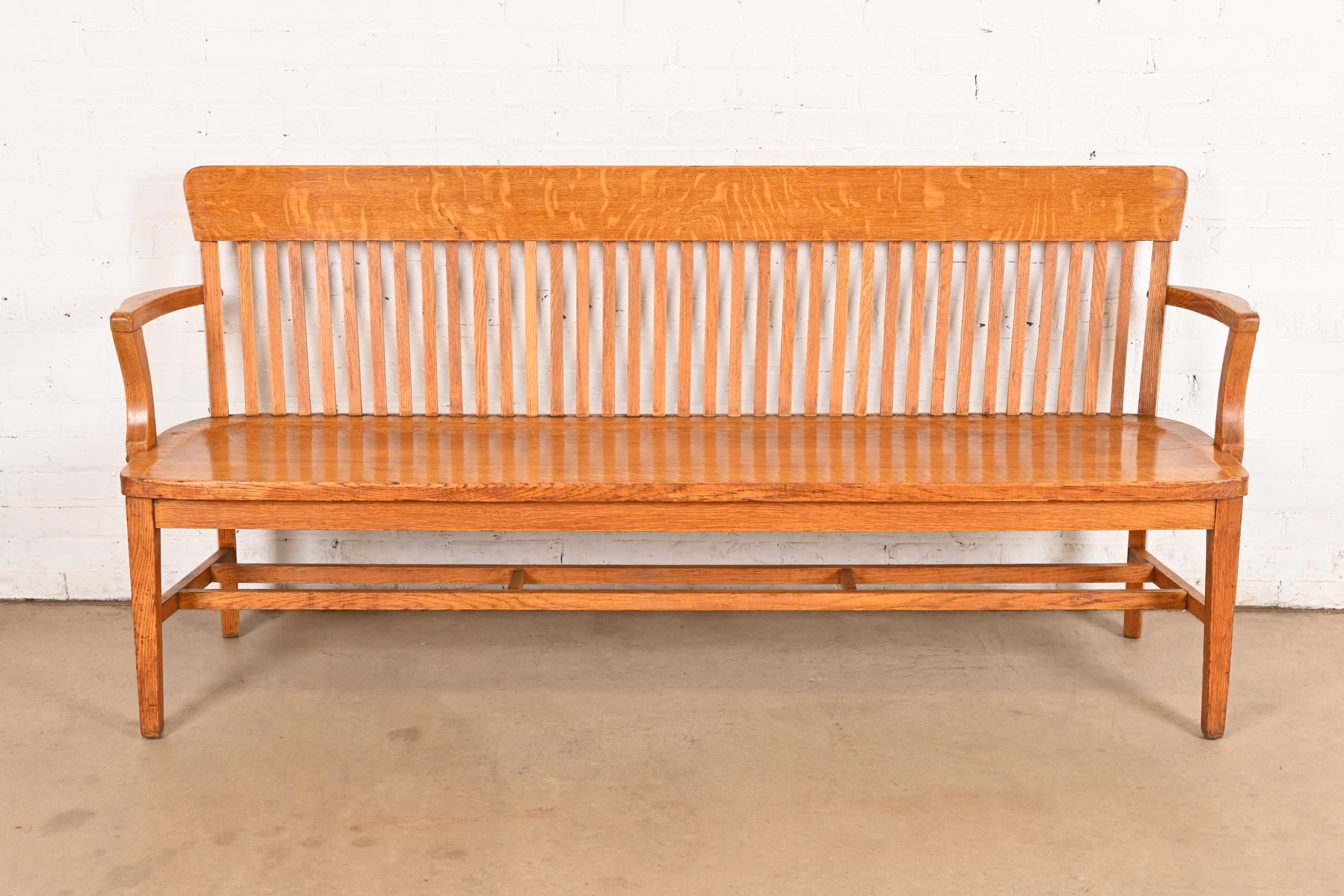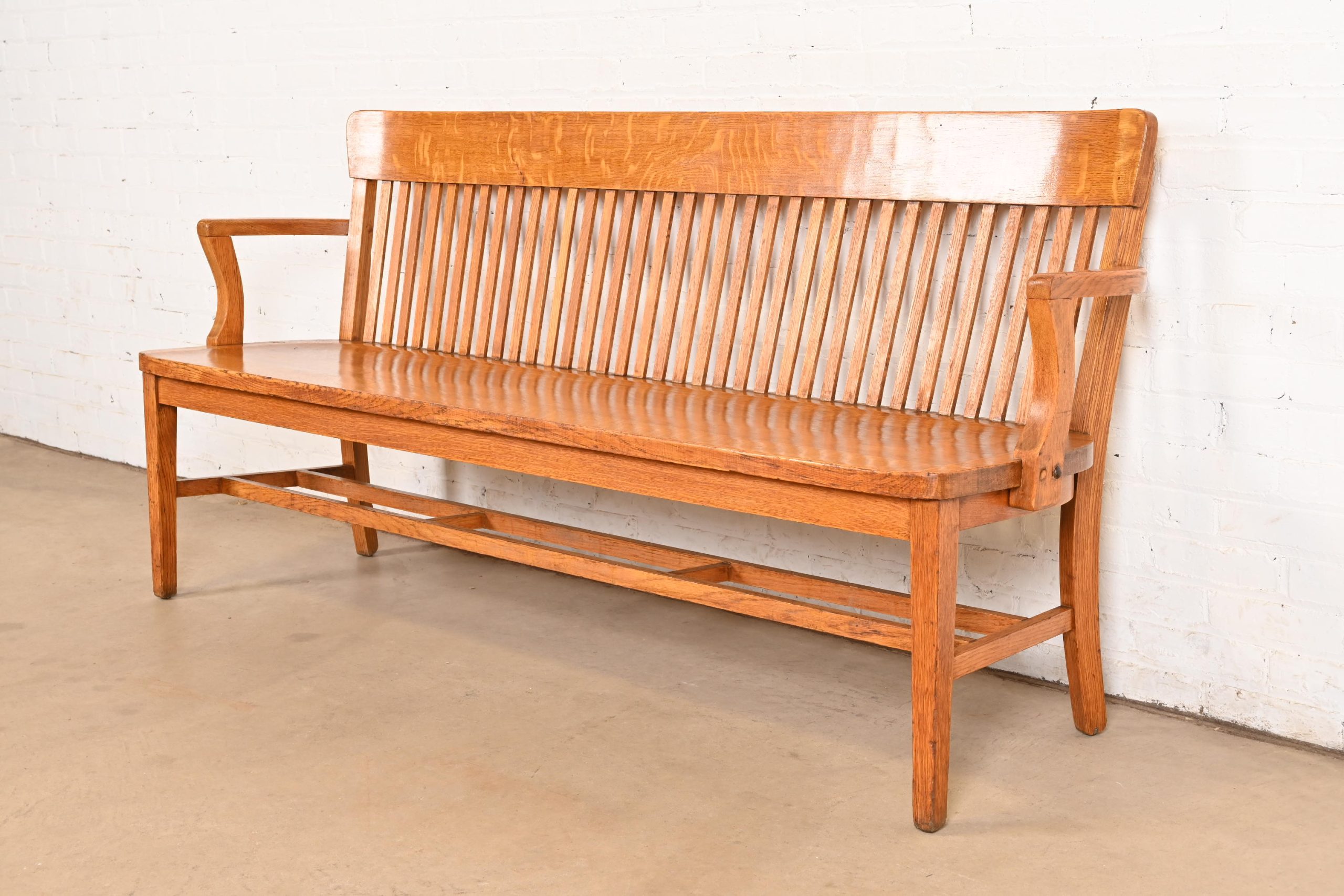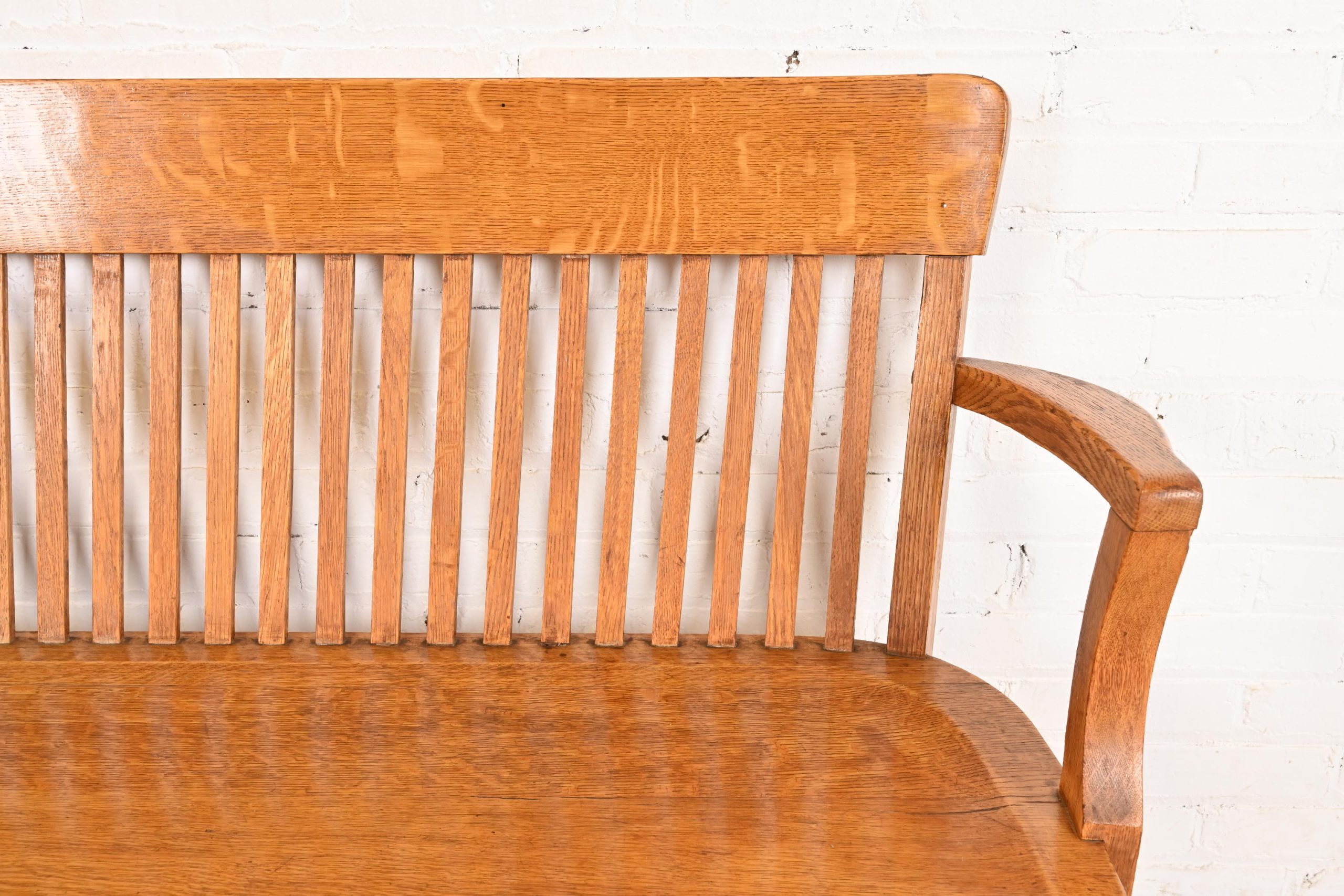 An exceptional antique Arts & Crafts solid oak spindle back banker or lawyer bench