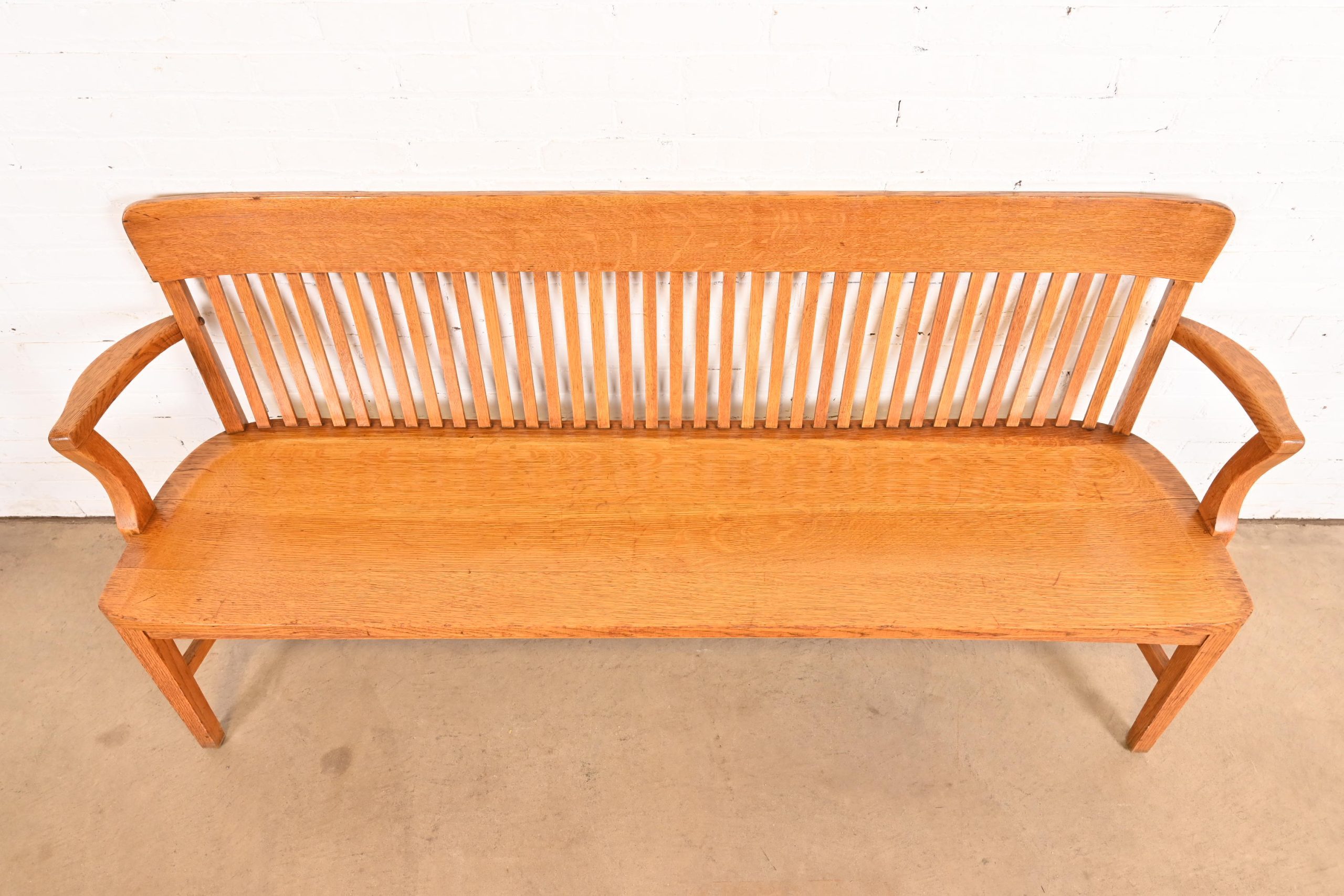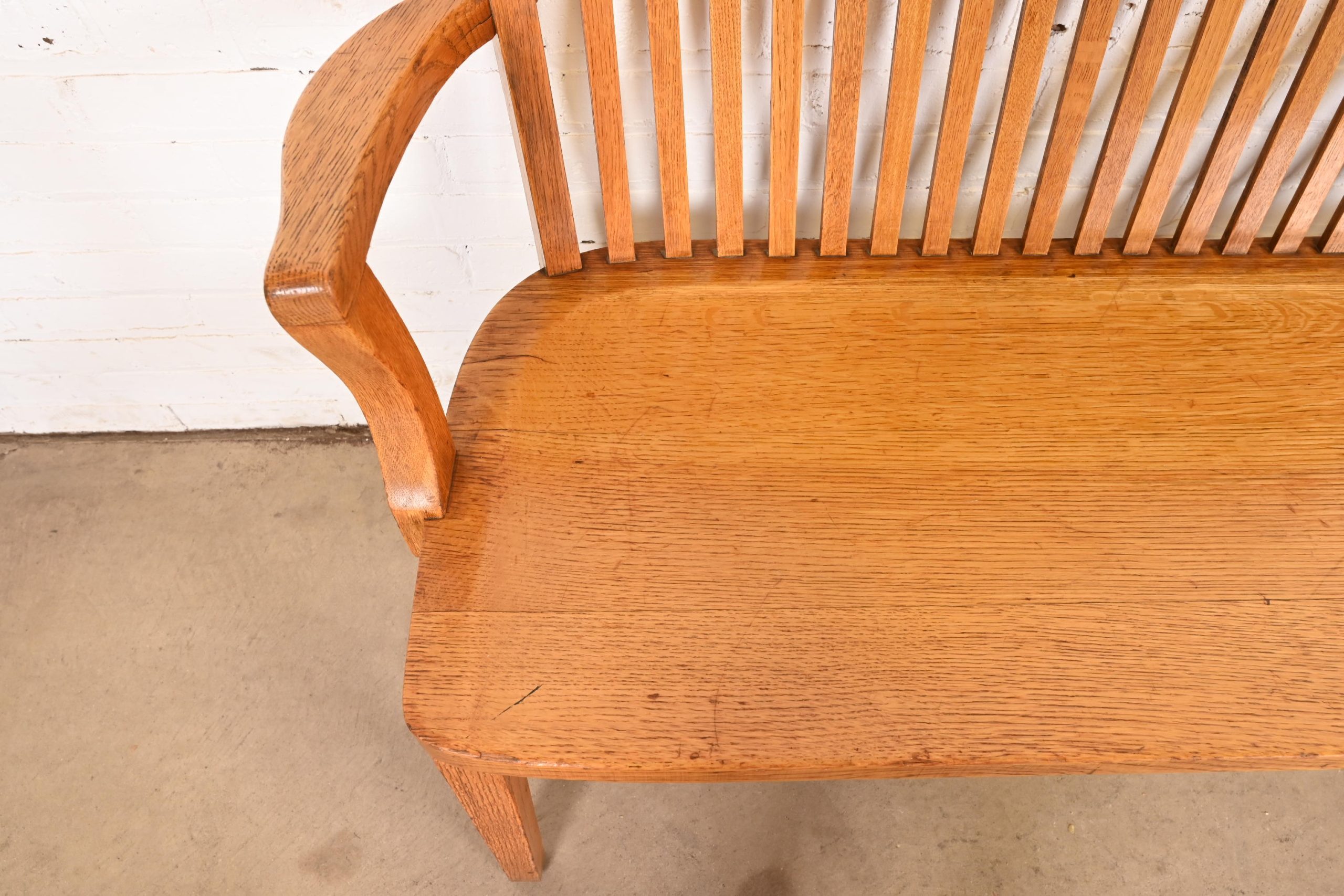 An exceptional antique Arts & Crafts solid oak spindle back banker or lawyer bench