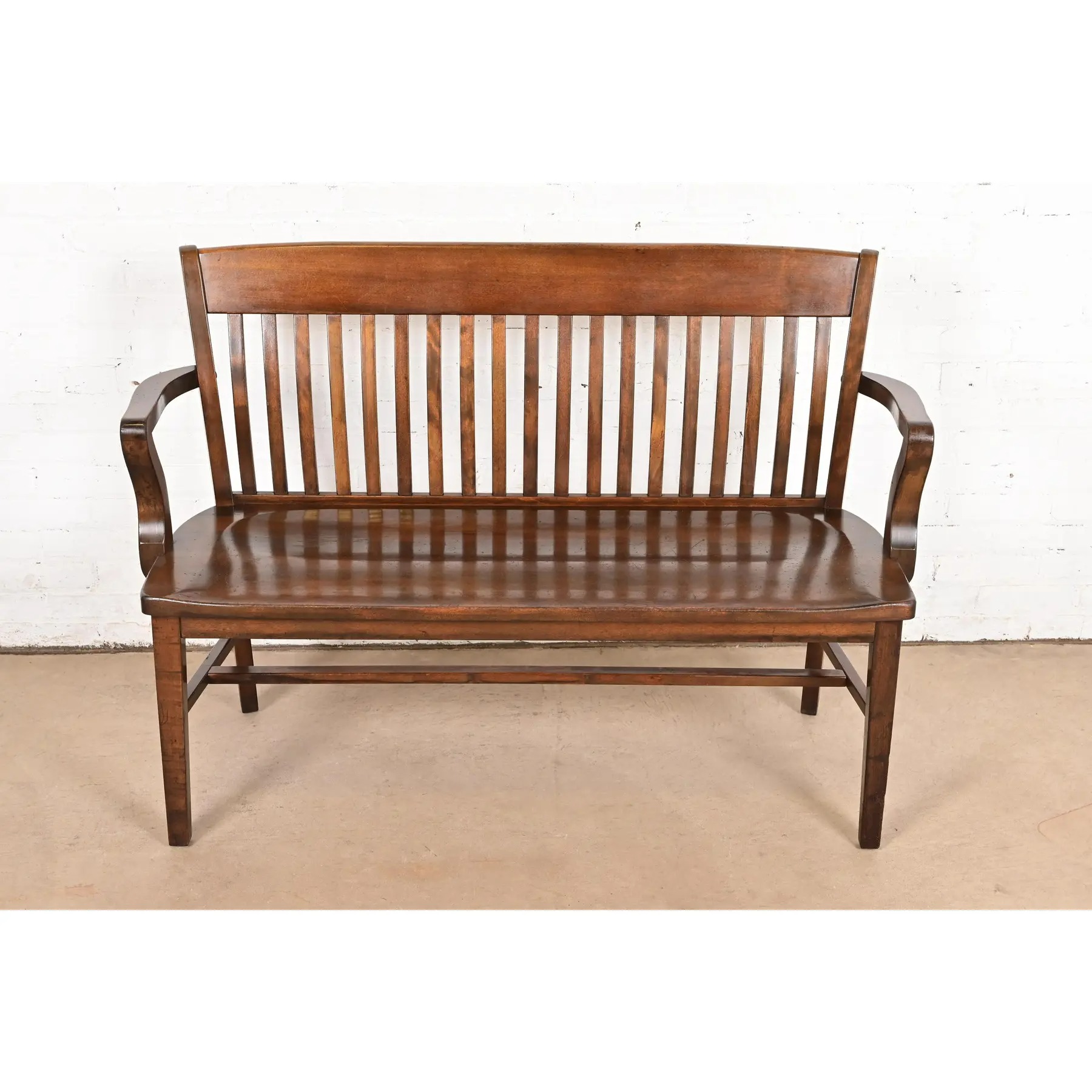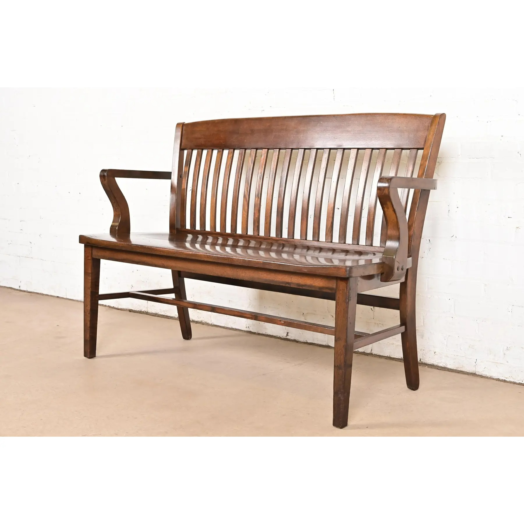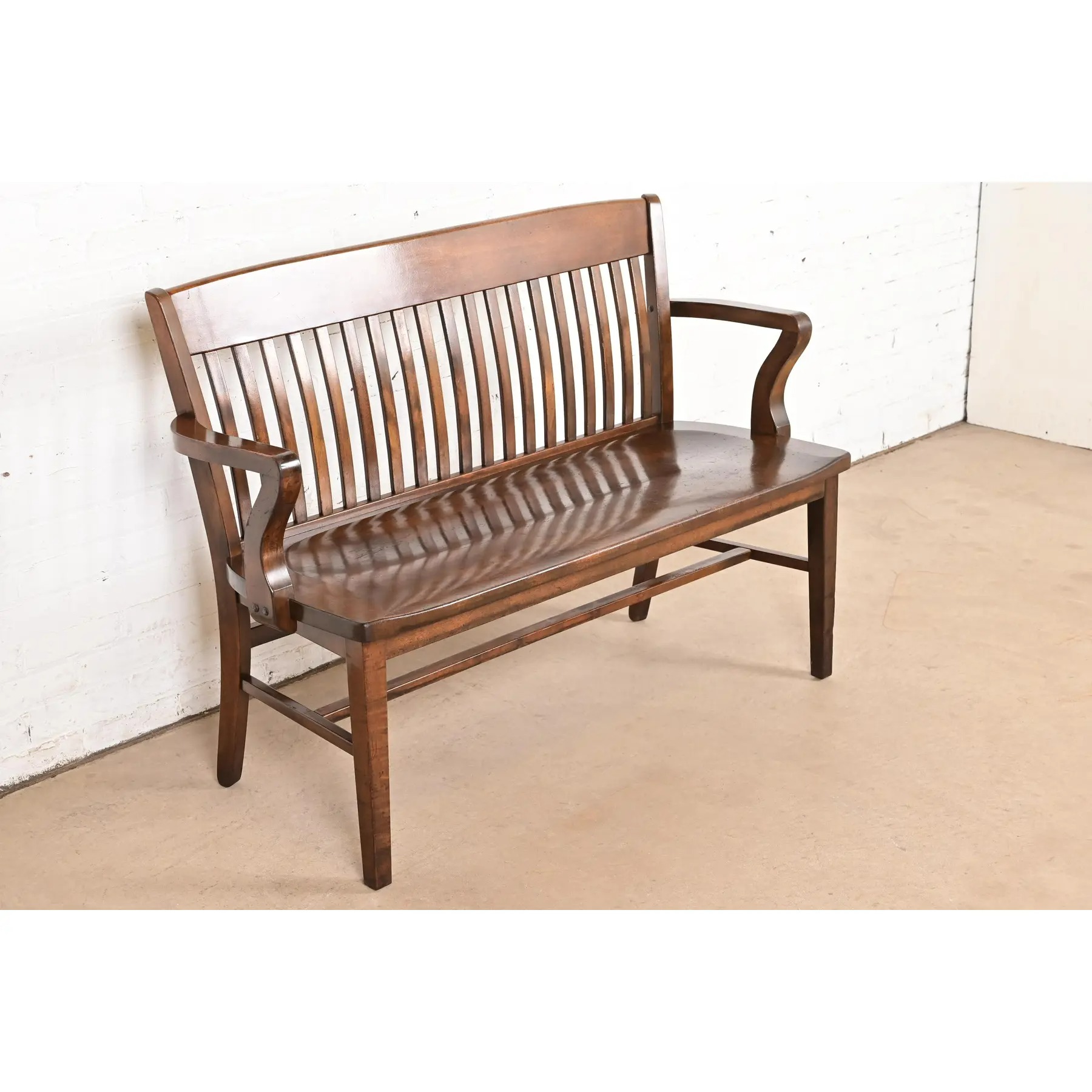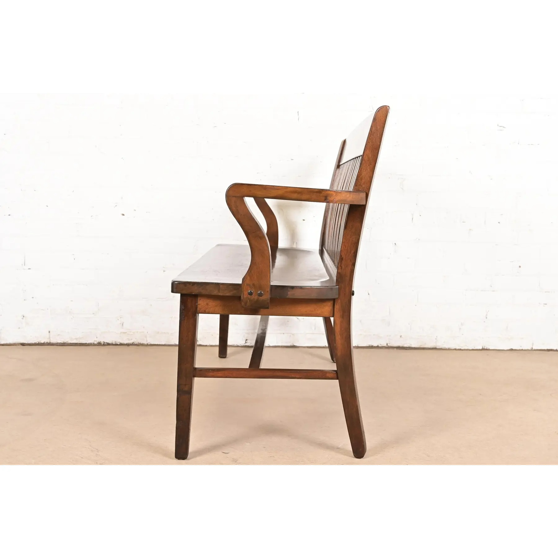 An exceptional antique Arts & Crafts solid walnut spindle back banker or lawyer bench
