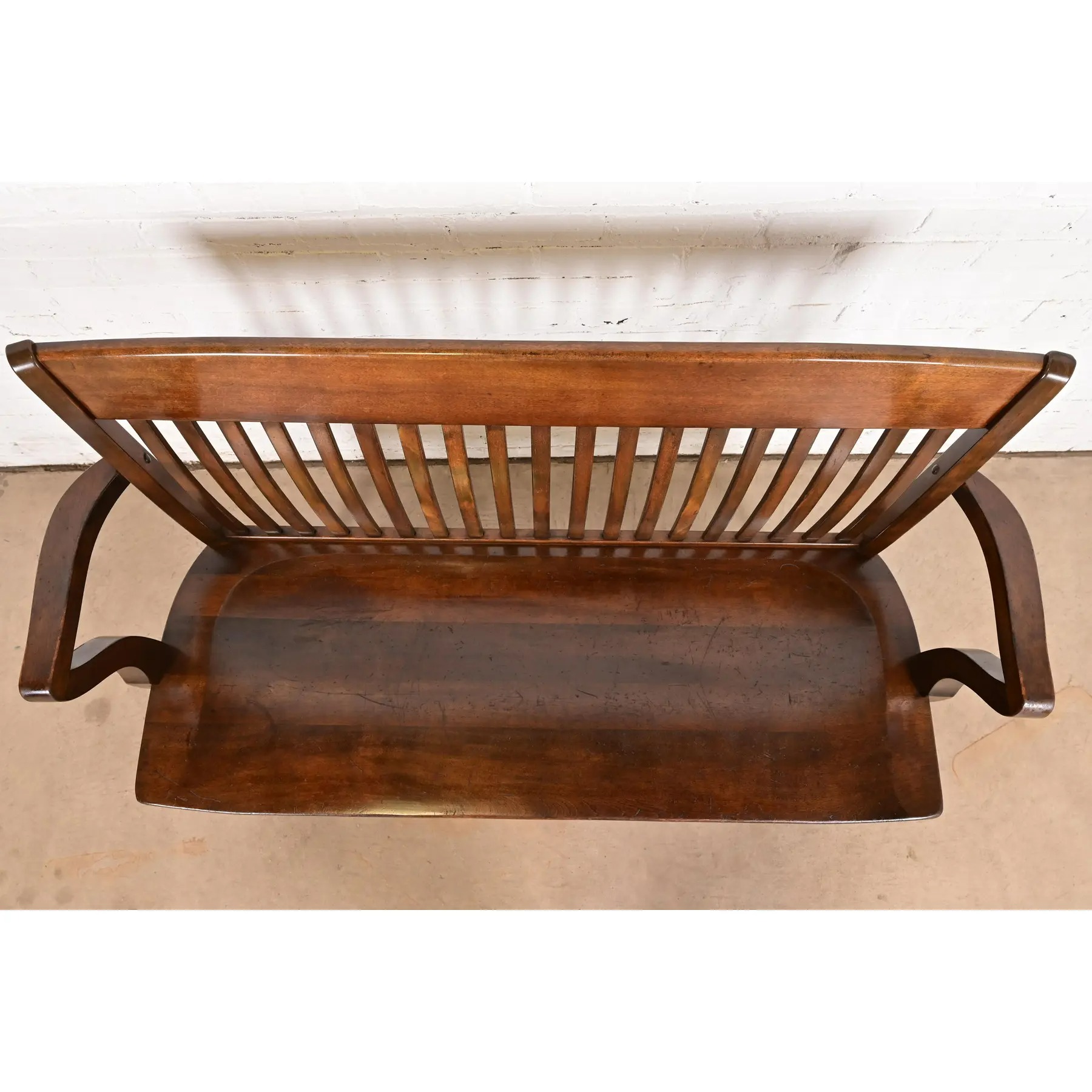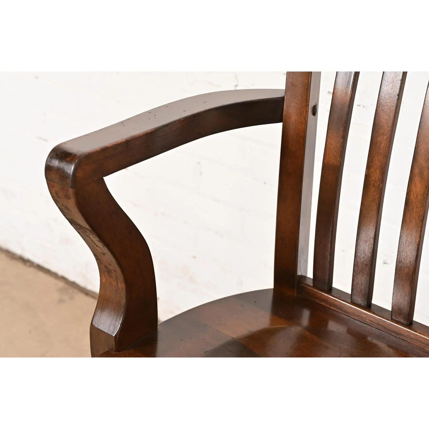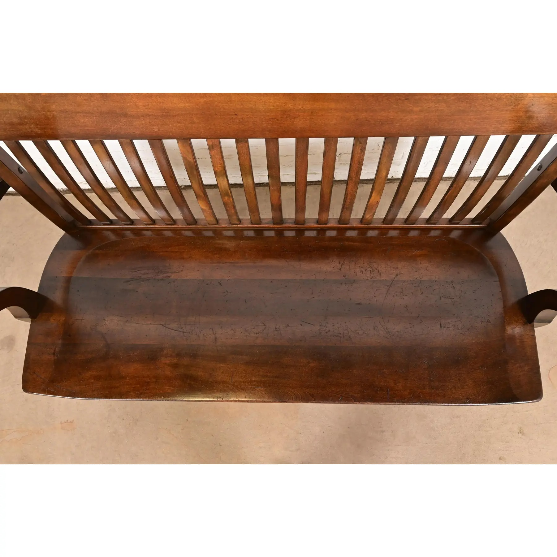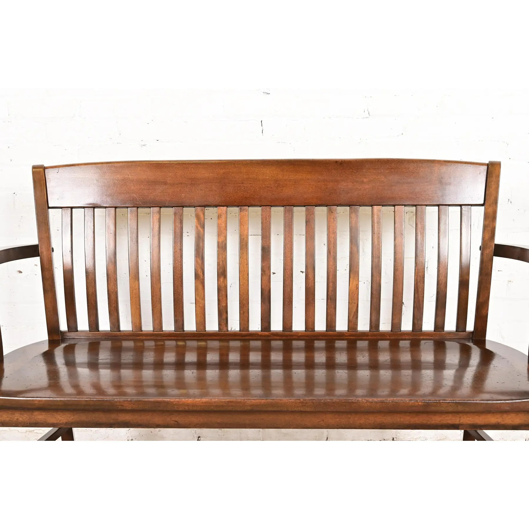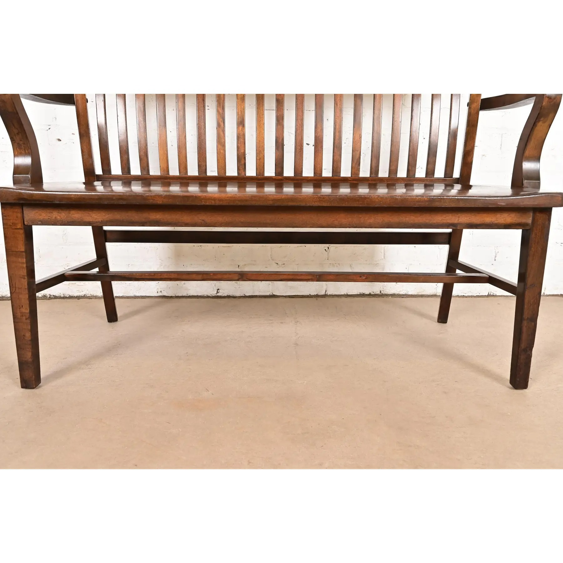 An exceptional antique Arts & Crafts solid walnut spindle back banker or lawyer bench