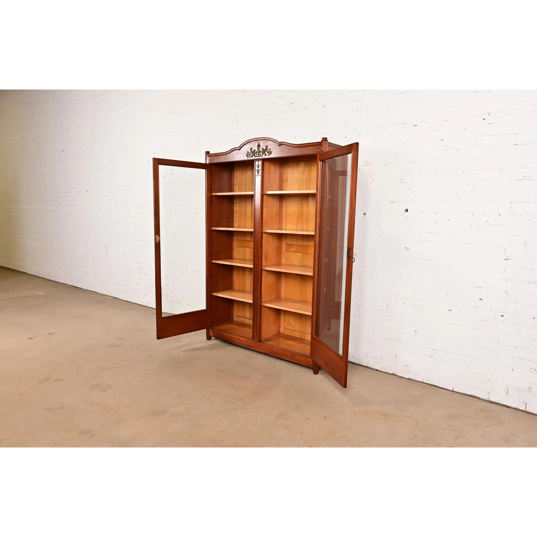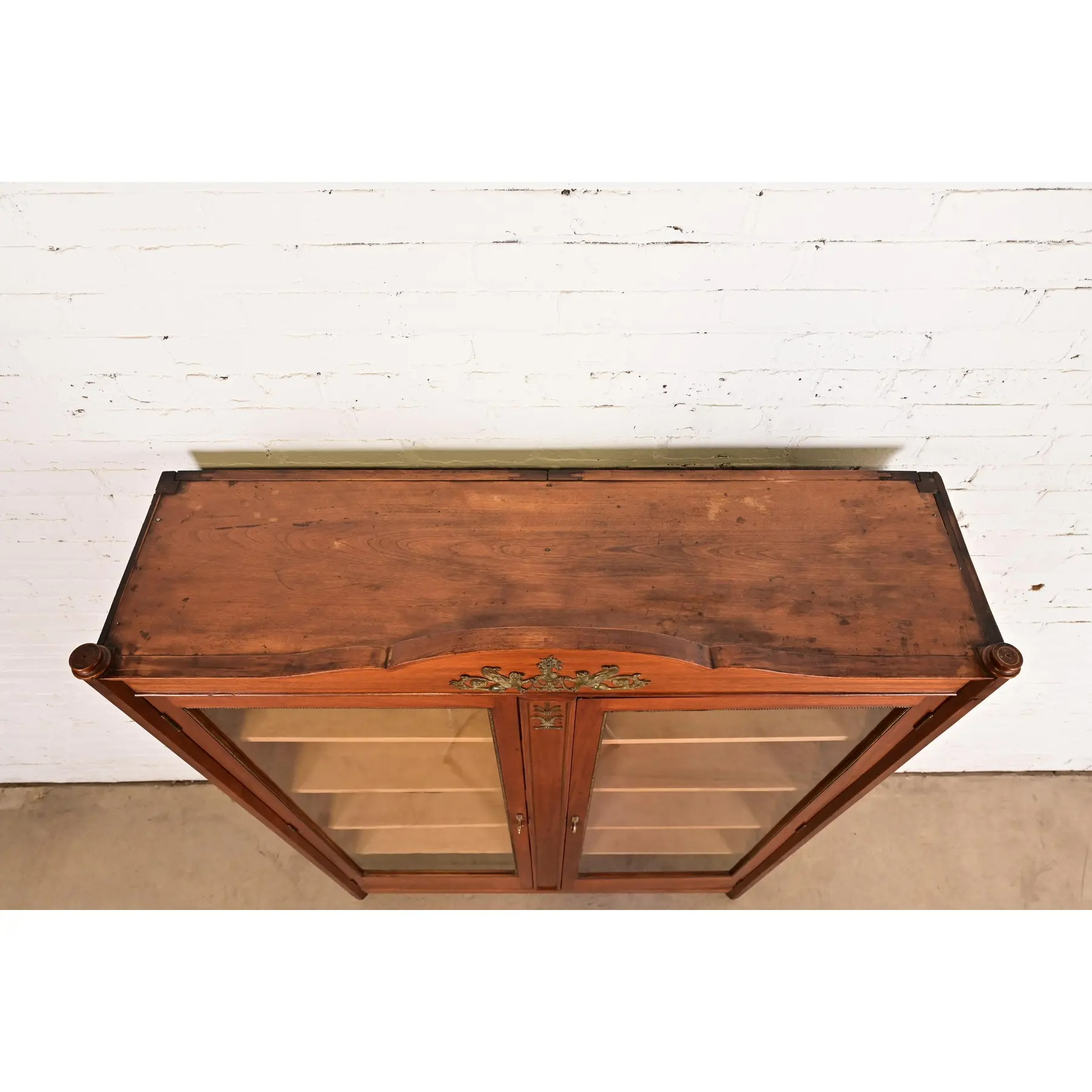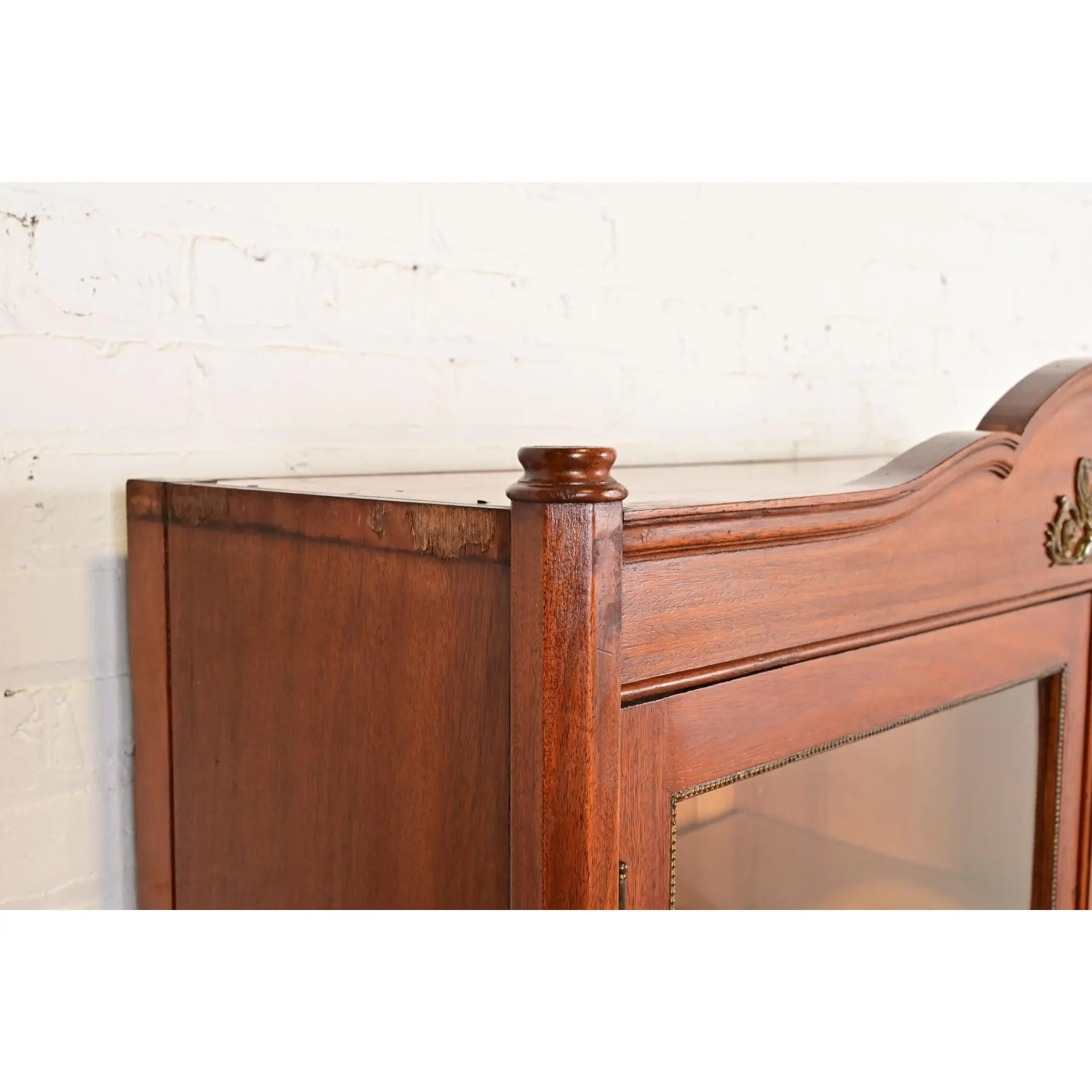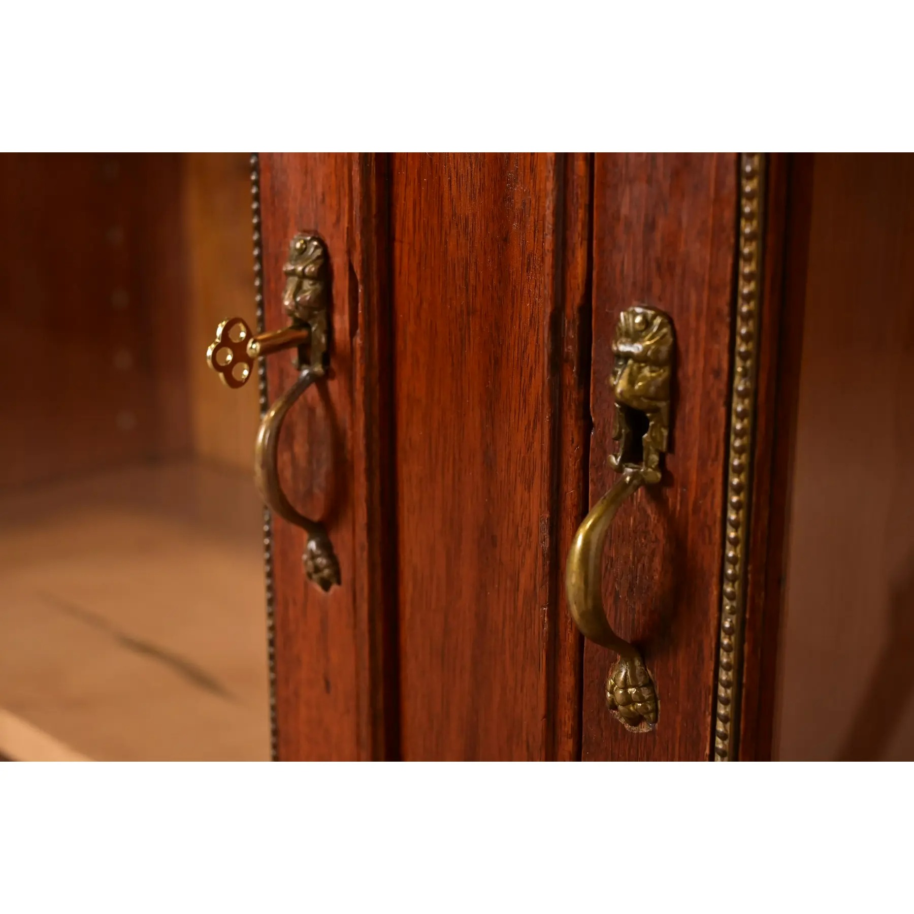 Carved mahogany, with glass front doors, mounted brass ormolu and hardware.
