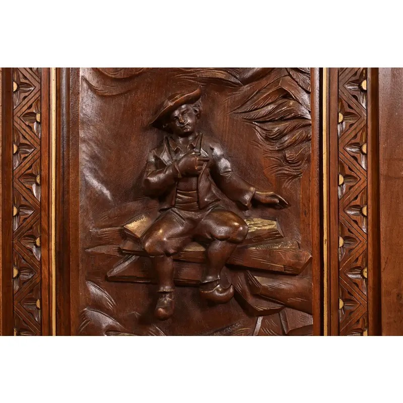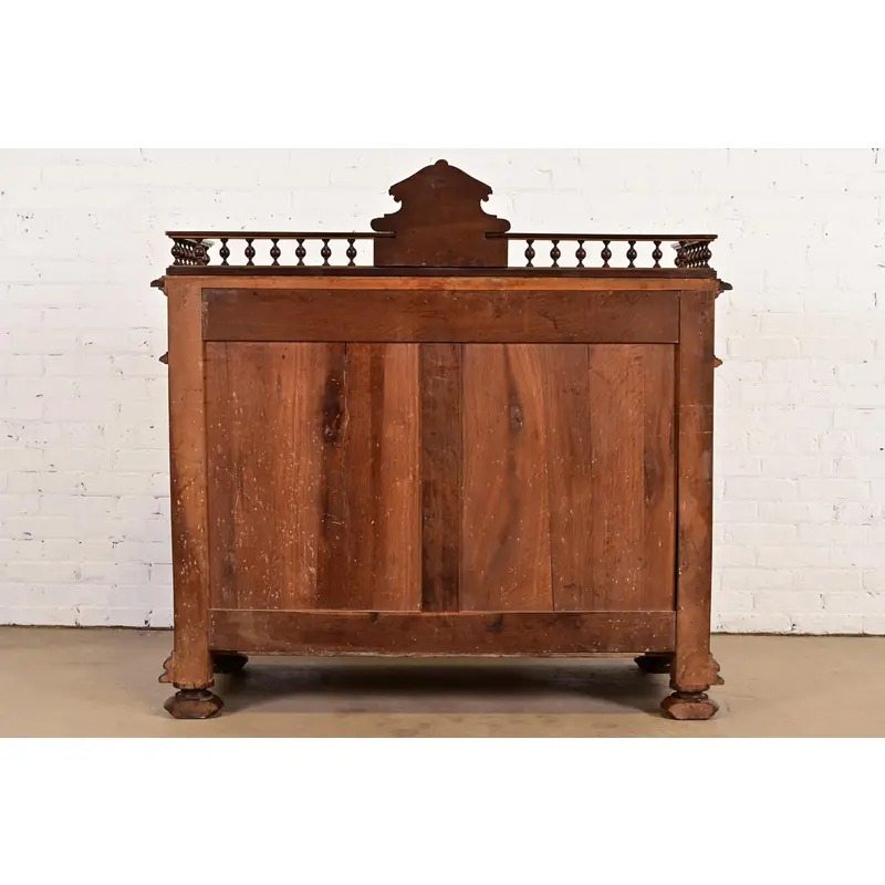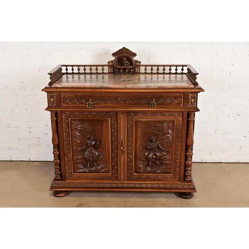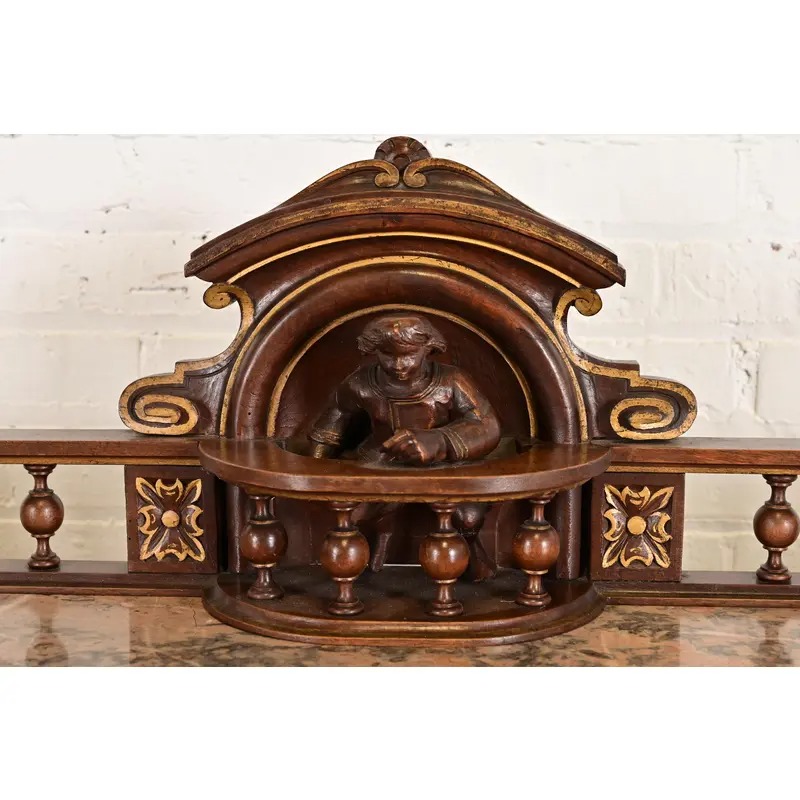 Ornate carved walnut, with gold gilt details, marble top, carved figures, and original brass hardware.