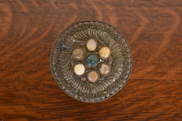 A gorgeous antique Tibetan bronze filigree and inlaid agate trinket jar