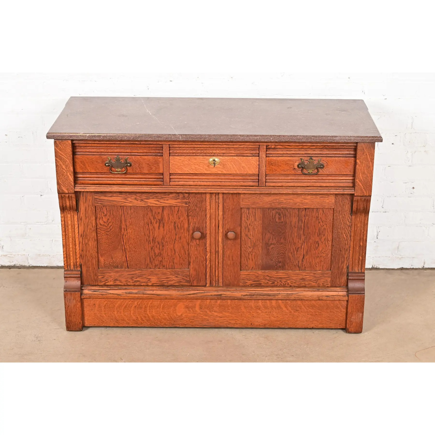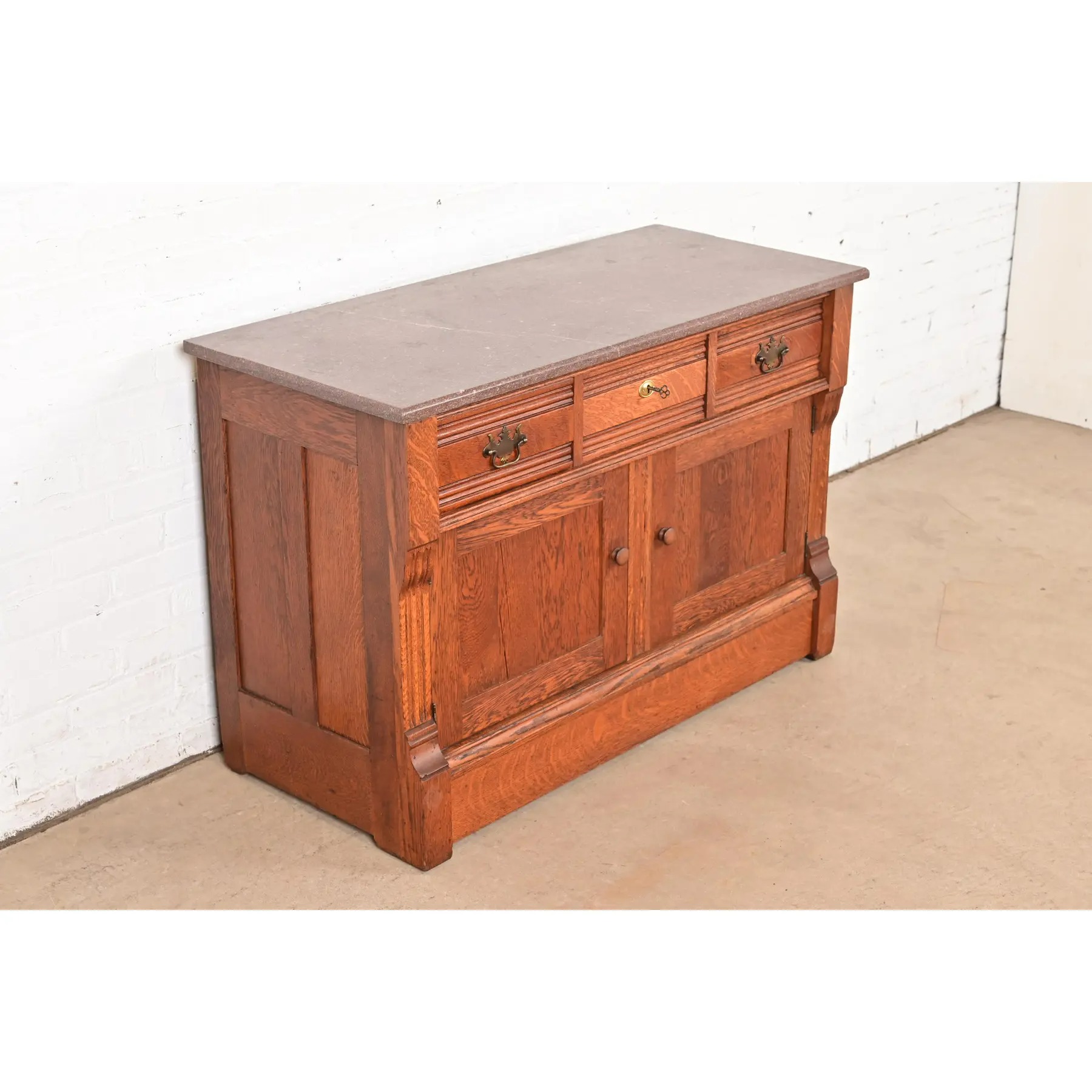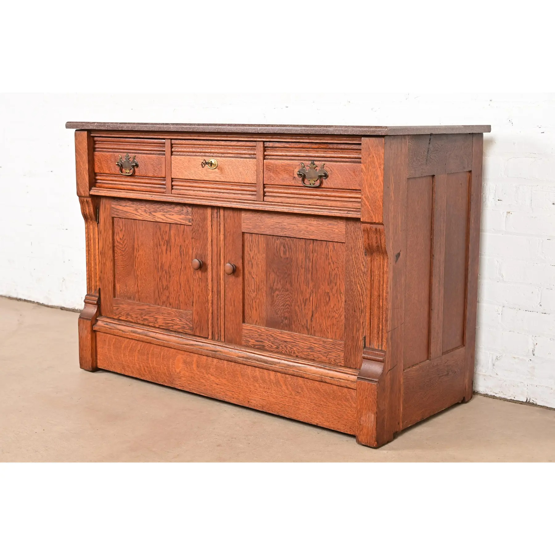 Beautiful quarter sawn oak, with marble top and brass hardware. Top middle drawer locks, and key is included.