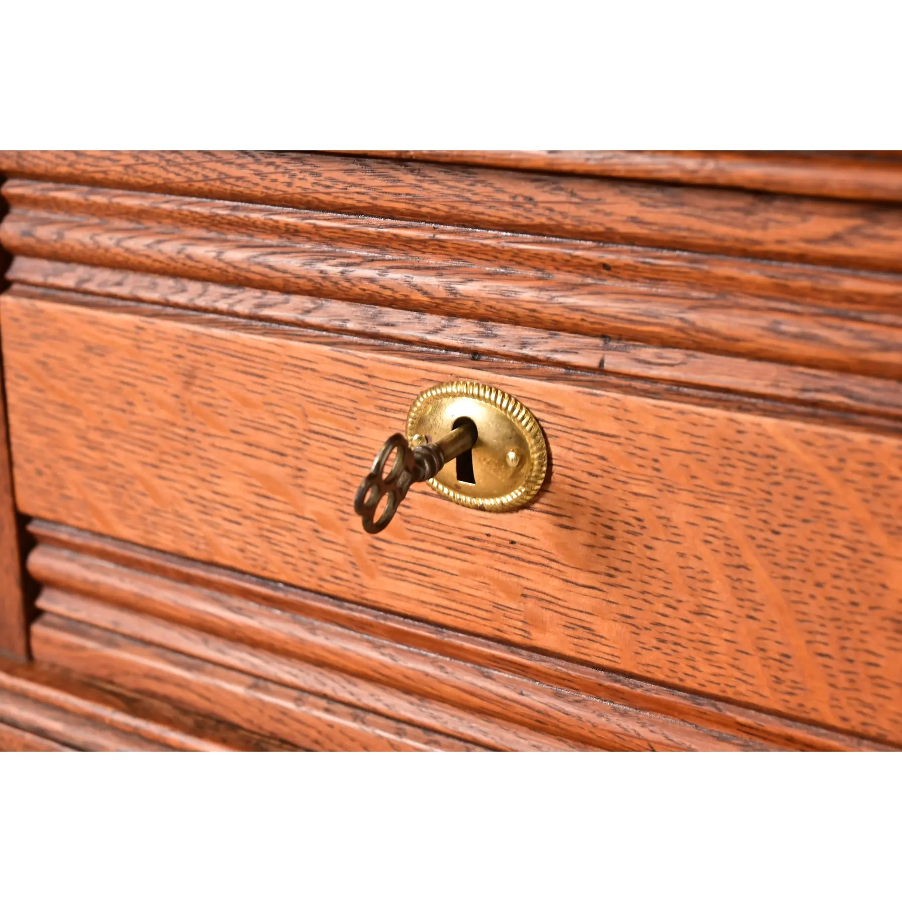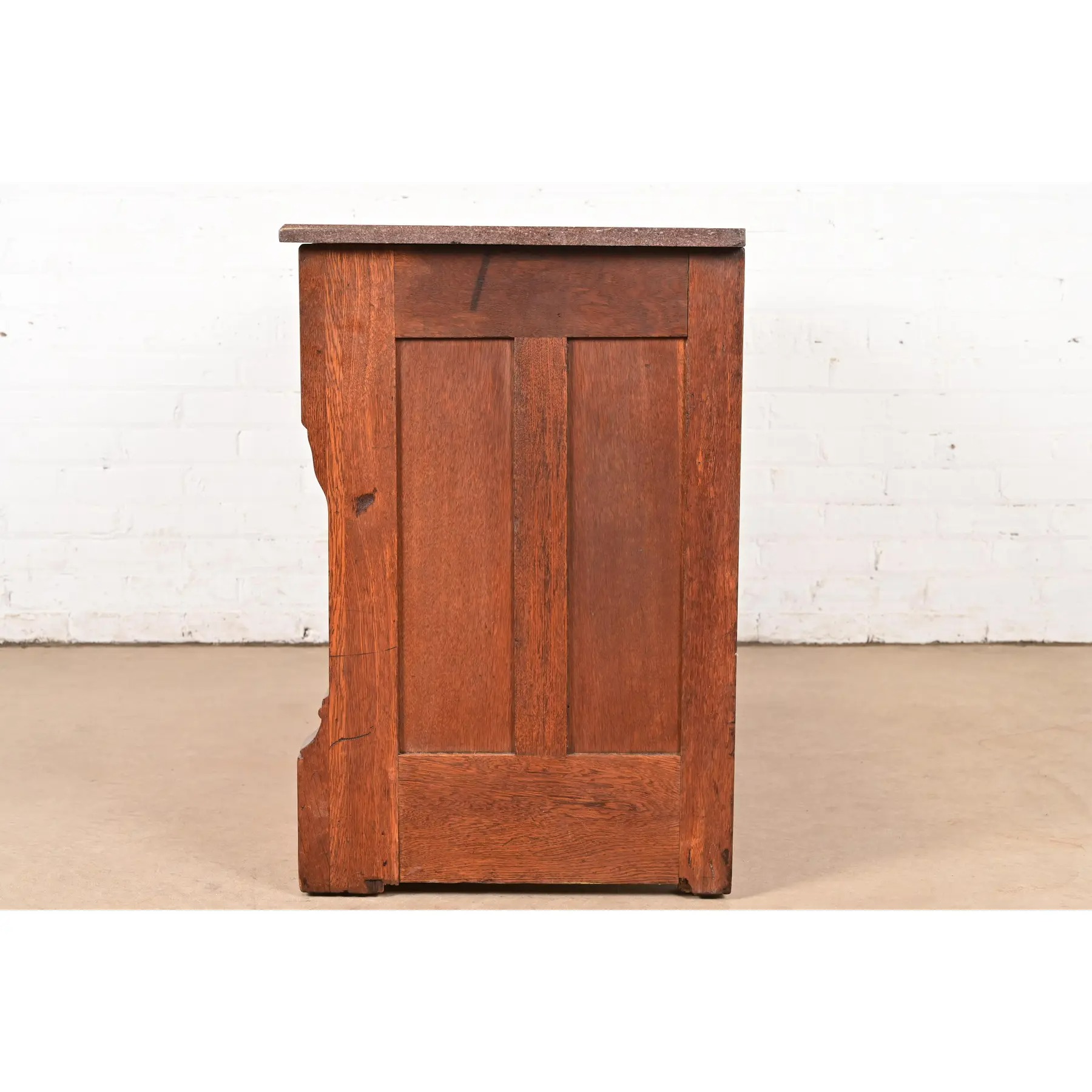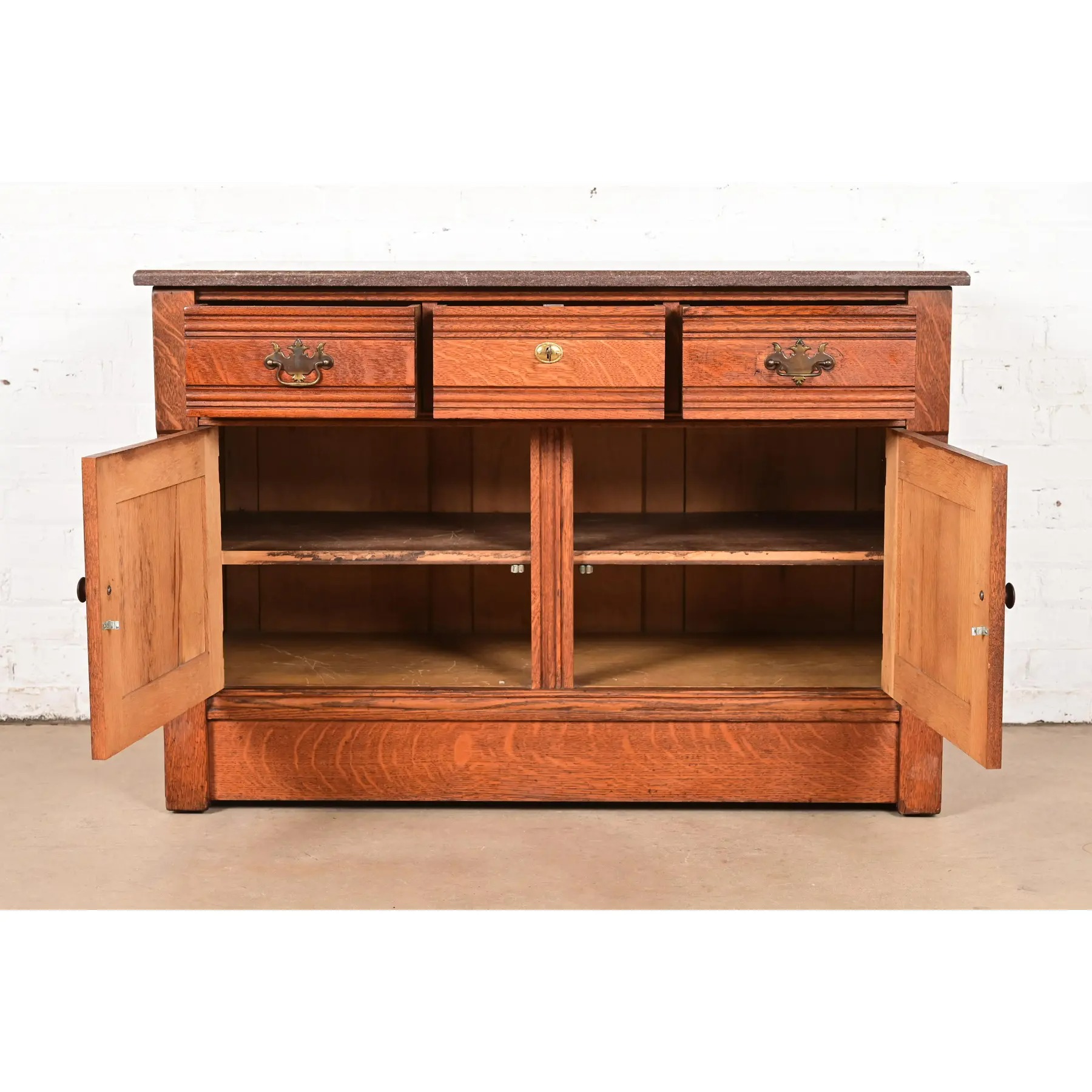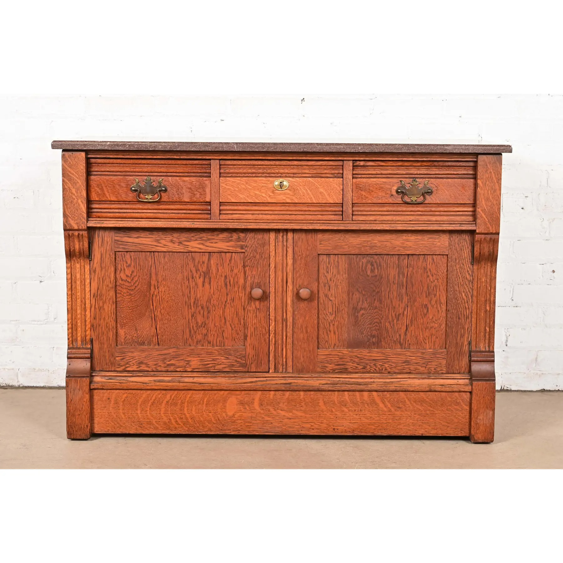 Beautiful quarter sawn oak, with marble top and brass hardware. Top middle drawer locks, and key is included.