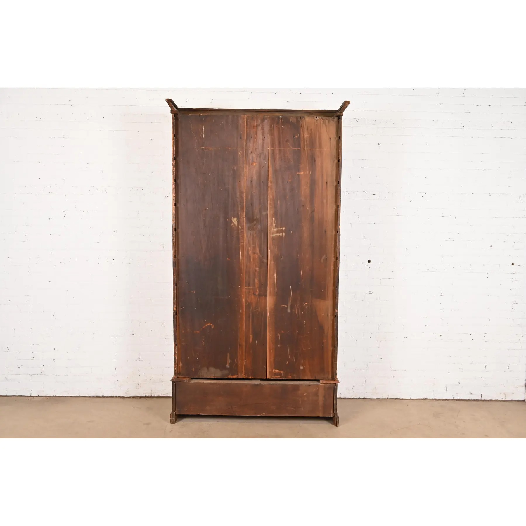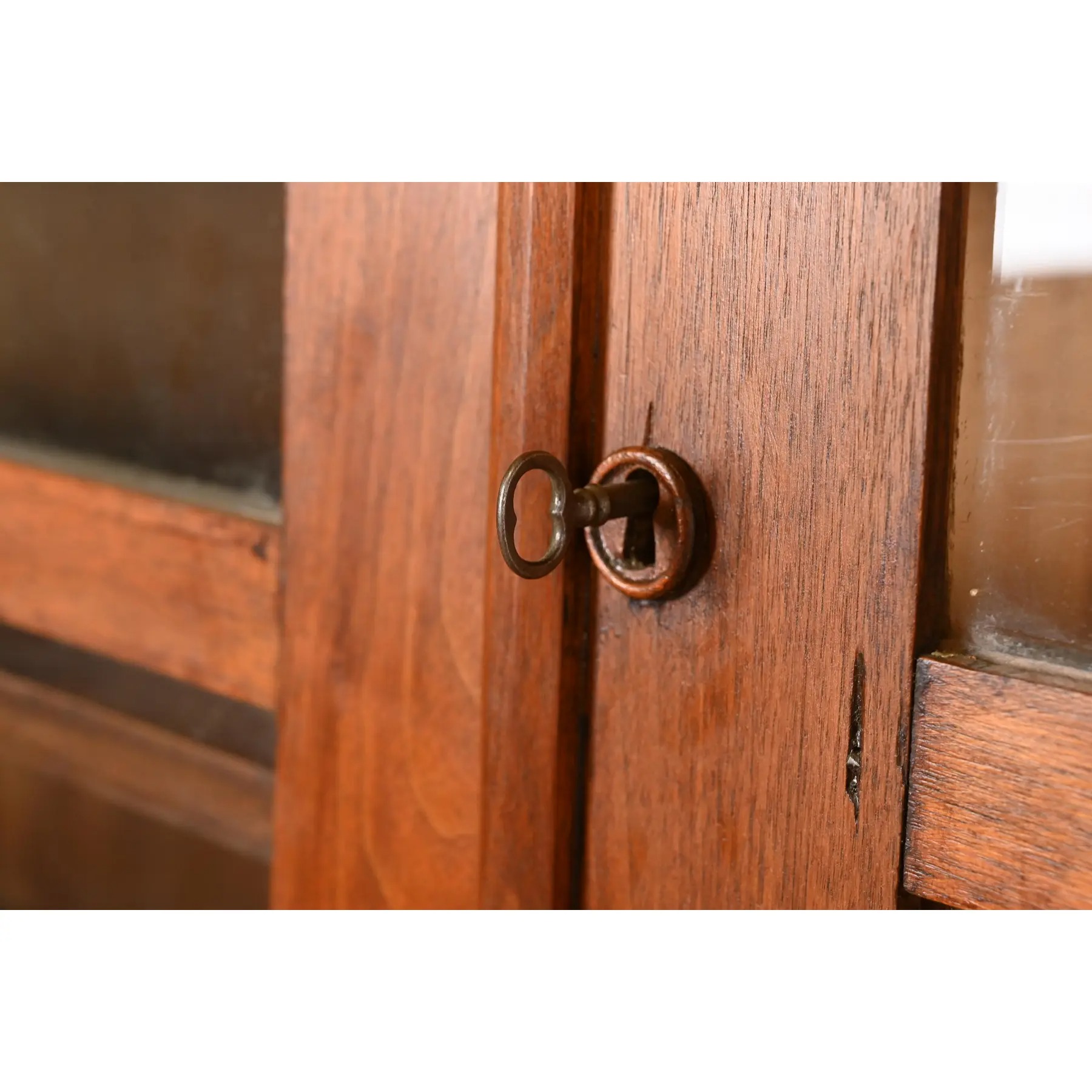 Carved walnut, with glass front doors and brass hardware. Cabinet locks, and key is included.