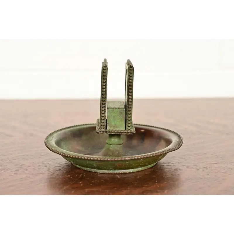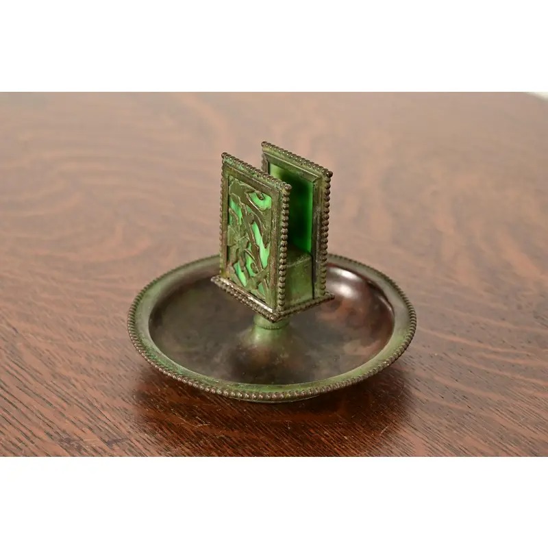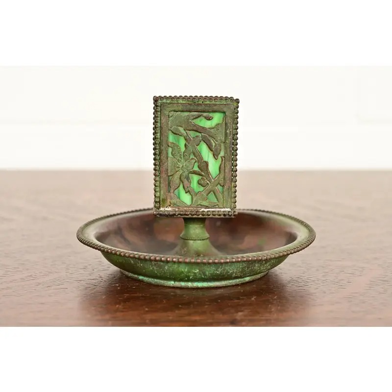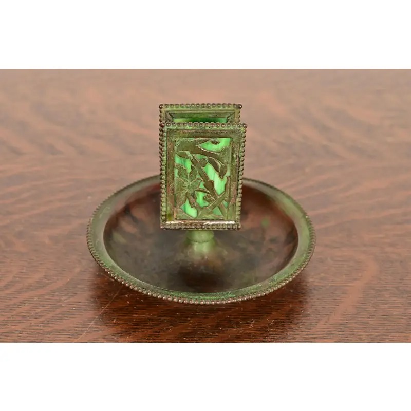 A beautiful Arts & Crafts or Art Nouveau period “Grapevine” pattern bronze and slag glass ashtray with matchbox holder with verdigris green patina