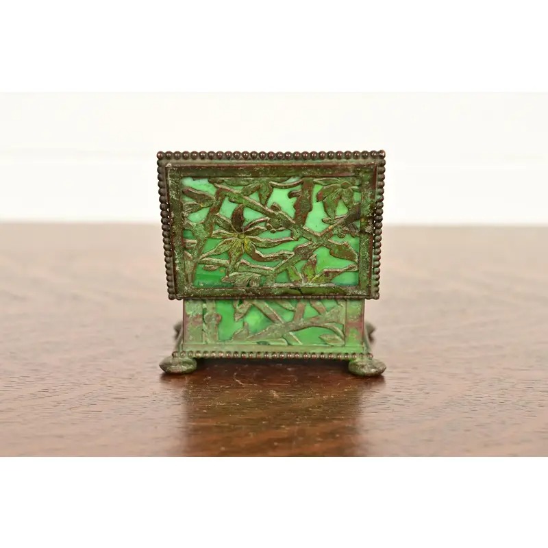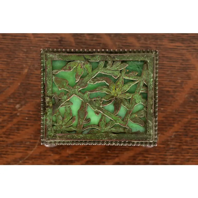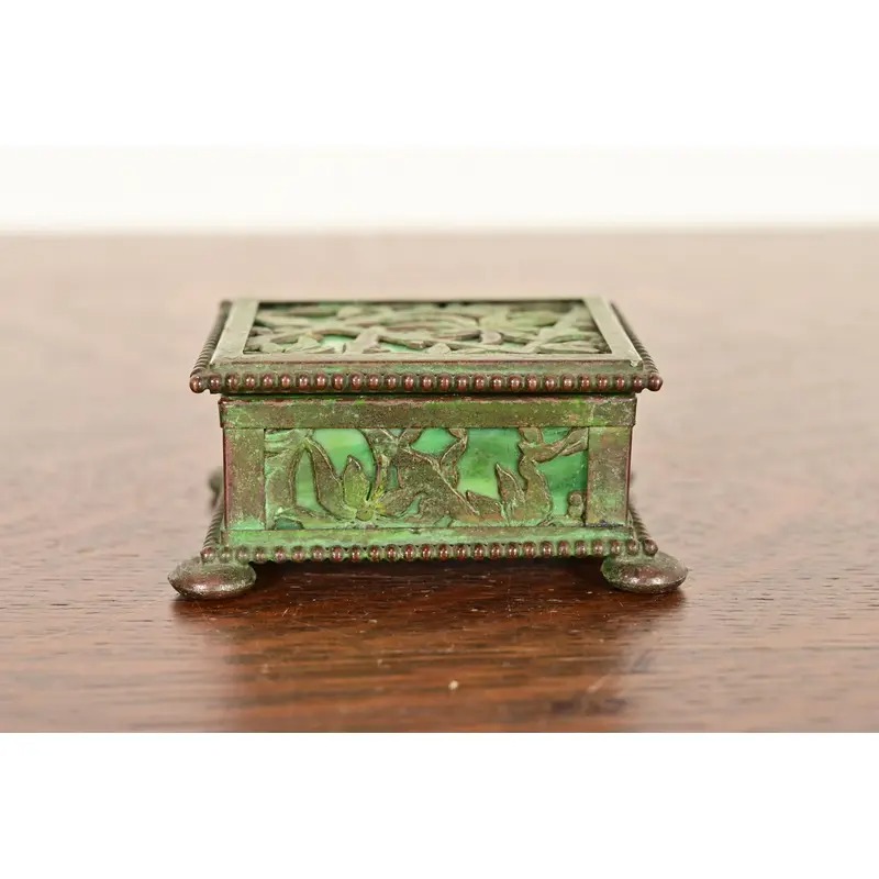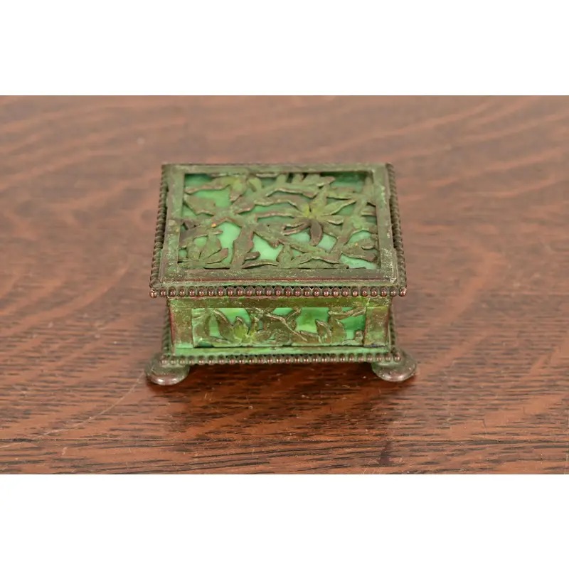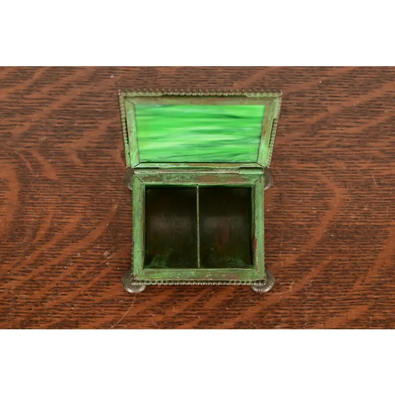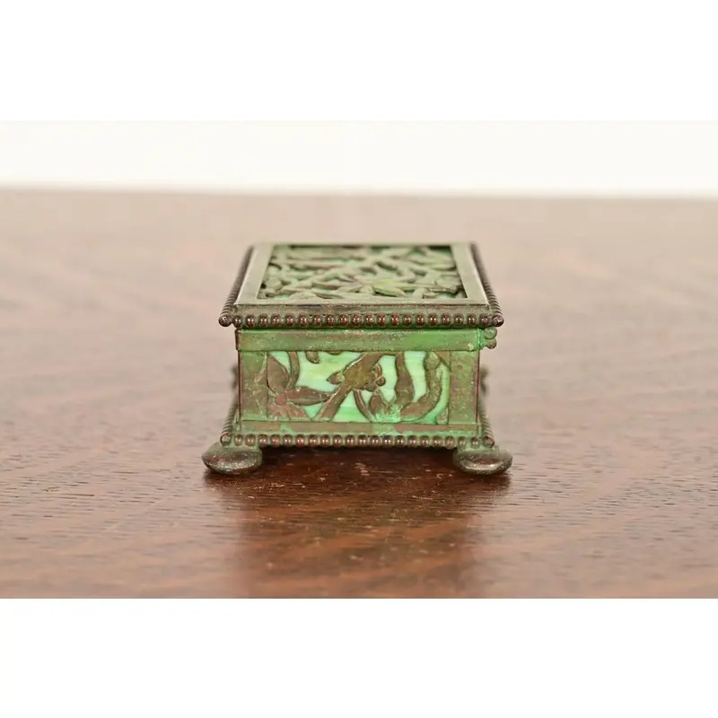 A beautiful Arts & Crafts or Art Nouveau period “Grapevine” pattern bronze and slag glass stamp box, desk box, decorative box, or jewelry box with verdigris green patina