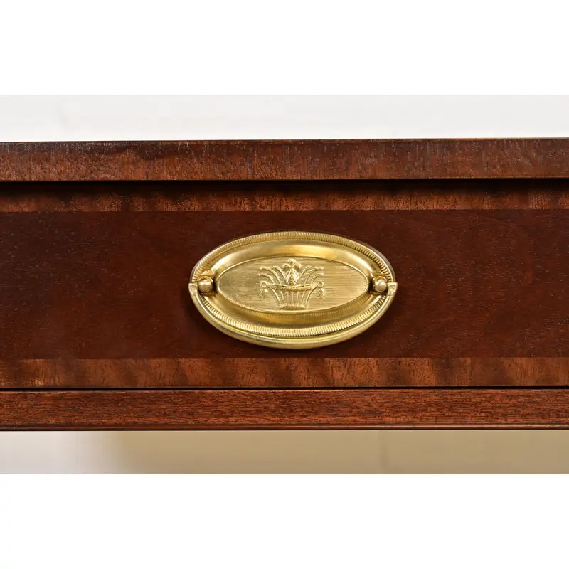 Mahogany, with satinwood banding, original brass hardware and accents, and brass-capped feet.