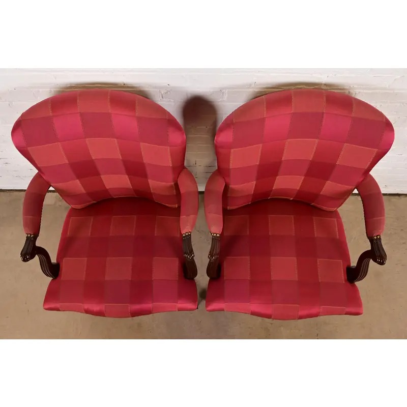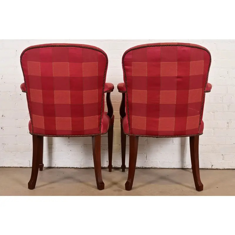 Baker Furniture English Regency Carved Mahogany Upholstered Armchairs or Dining Captain Chairs, Pair