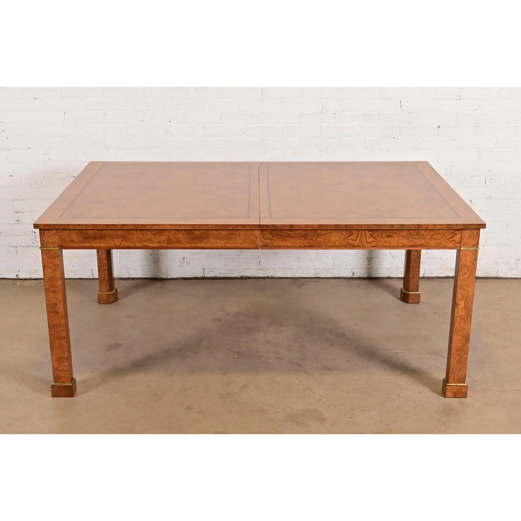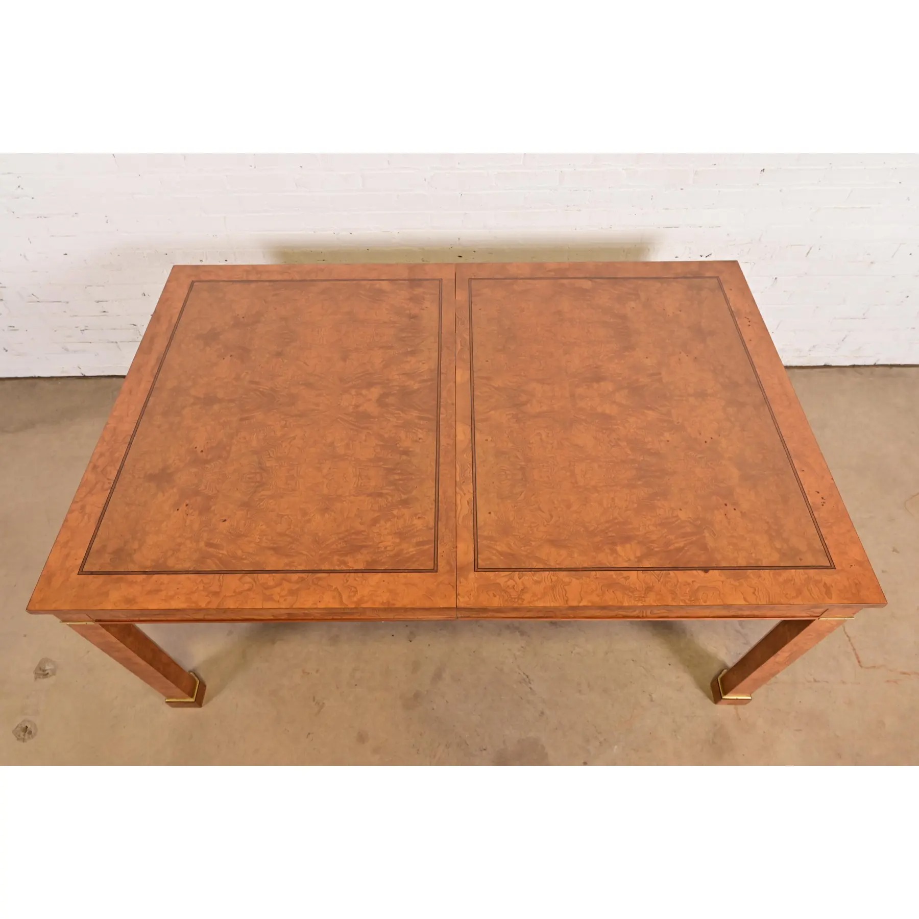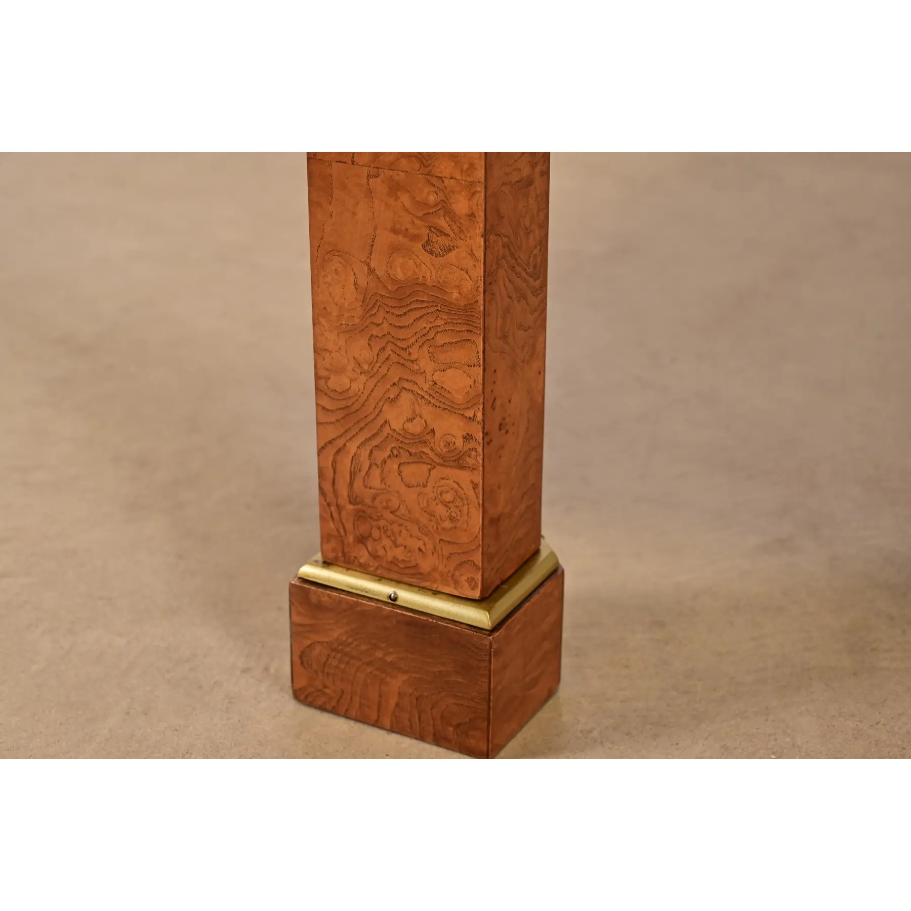 Beautiful book-matched burled olive wood, with inlaid walnut banding, and brass accents.