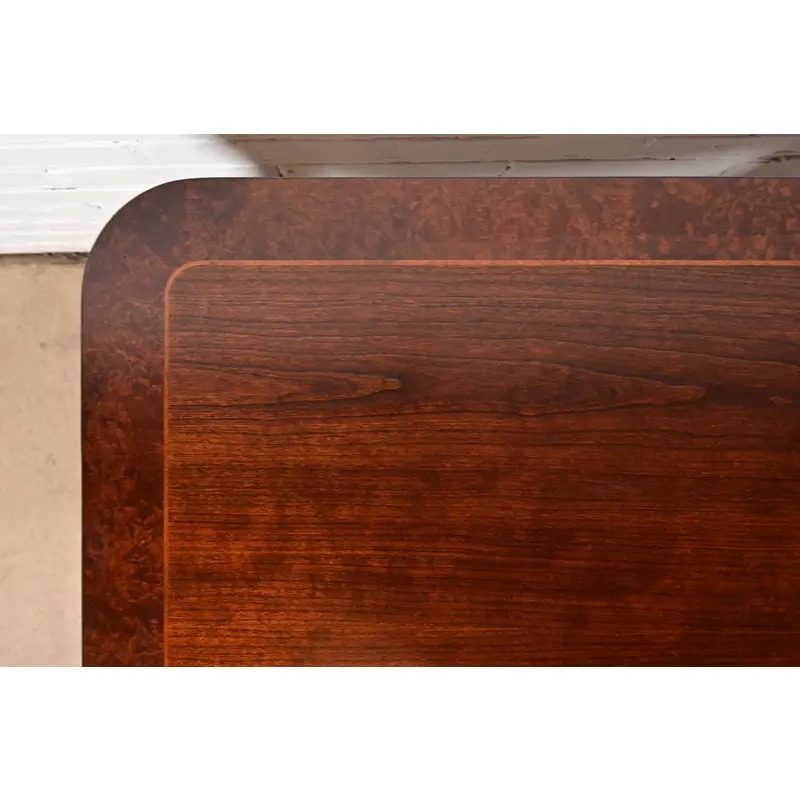 Carved cherry wood, with burl wood banding and satinwood string inlay.