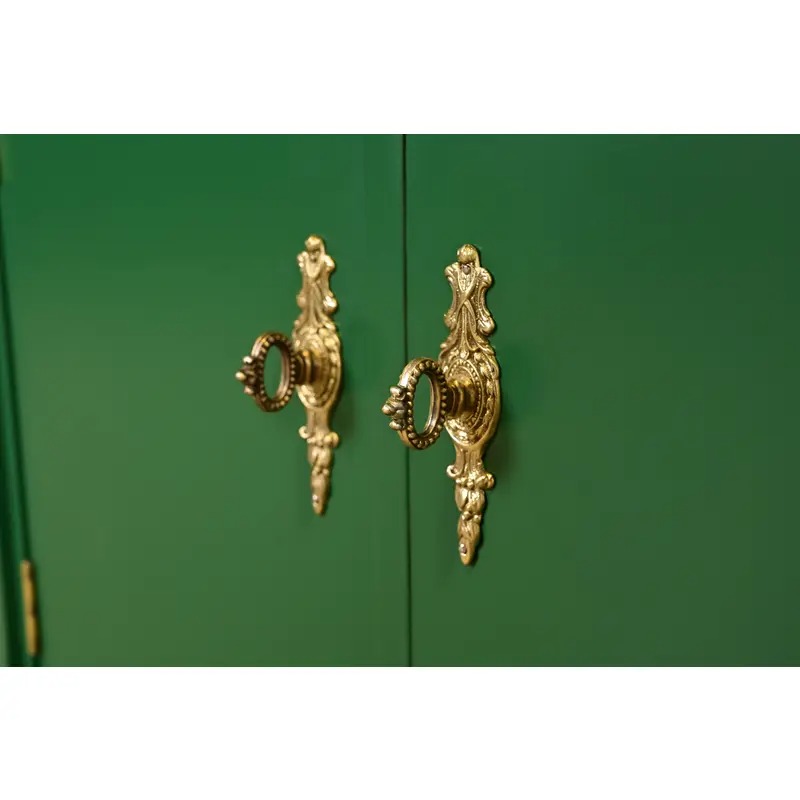 Green lacquered cherry wood, with original brass hardware and accents.
