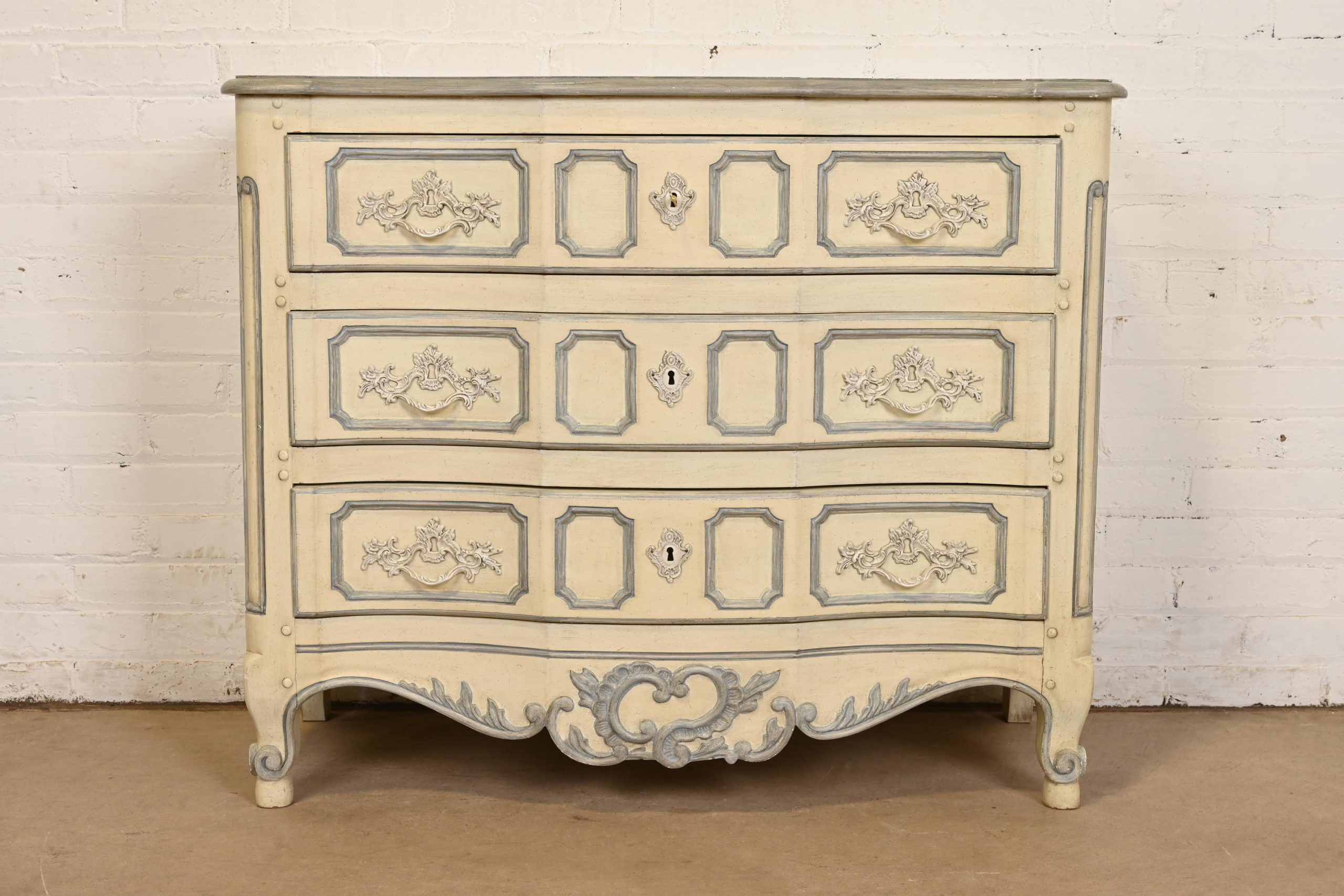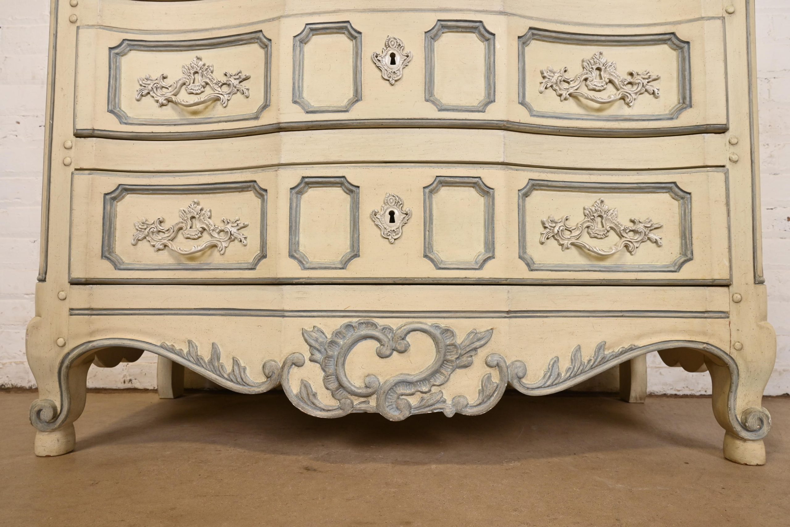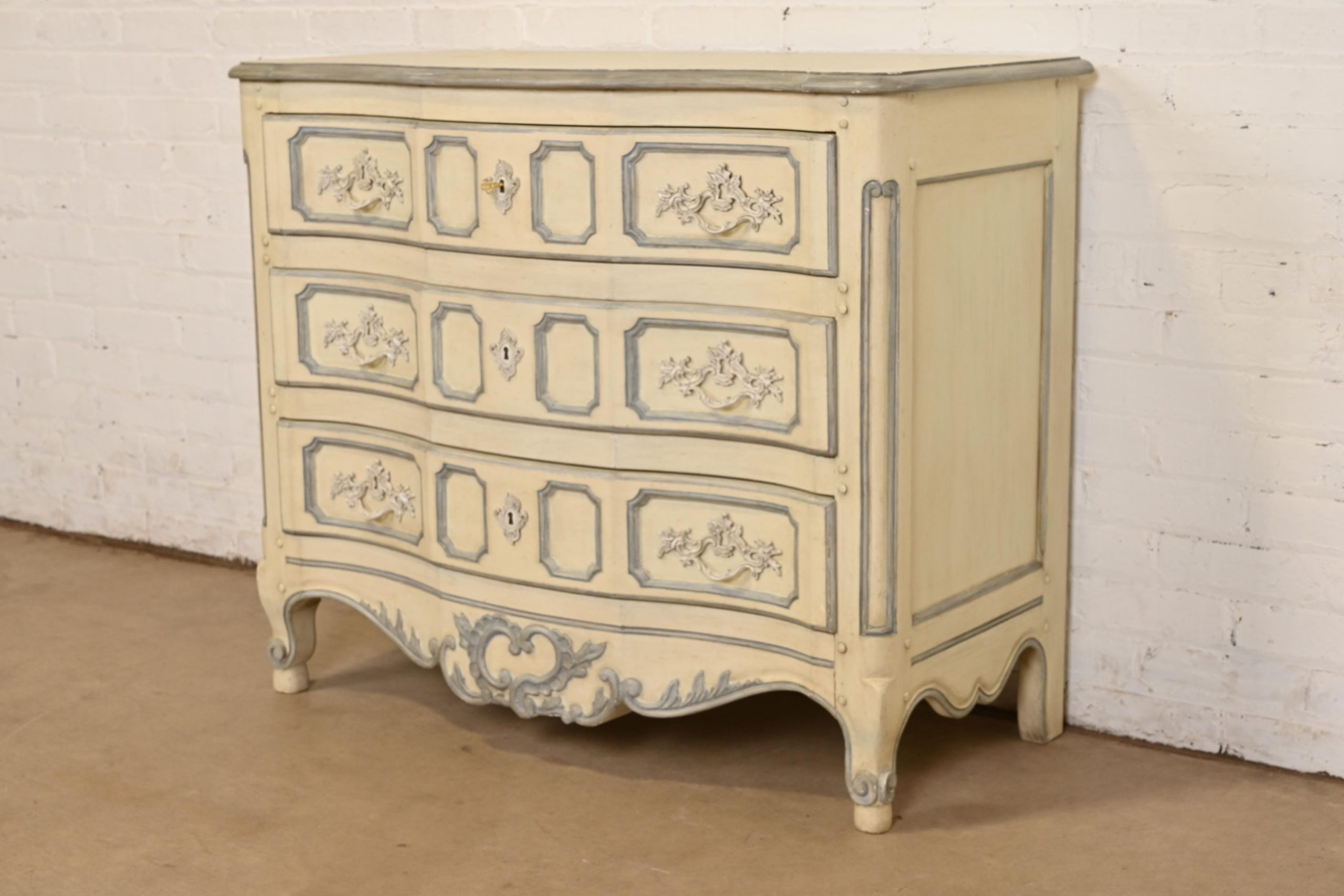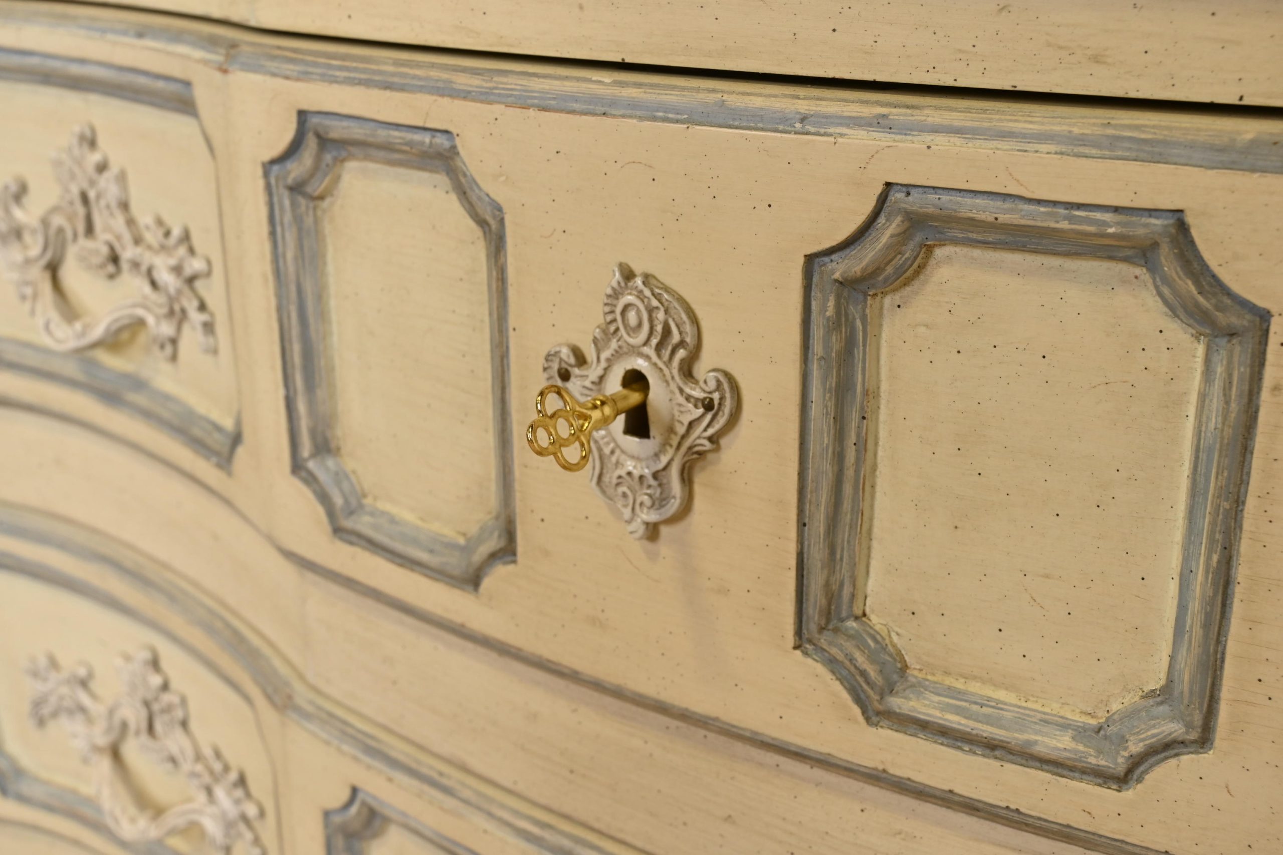 Carved walnut, with original cream and blue gray lacquered finish. Drawers locks and key is included.