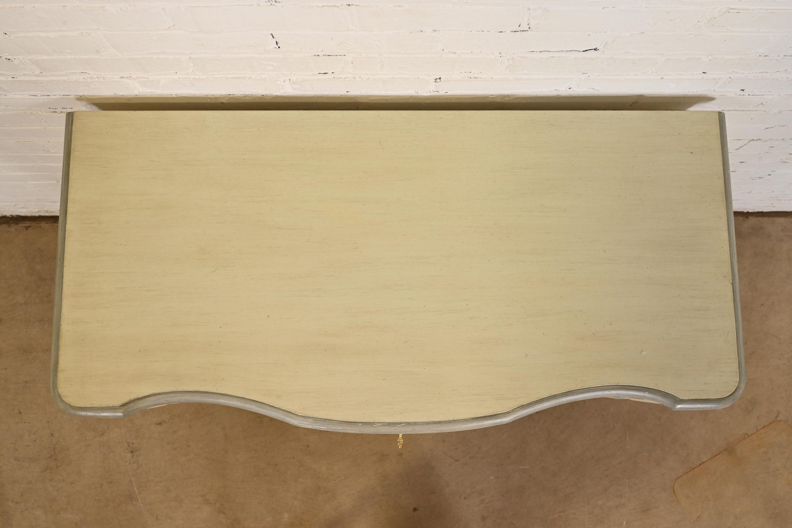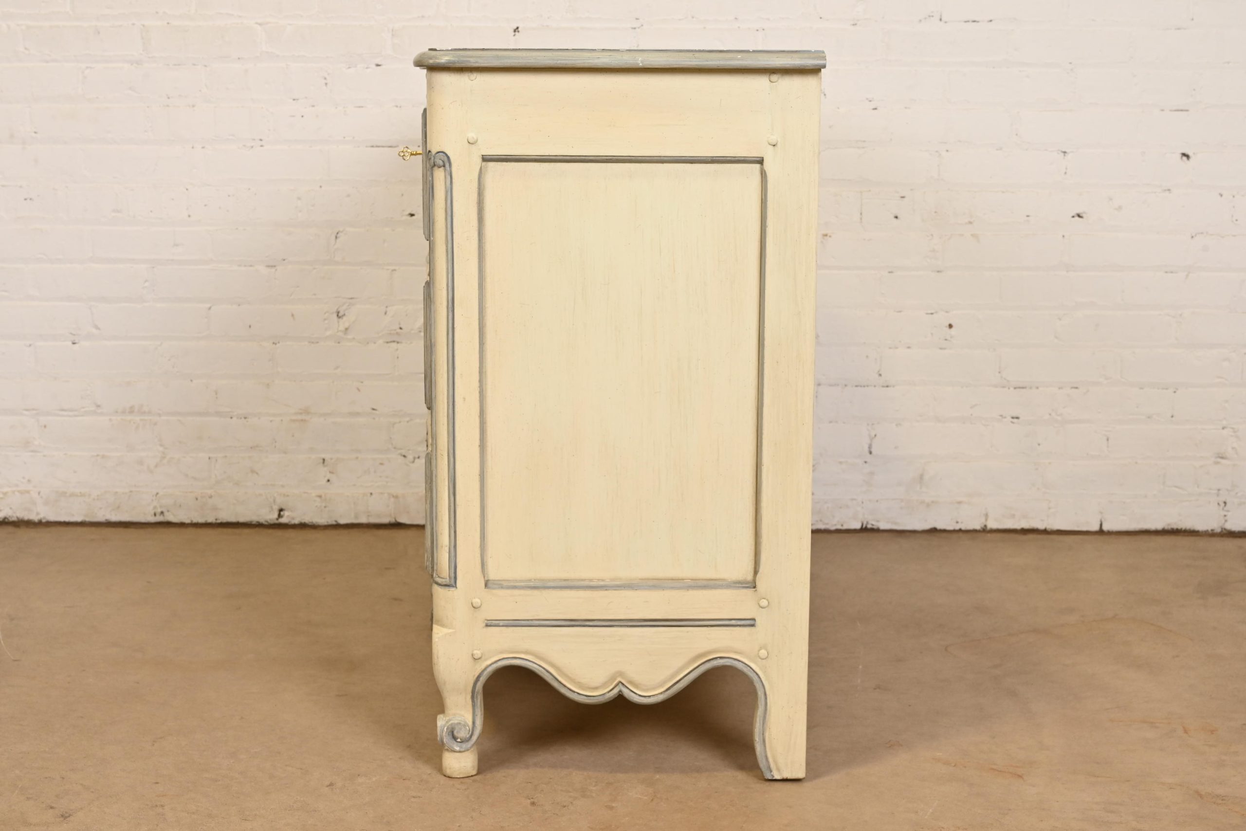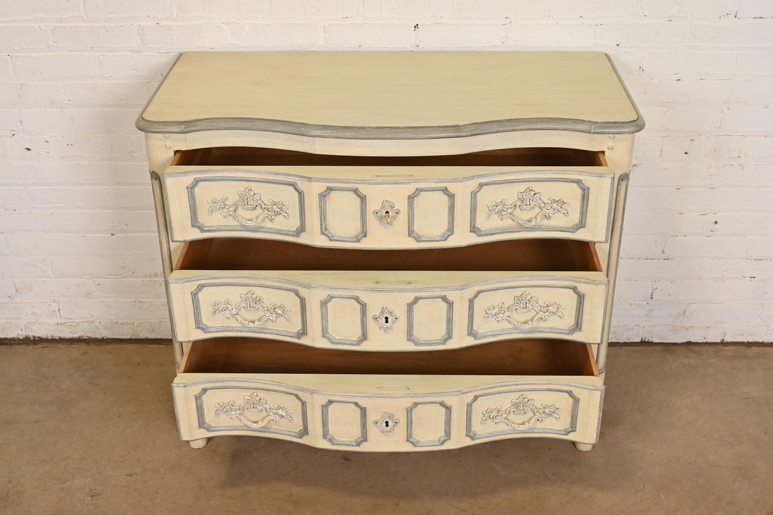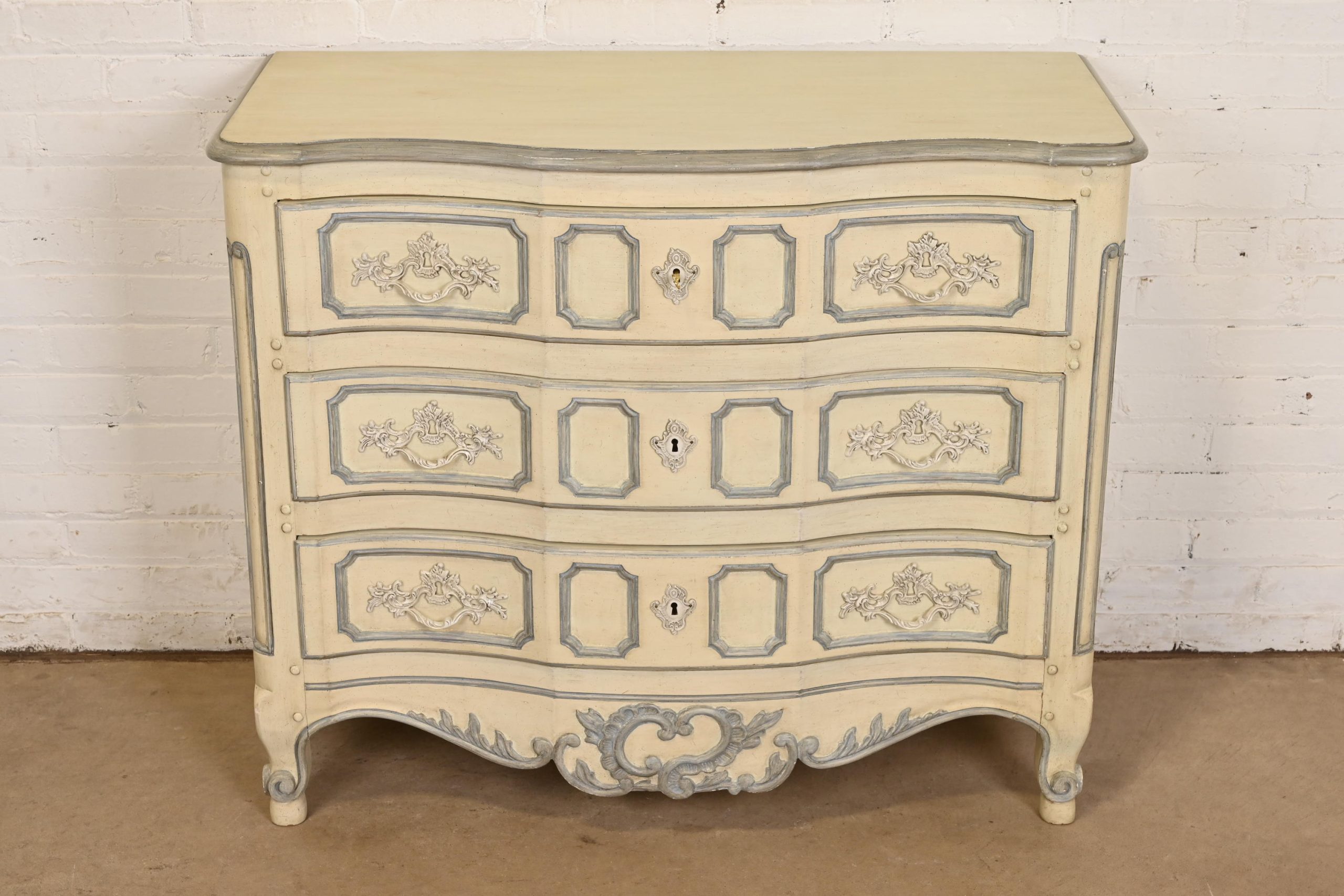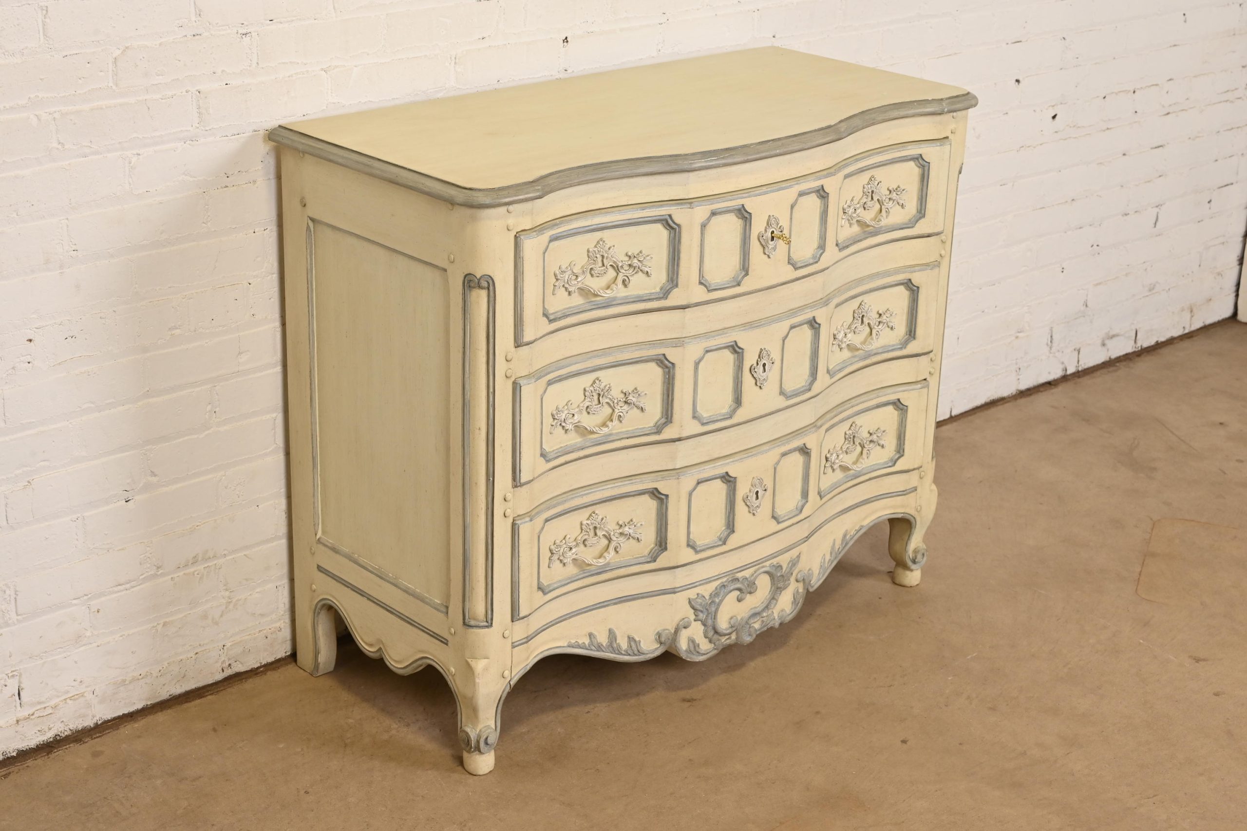 Carved walnut, with original cream and blue gray lacquered finish. Drawers locks and key is included.