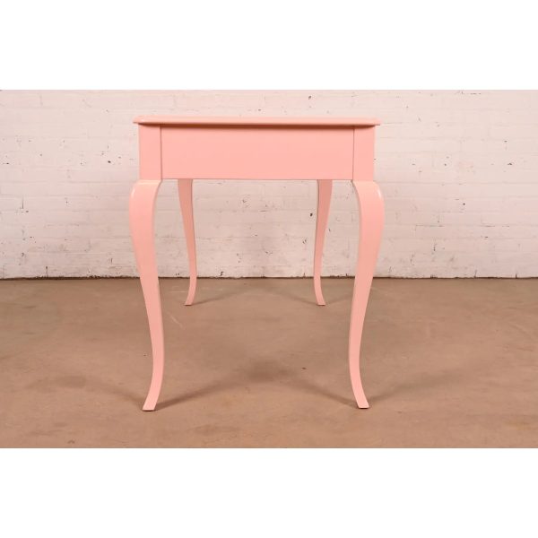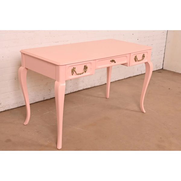 Pink lacquered cherry wood, with original brass hardware. Middle drawer locks, and key is included.