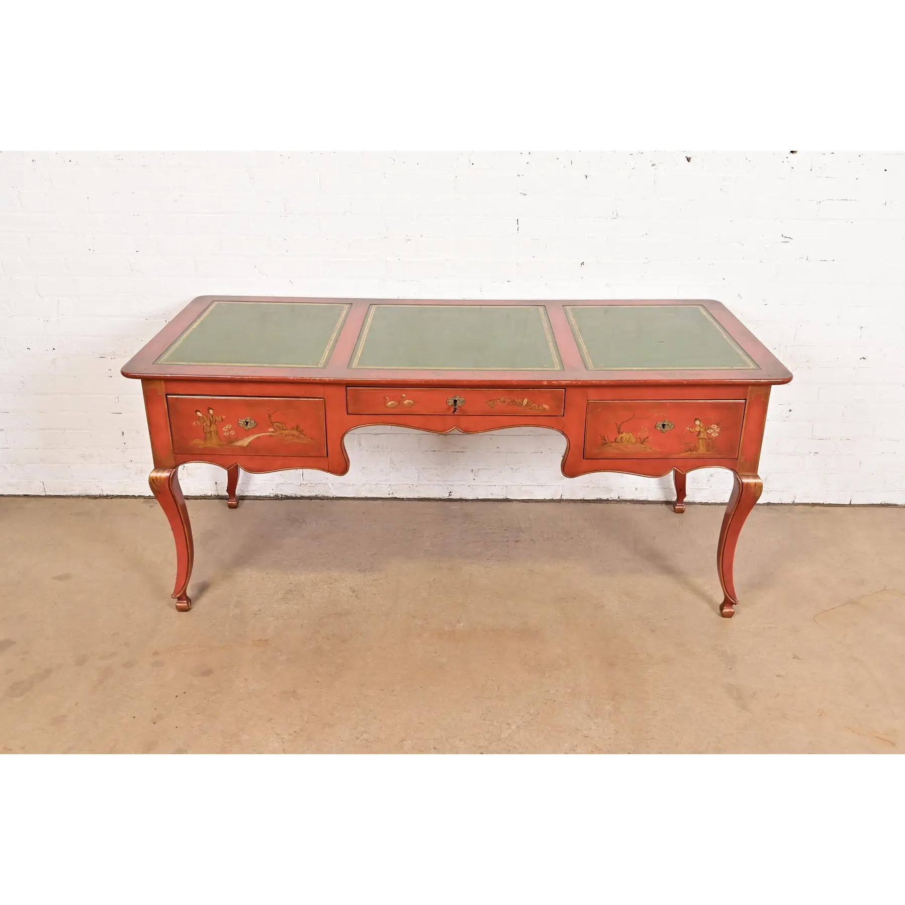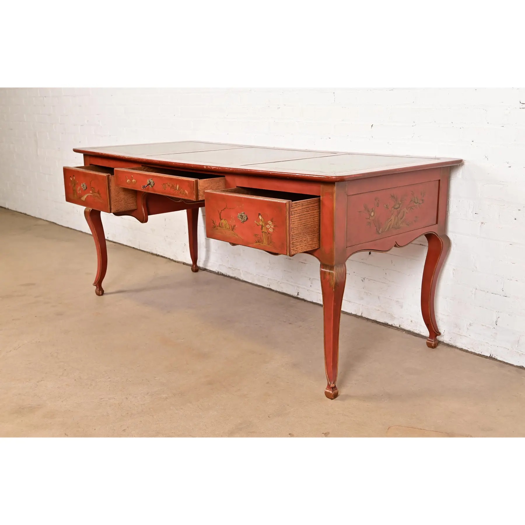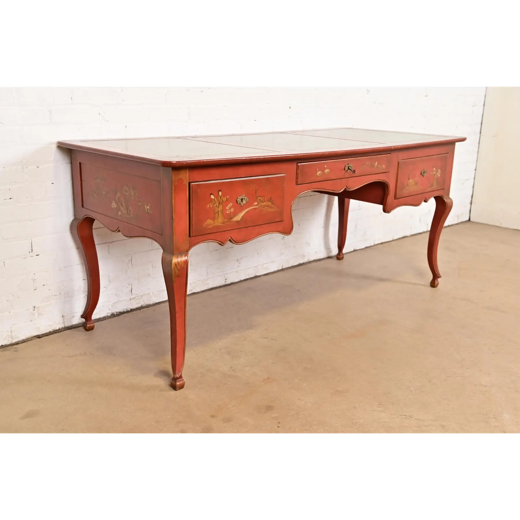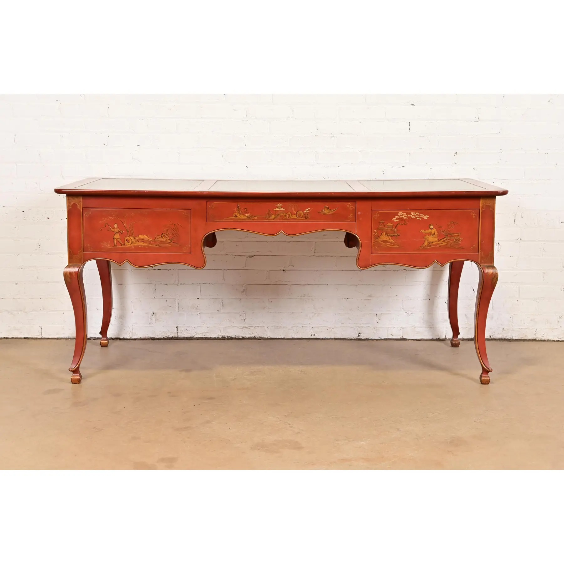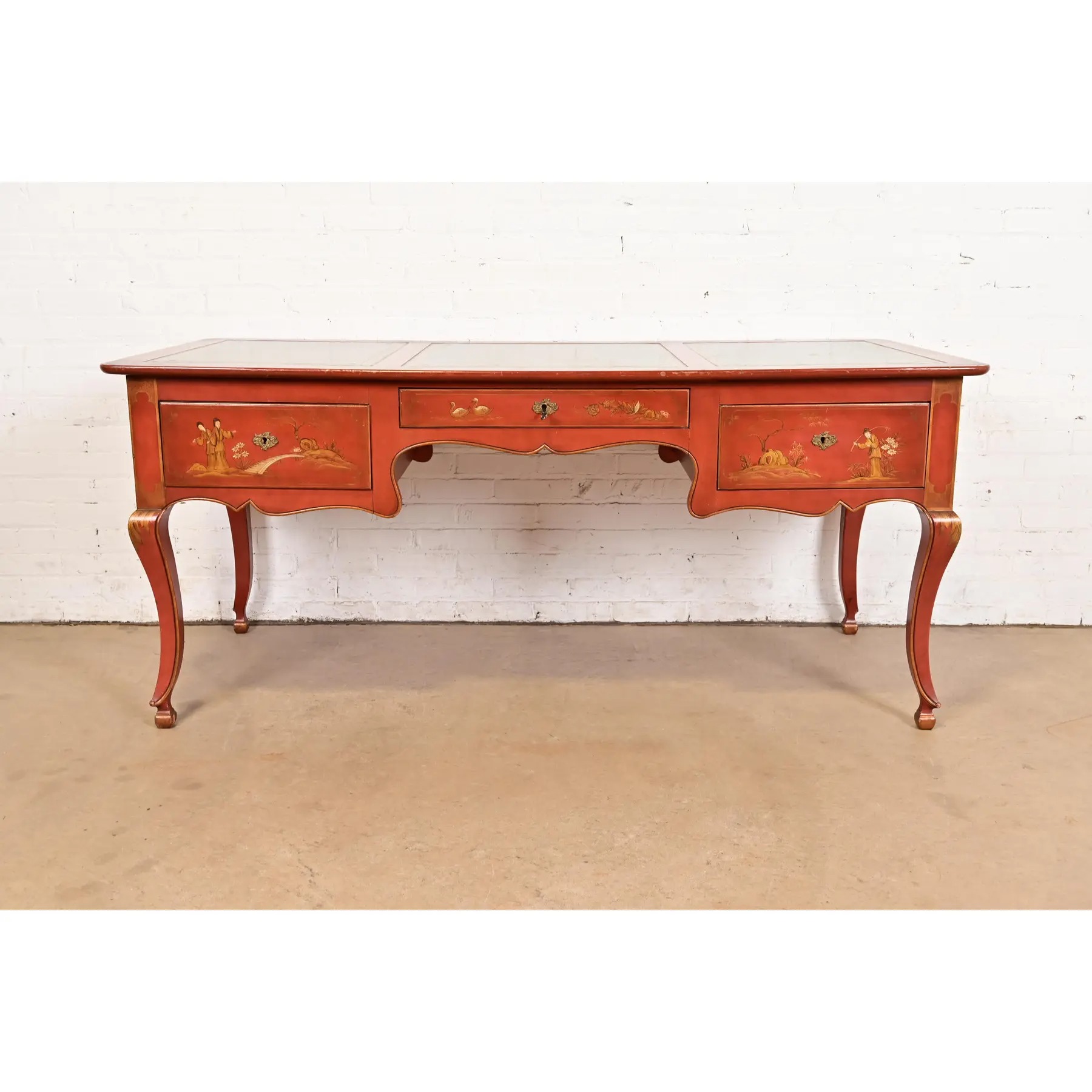 Baker Furniture French Regency Chinoiserie Red Lacquered Hand Painted Leather Top Bureau Plat Desk