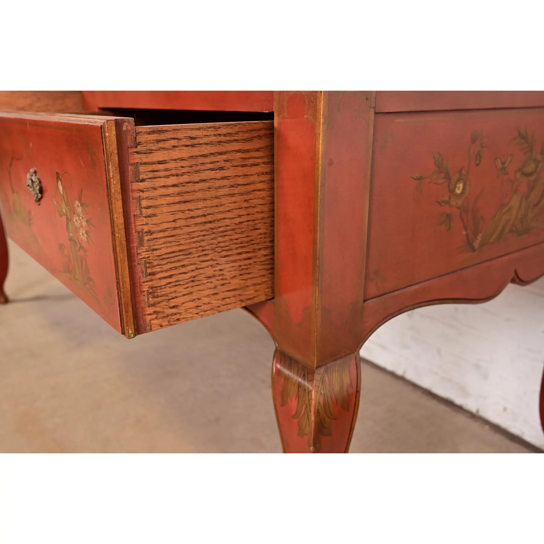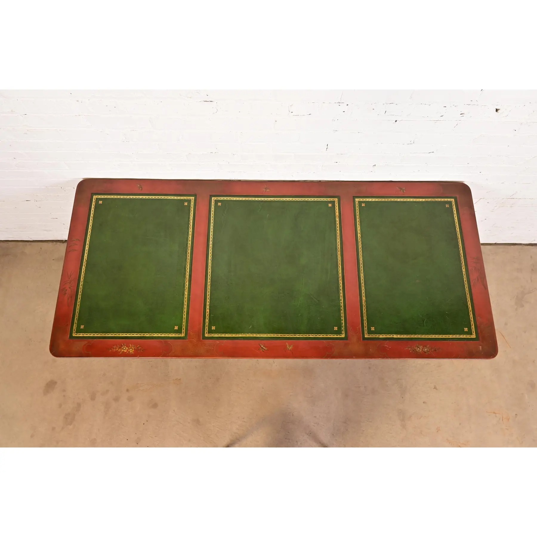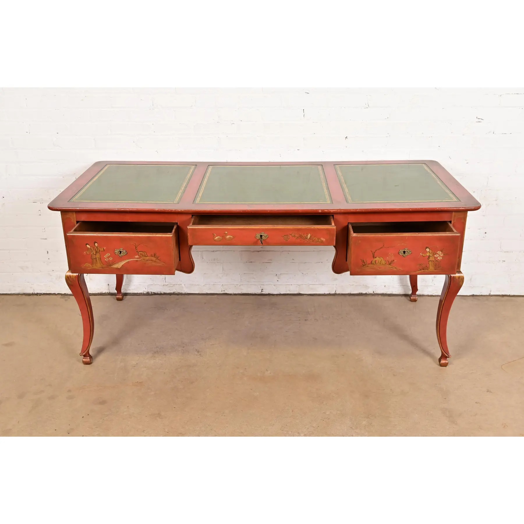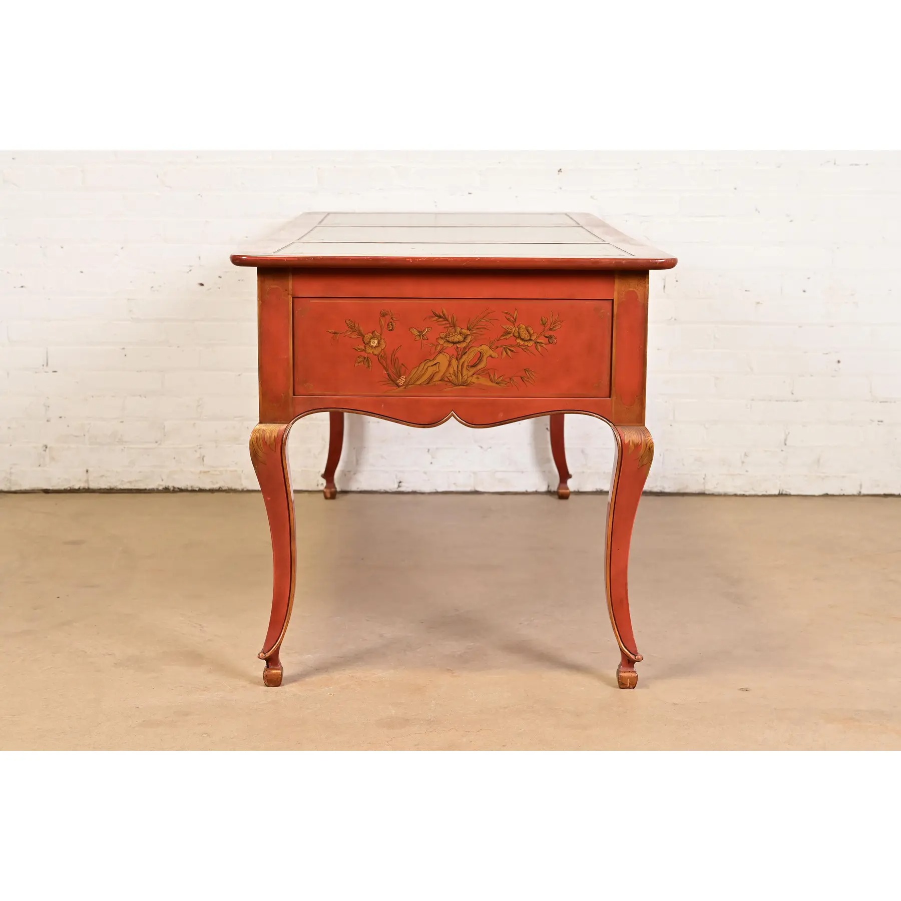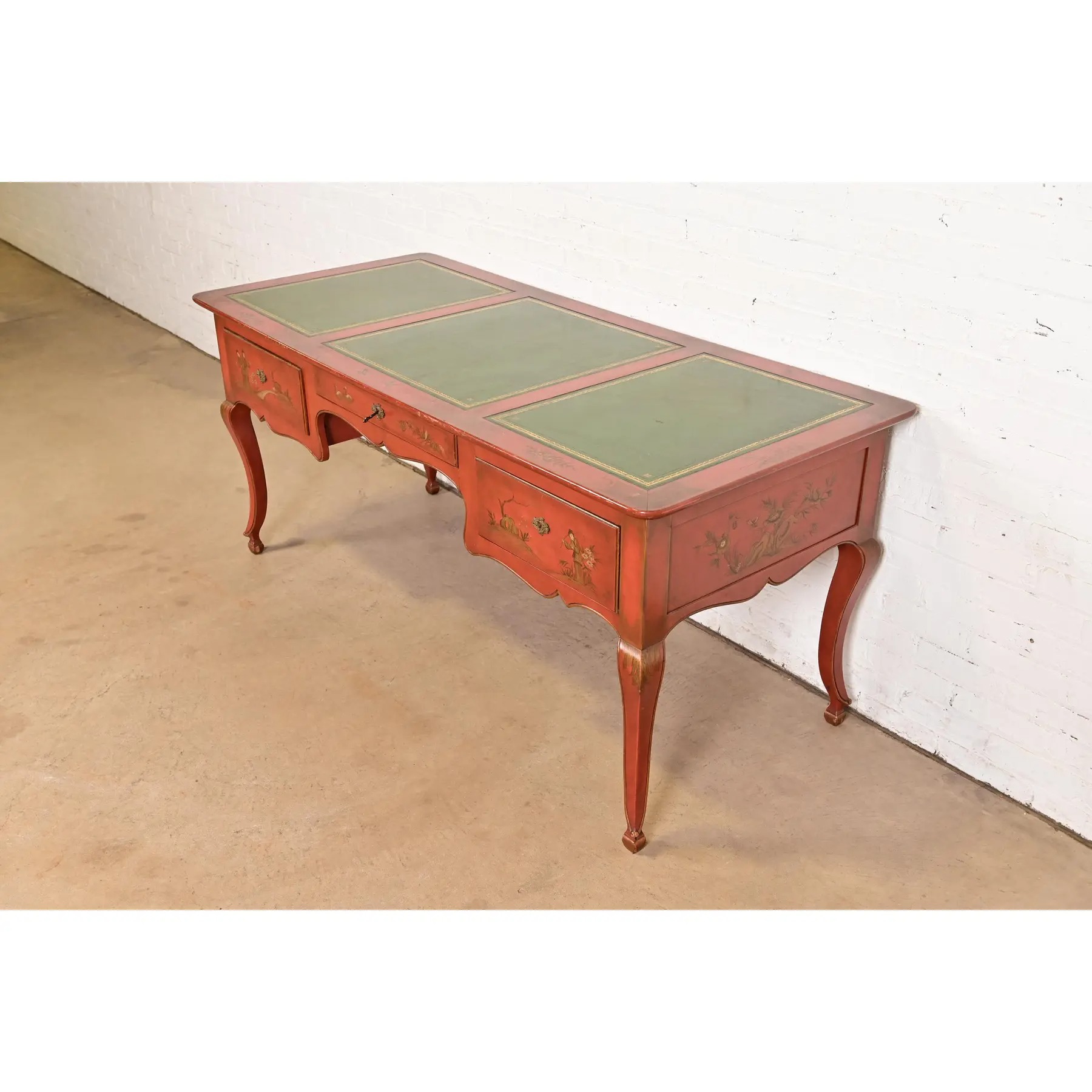 Baker Furniture French Regency Chinoiserie Red Lacquered Hand Painted Leather Top Bureau Plat Desk