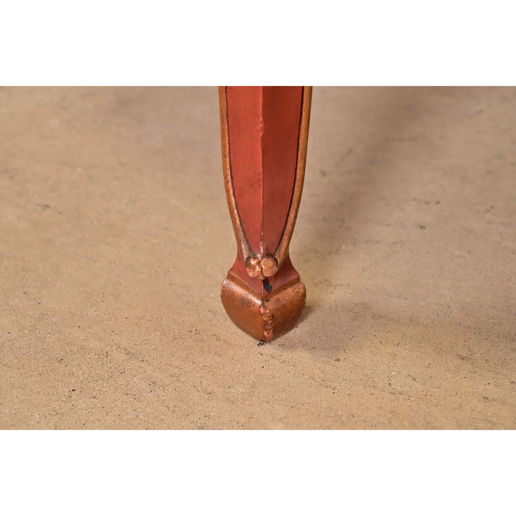 Red lacquered walnut, with hand-painted Asian nature scenes, embossed green leather top, and original brass hardware.