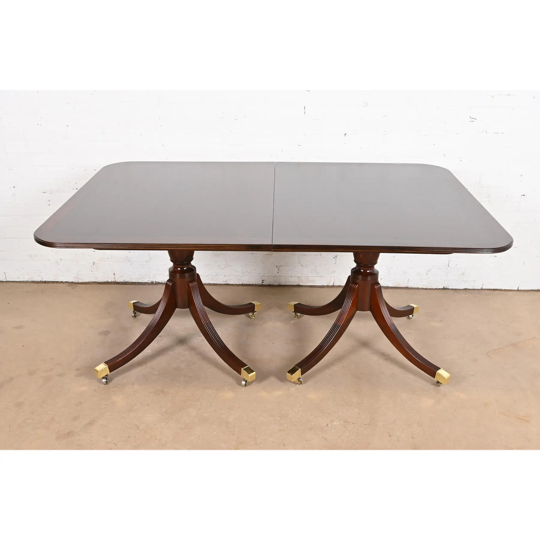Gorgeous book-matched mahogany top, with satinwood banding, carved solid mahogany pedestals, and brass-capped feet on brass casters.