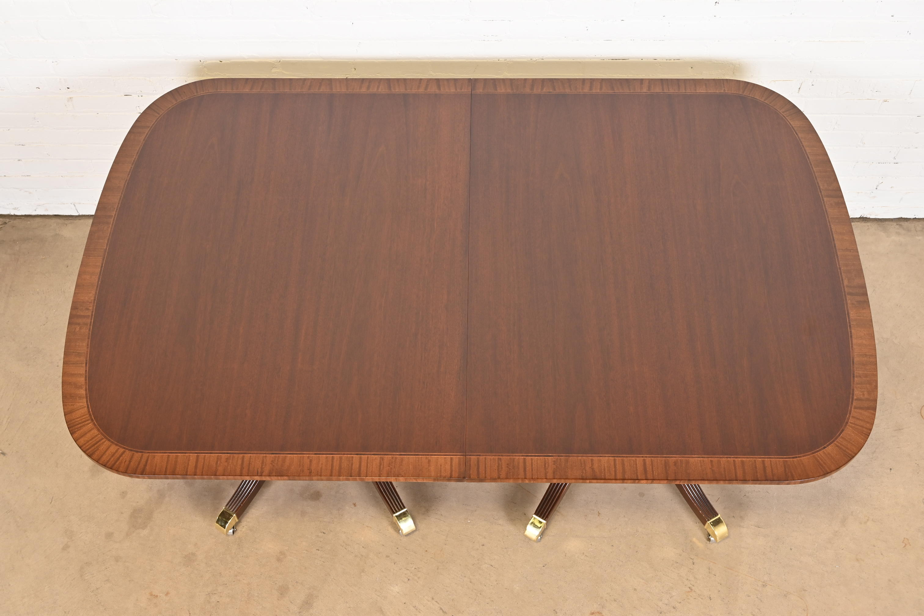 Gorgeous mahogany top, with satinwood banding, carved mahogany pedestals, and brass-capped feet on casters.
