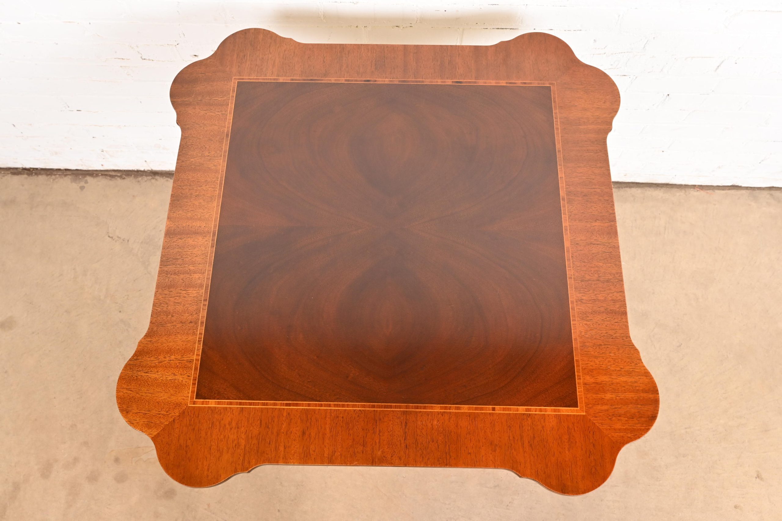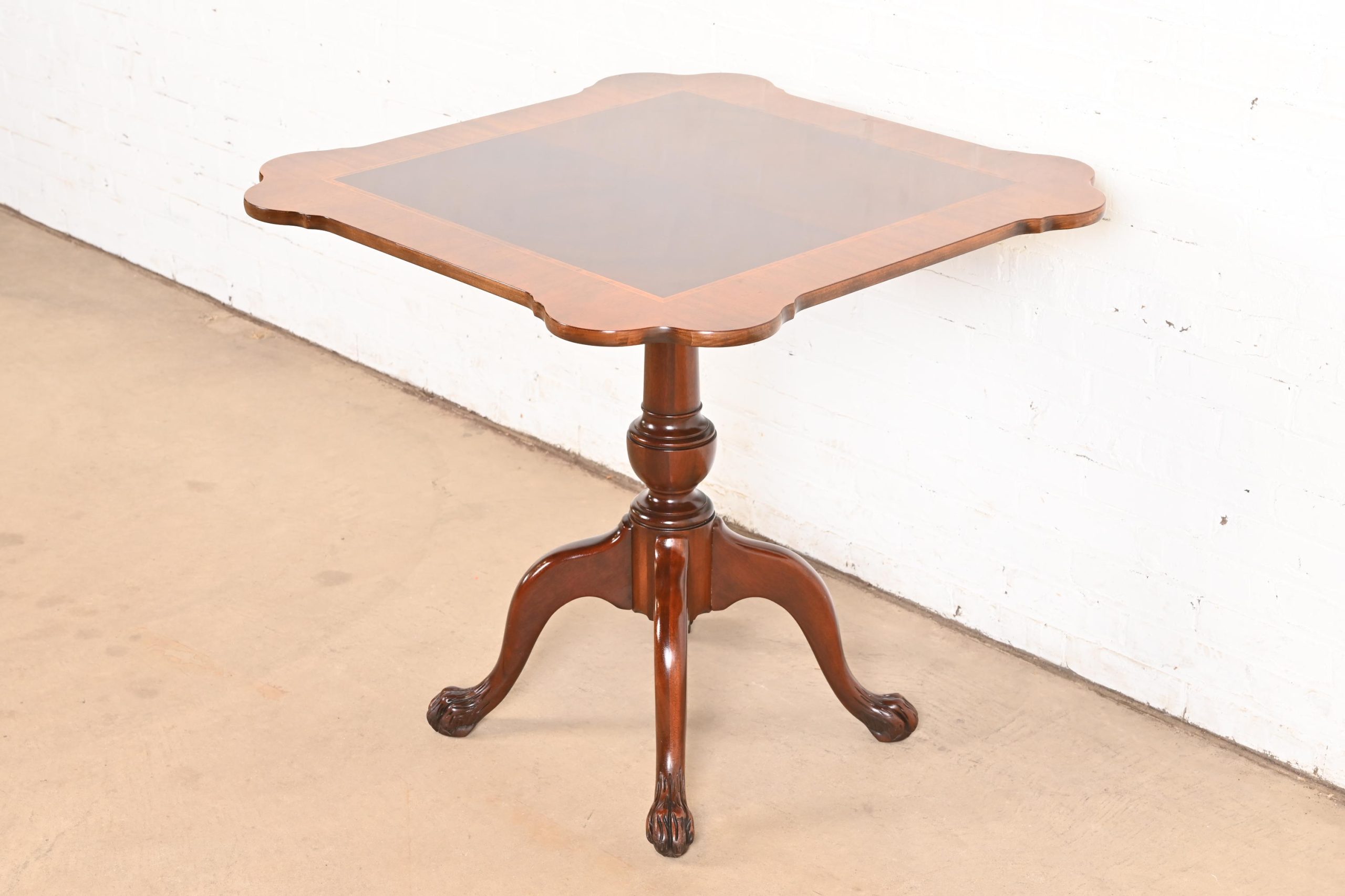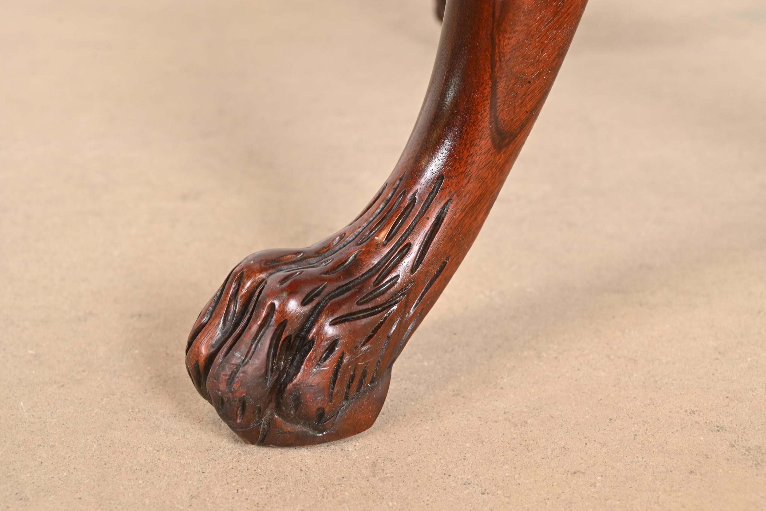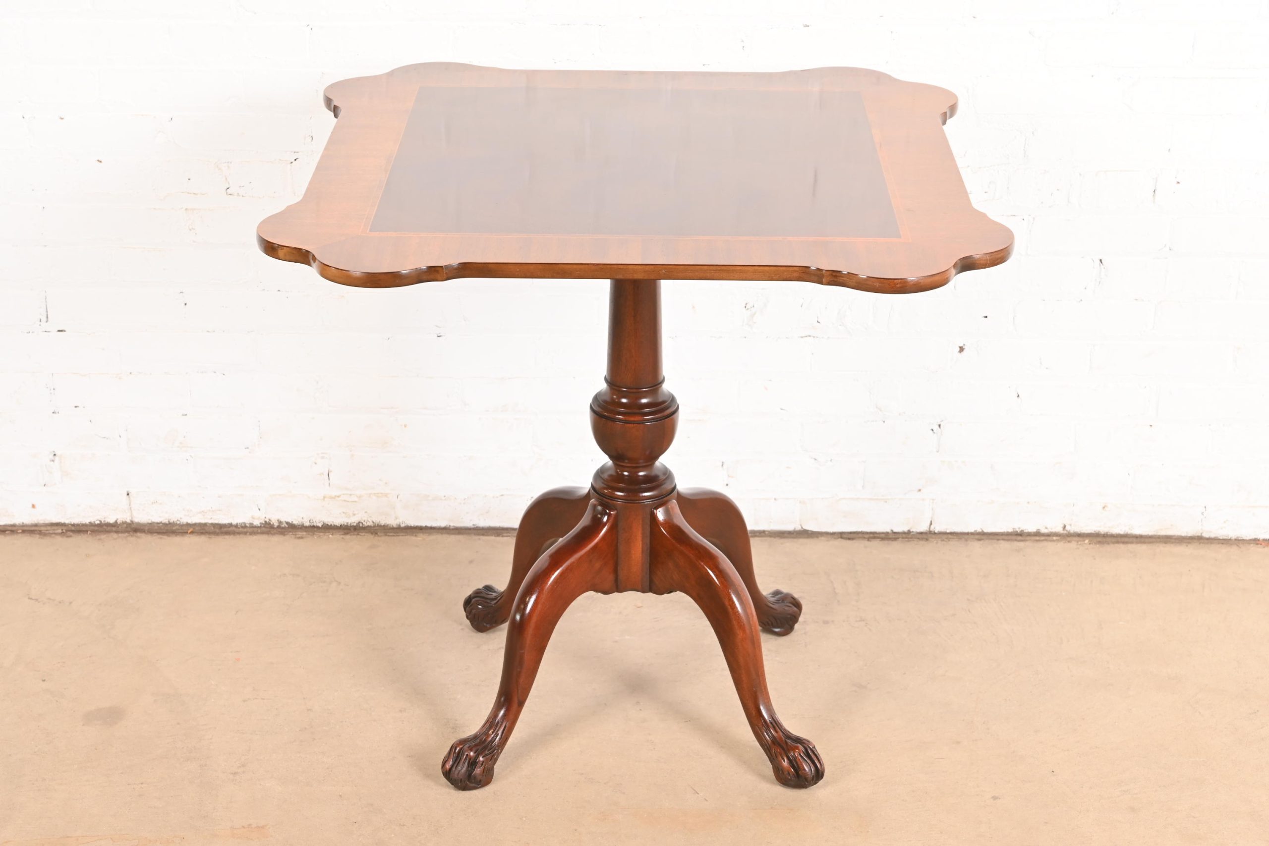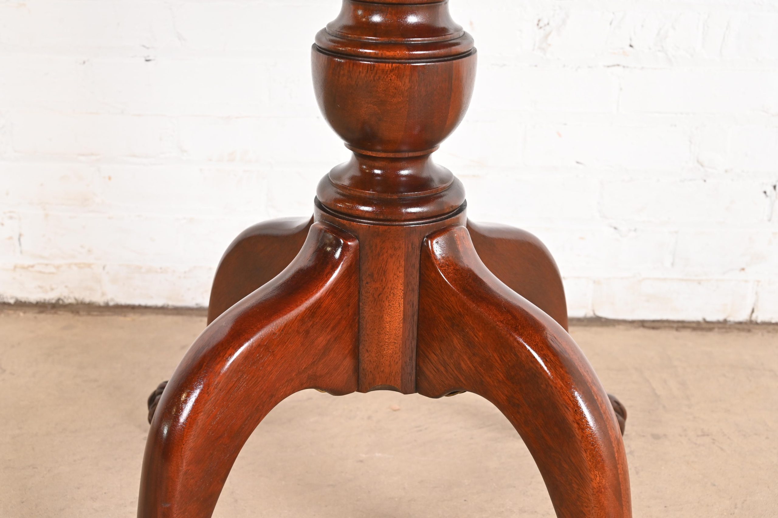 Beautiful banded mahogany, with carved solid mahogany pedestal and paw feet.