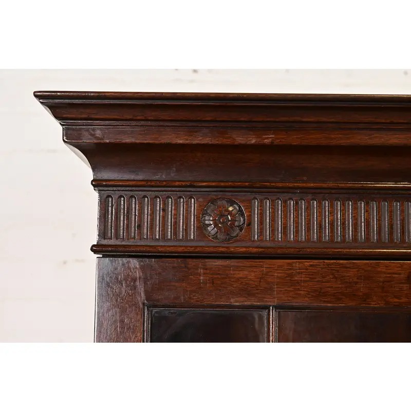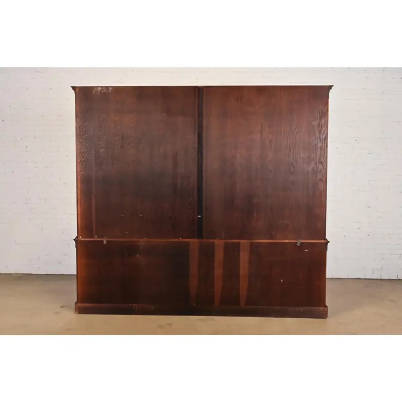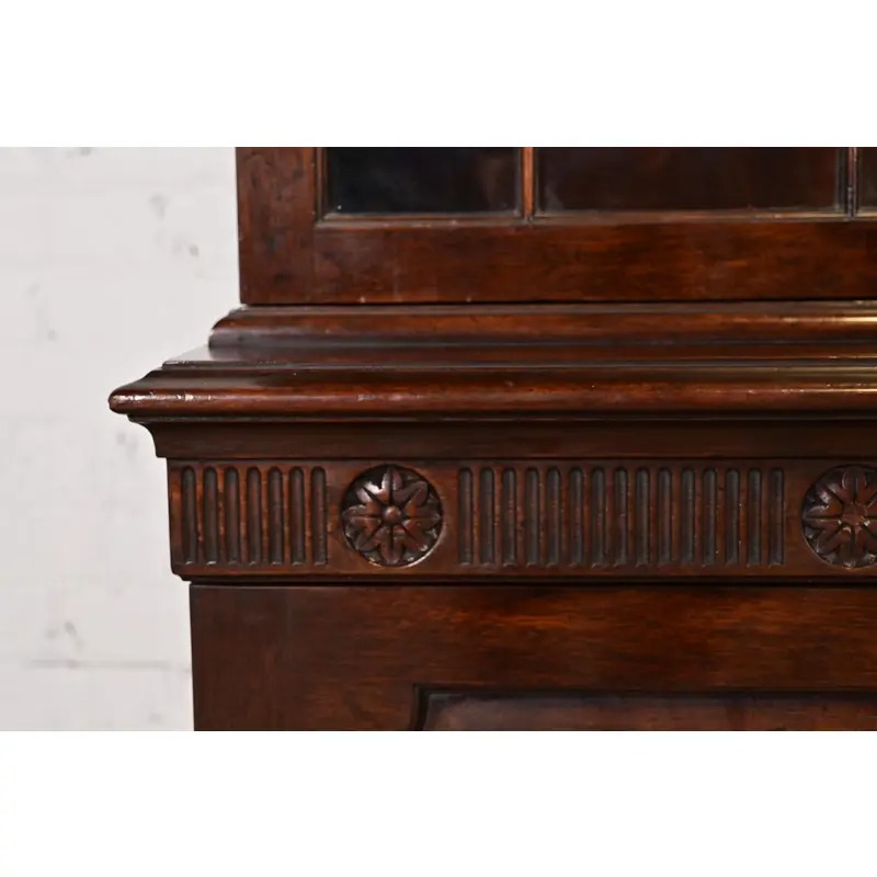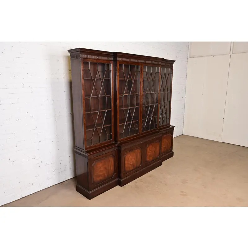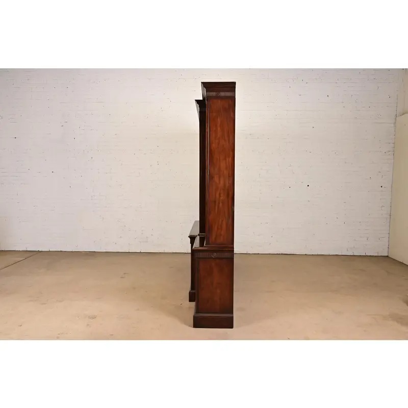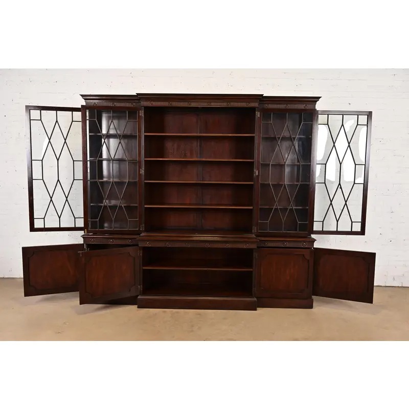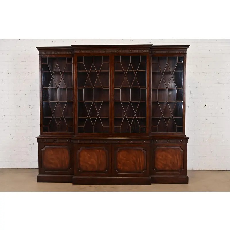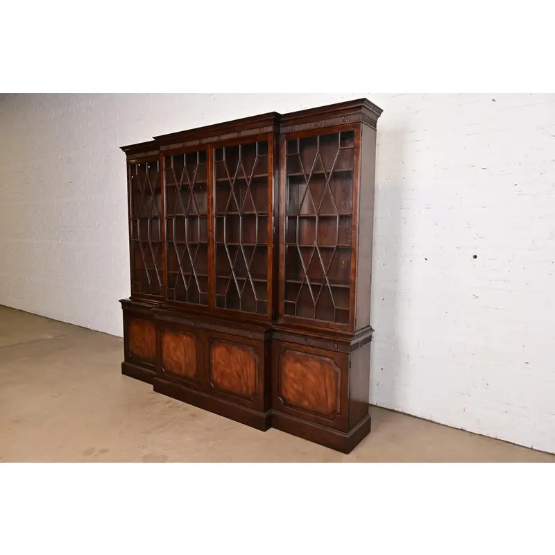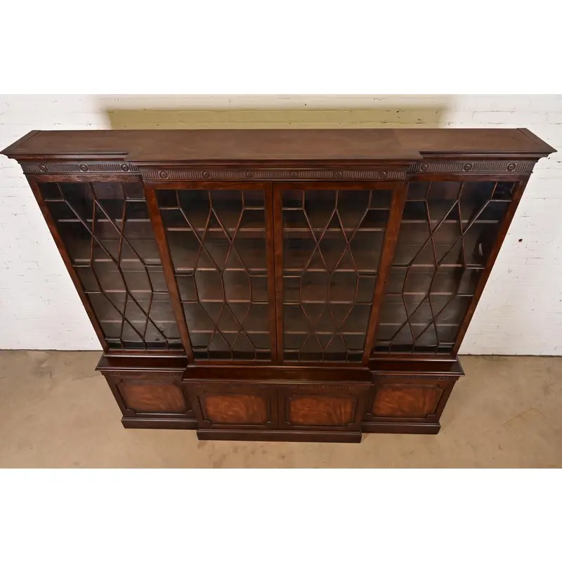 Baker Furniture Georgian Monumental Carved Flame Mahogany Breakfront Bookcase Cabinet, Circa 1960s