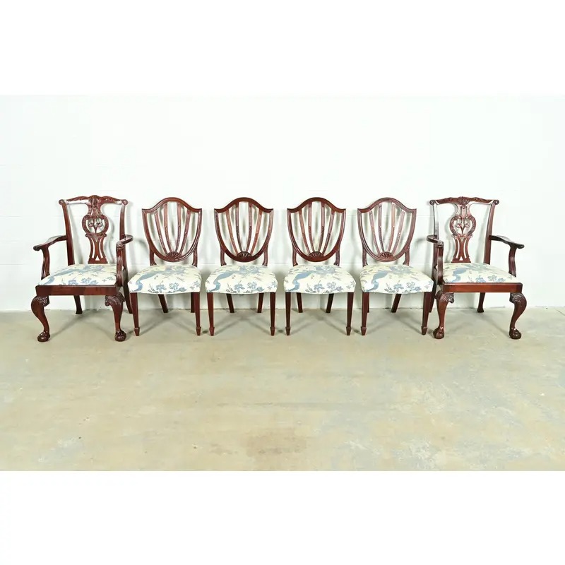 A gorgeous set of four Federal or Hepplewhite style shield back side chairs and a pair of Chippendale style armchairs