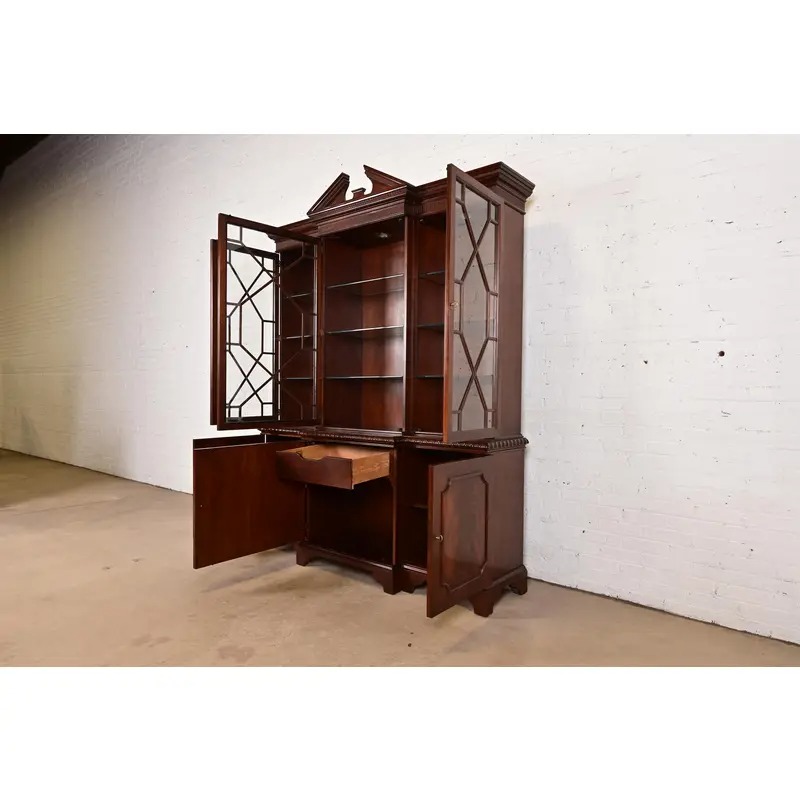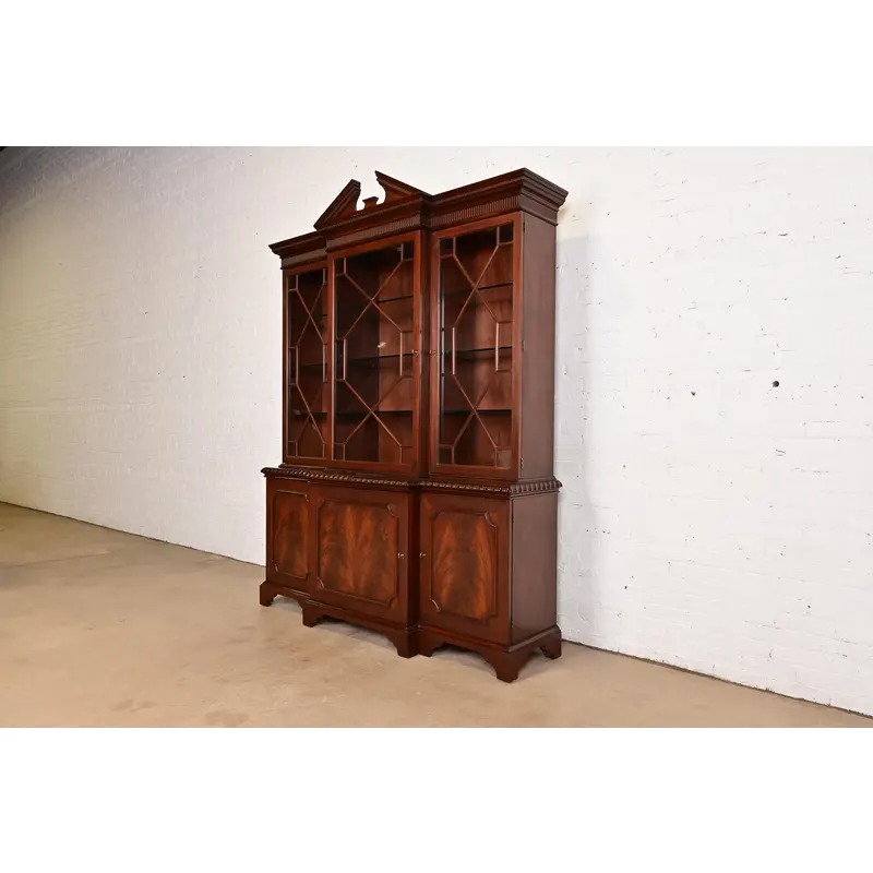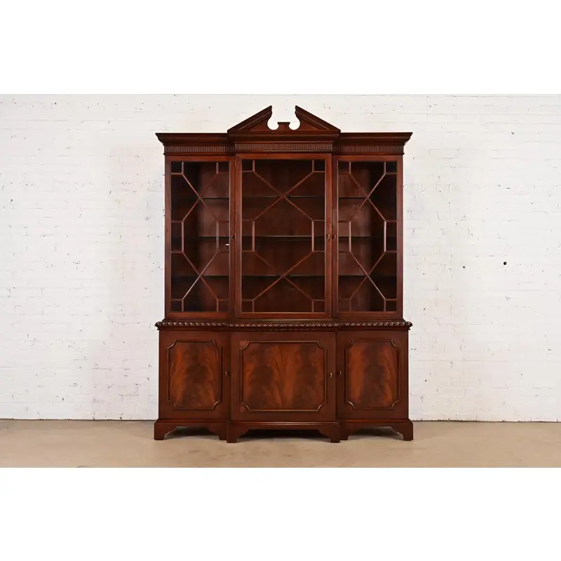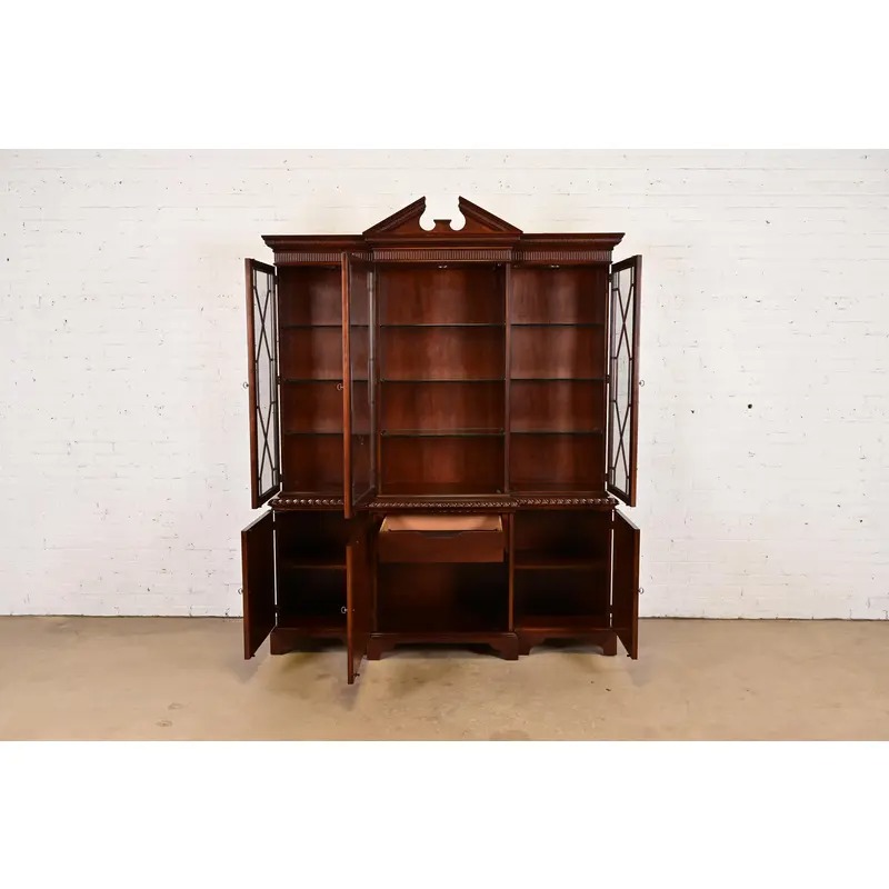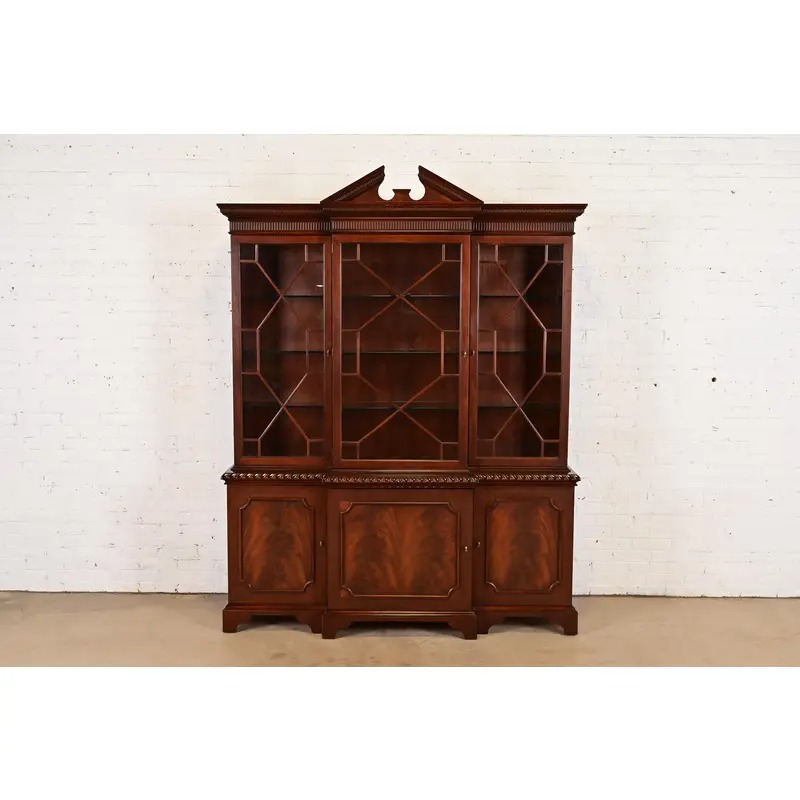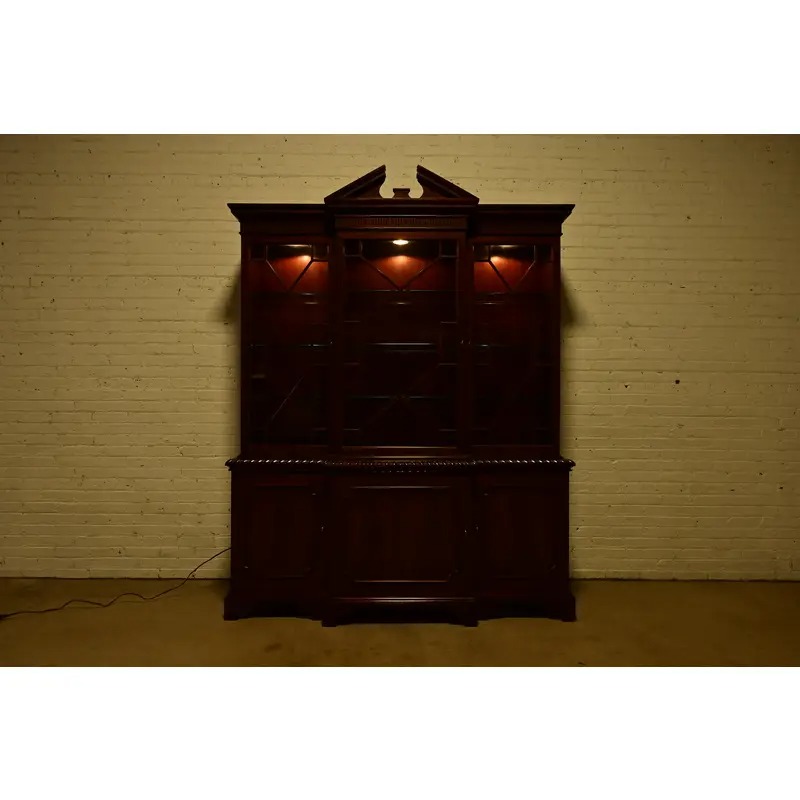 A gorgeous Georgian or Chippendale style lighted breakfront bookcase cabinet or dining cabinet