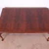 Book-matched burled walnut, having a rounded rectangular top with molded and cross-banded borders inlaid with double arrow pattern bands. The shaped frieze has a carved gadrooned border and rests on cabriole legs that are carved on the knees with scrolls and acanthus leaves and terminates in pad feet.