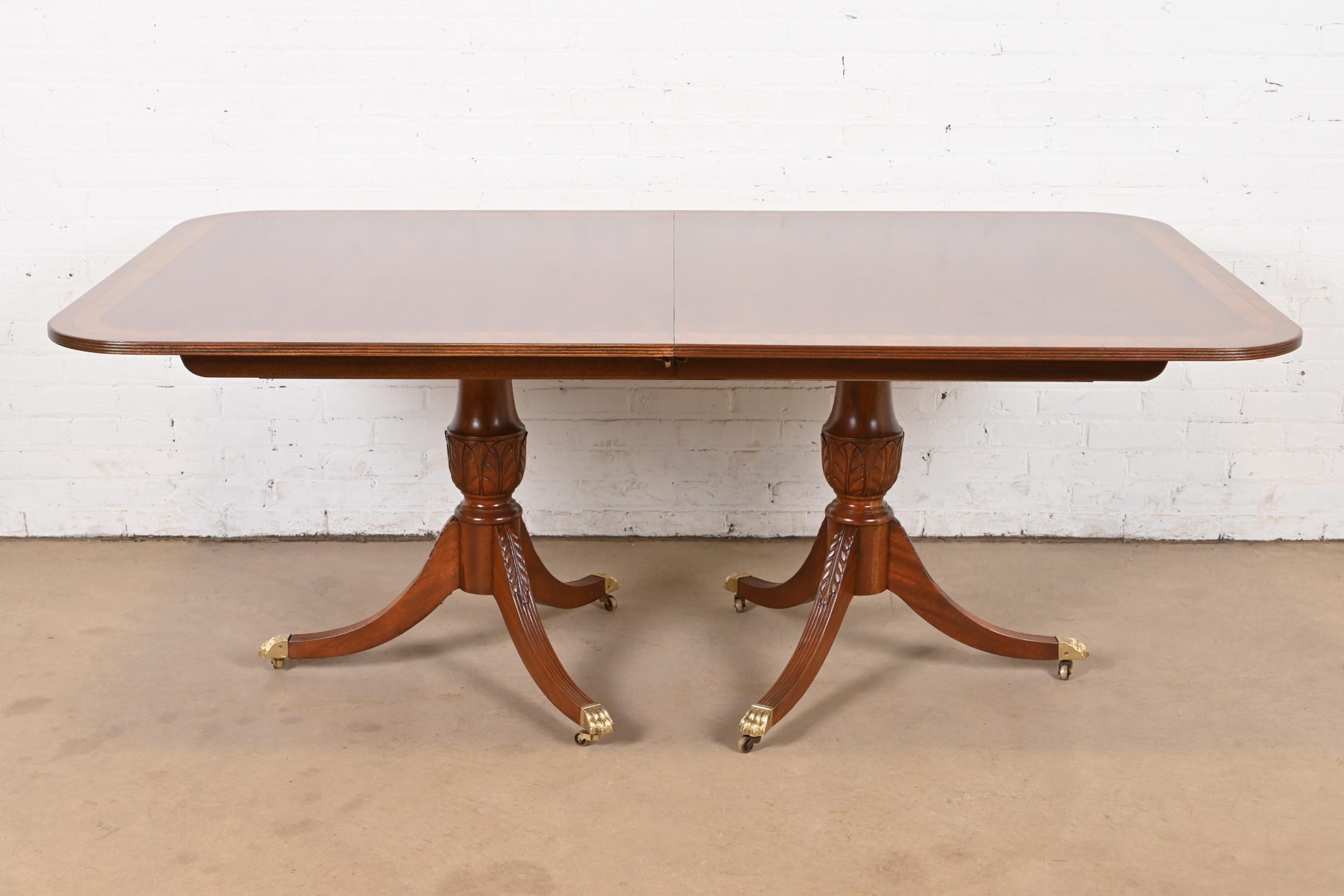 Gorgeous book-matched mahogany top, with satinwood banding, carved mahogany pedestals, and brass-capped paw feet on brass casters.
