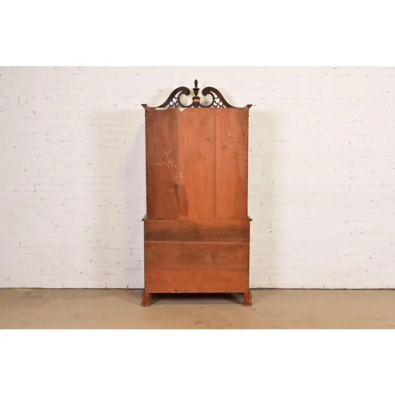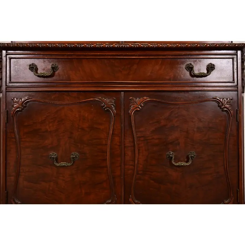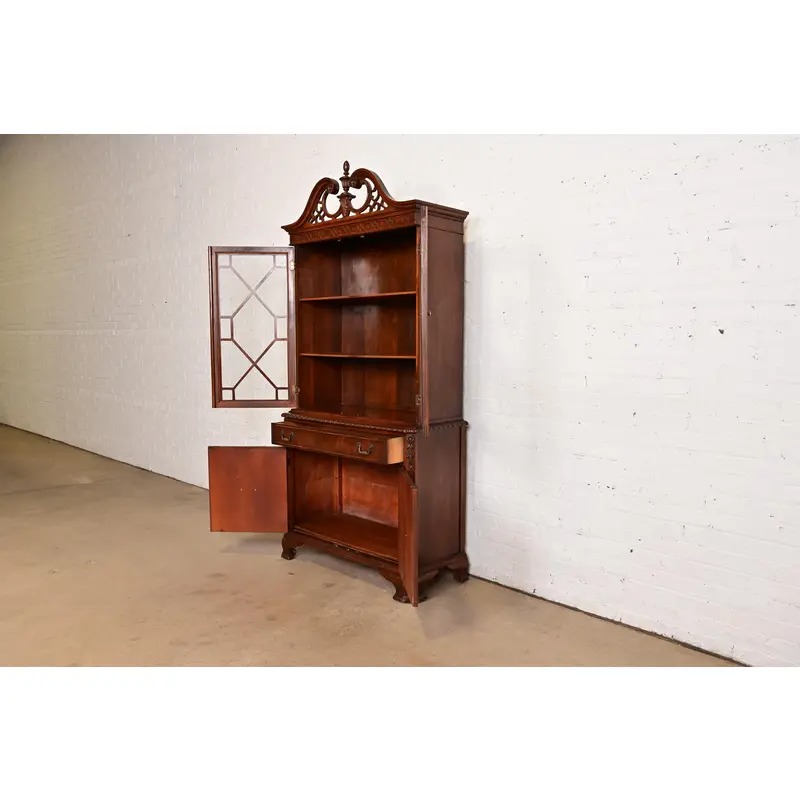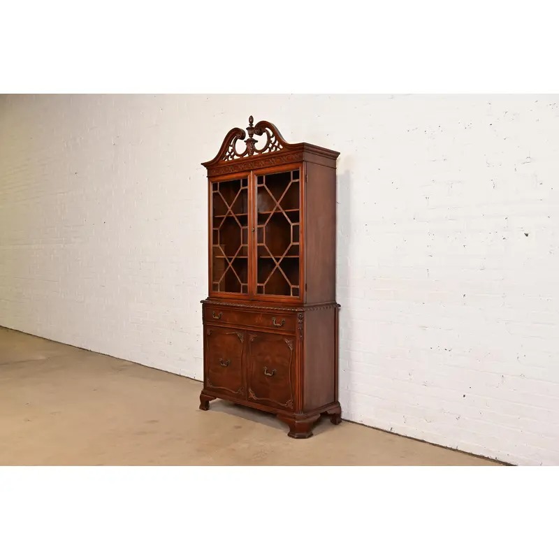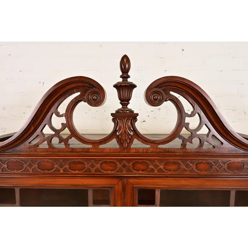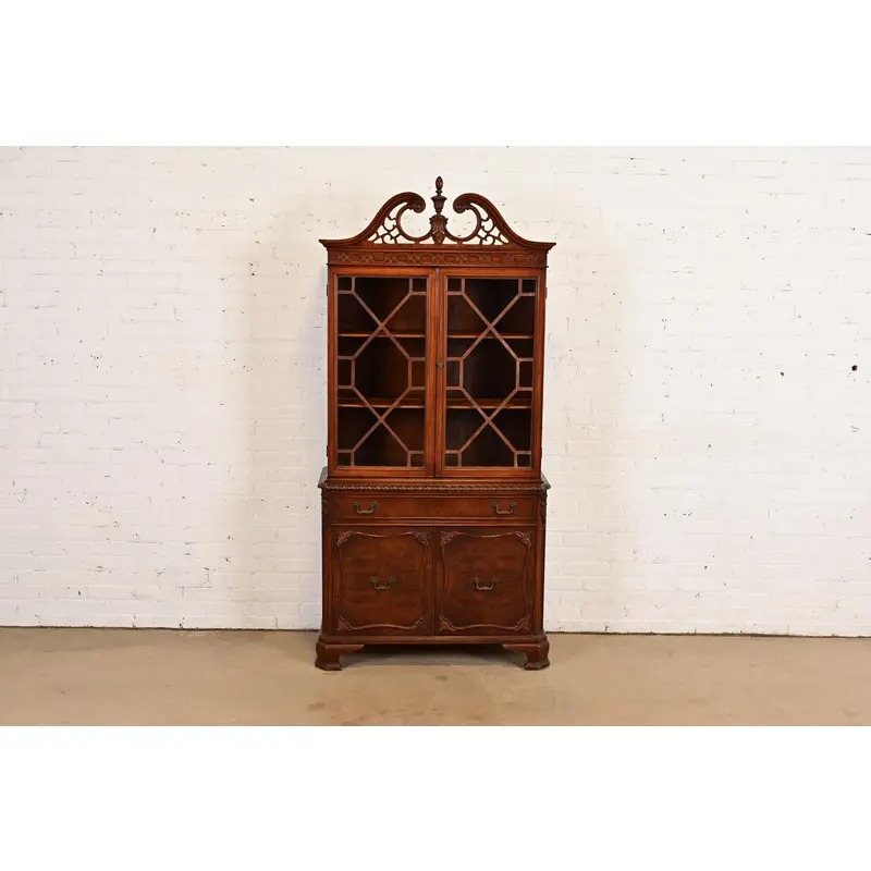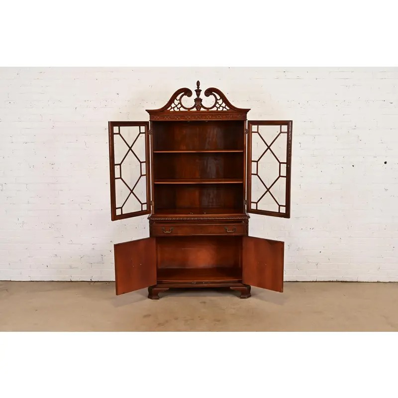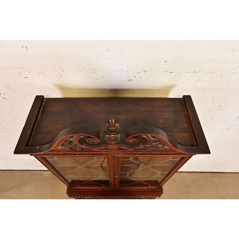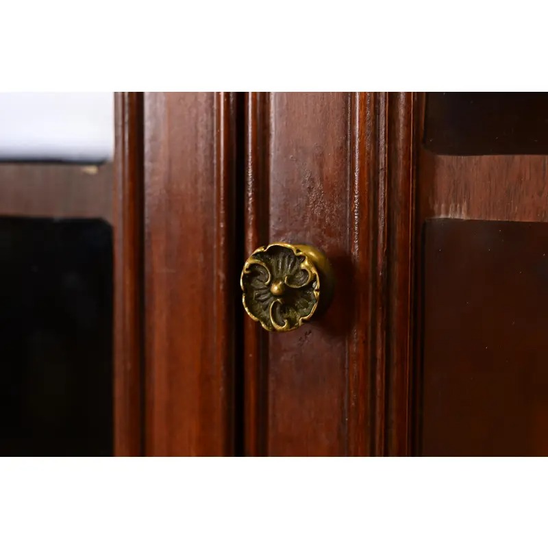 Gorgeous carved mahogany and burl wood, with mullioned glass front doors, and original brass hardware.