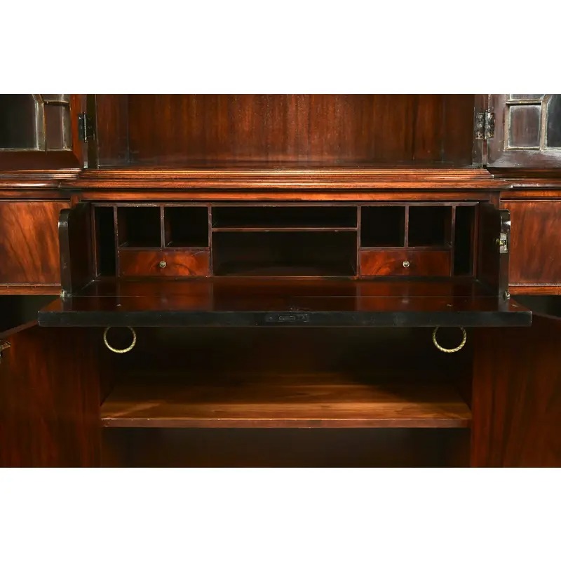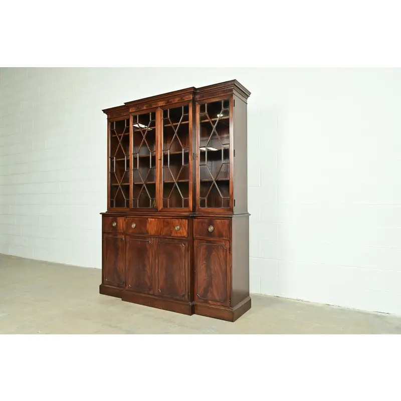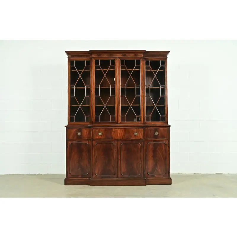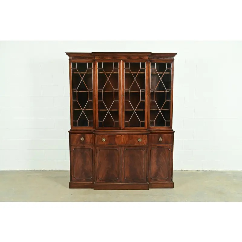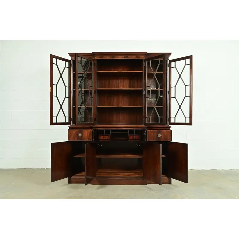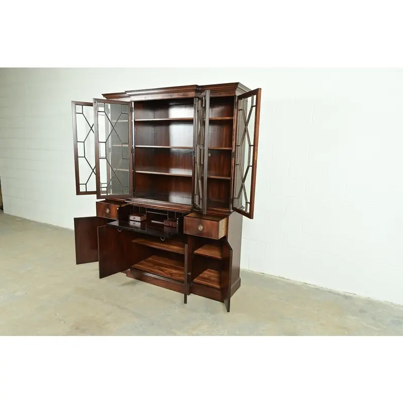 Baker Furniture Style Georgian Flame Mahogany Breakfront Bookcase Cabinet With Drop Front Secretary Desk