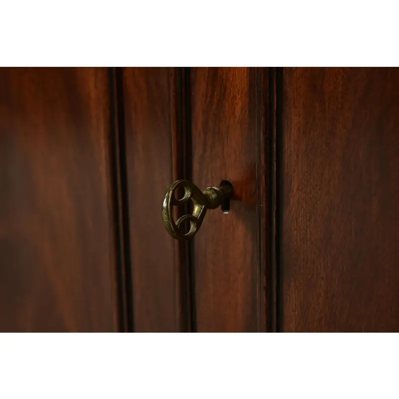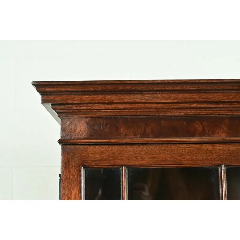 Gorgeous carved flame mahogany, with mullioned glass front doors, and original brass hardware. Interior shelves are adjustable and removable.