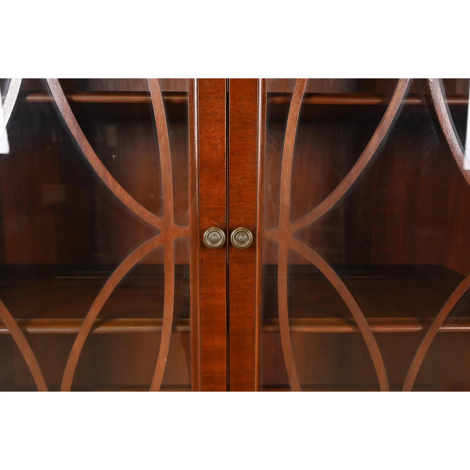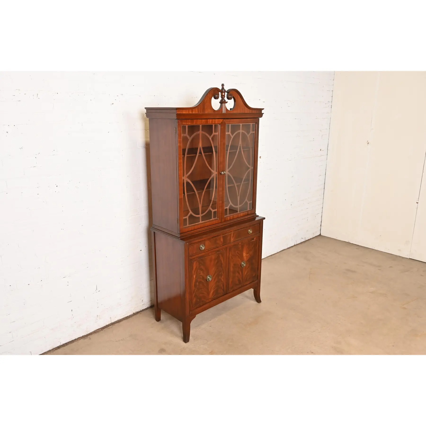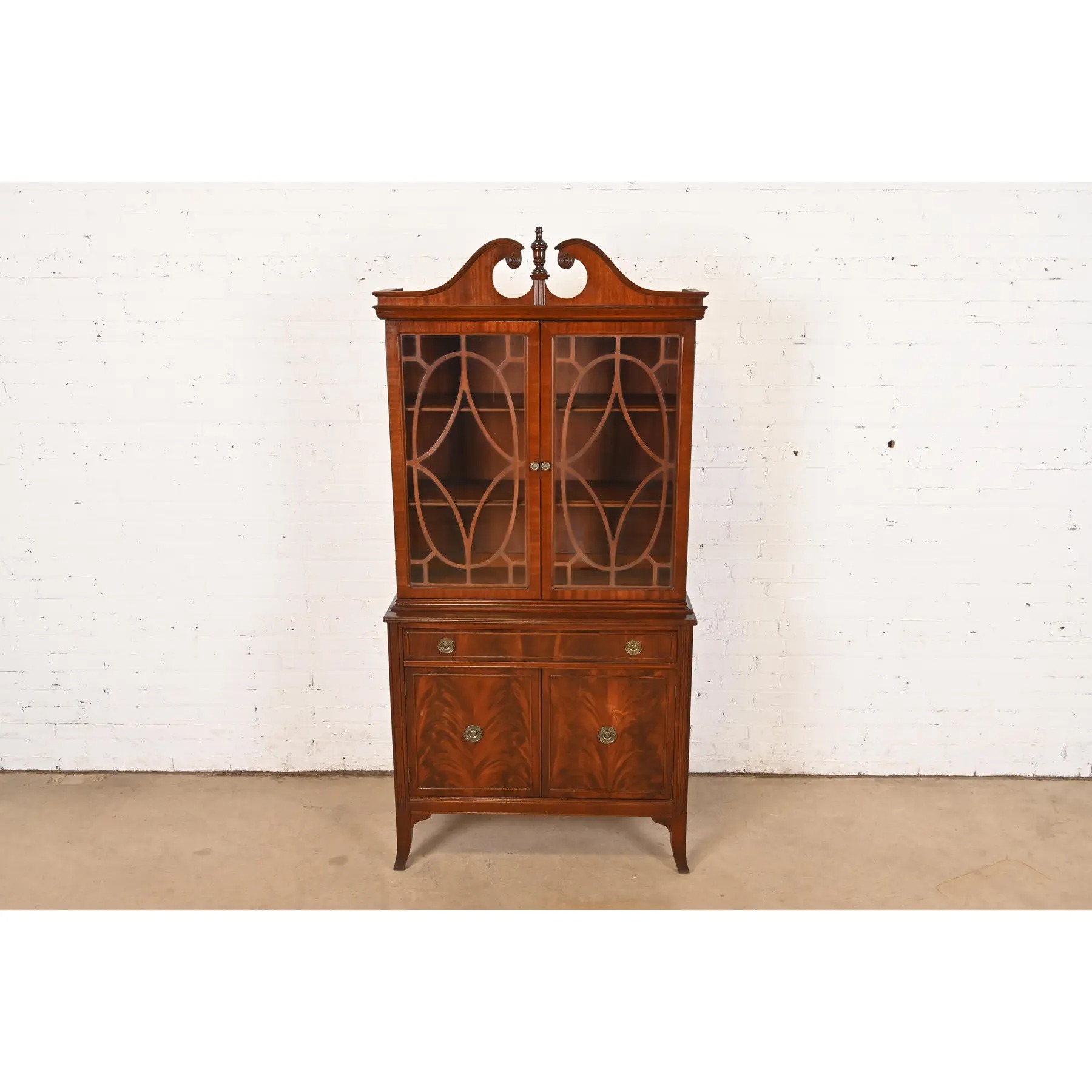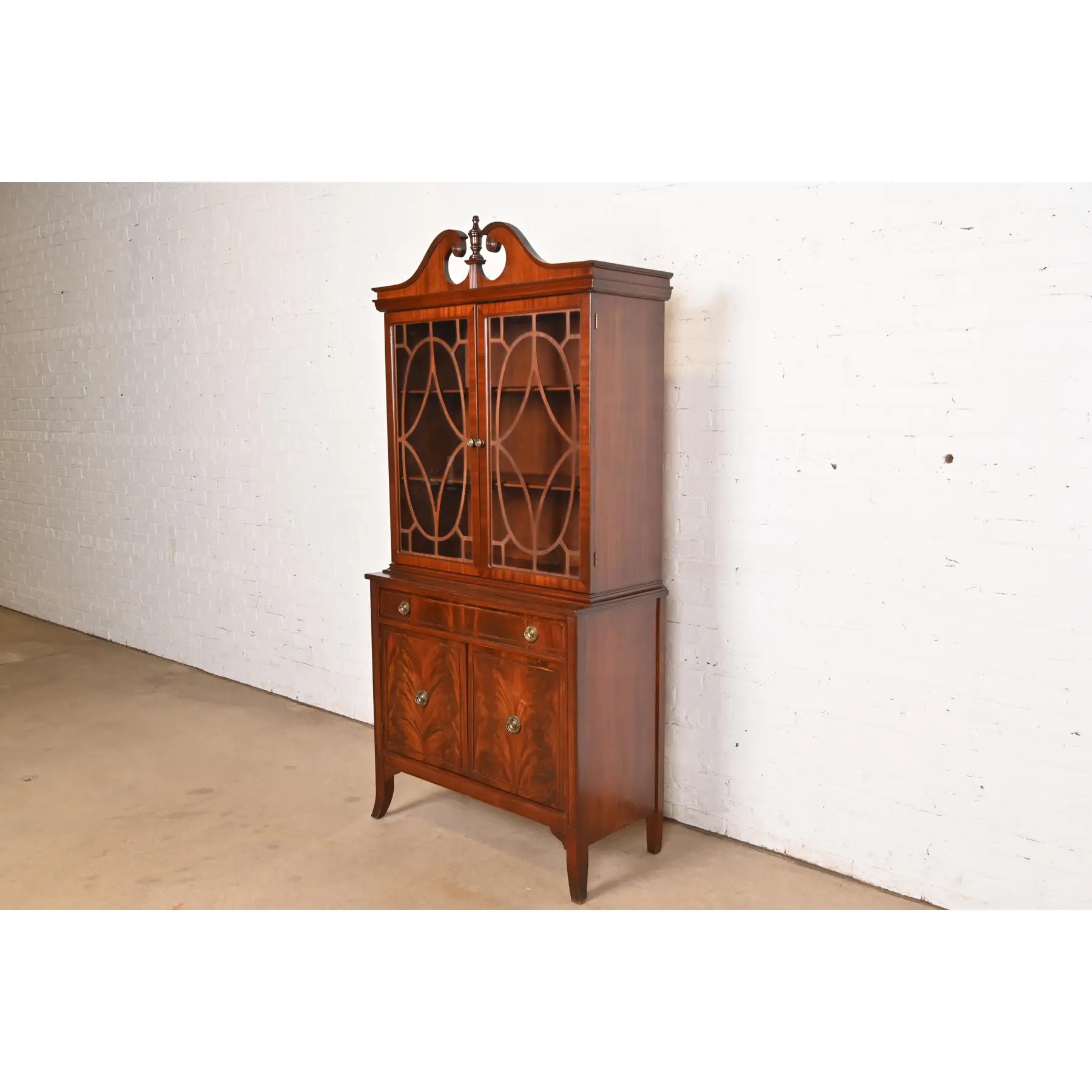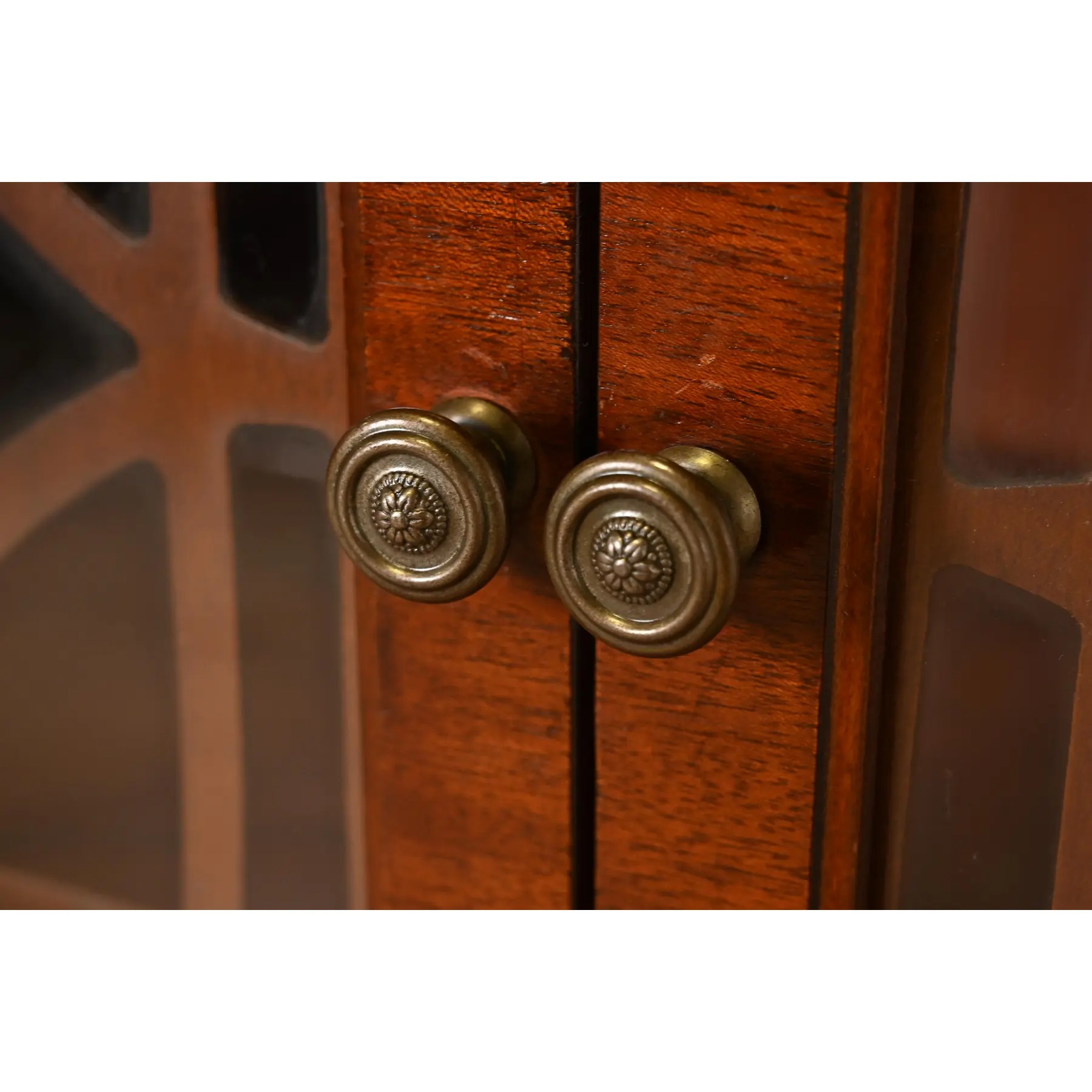 Carved flame mahogany, with mullioned glass front doors, and original brass hardware.