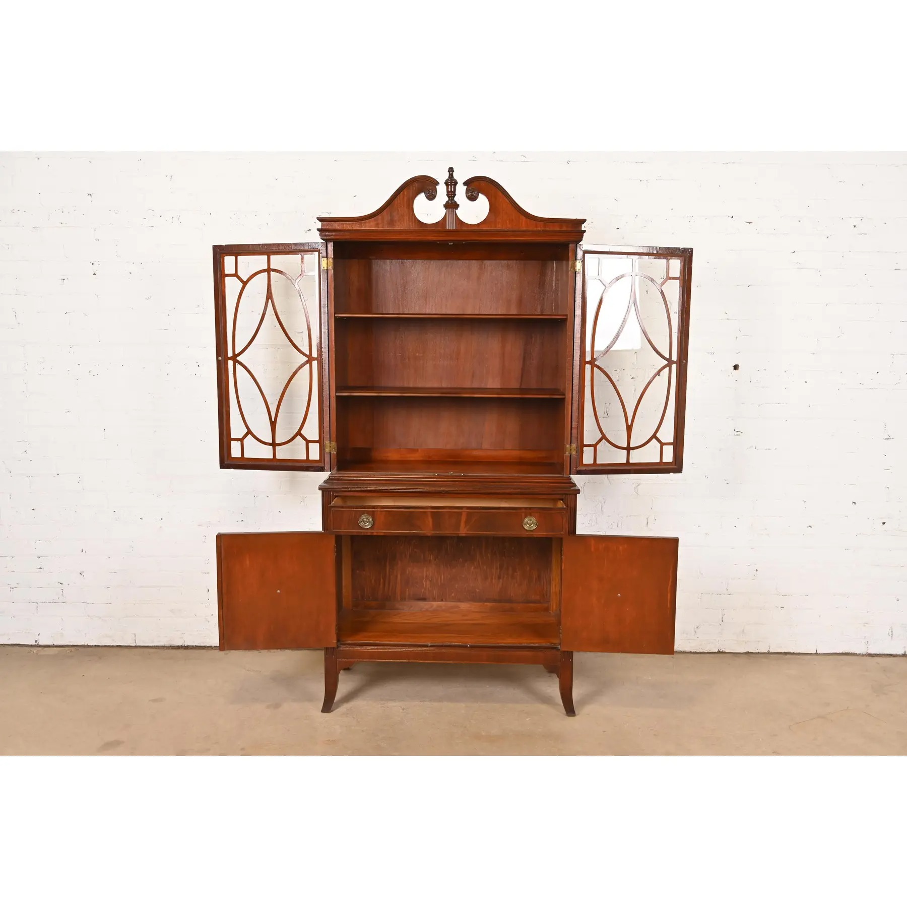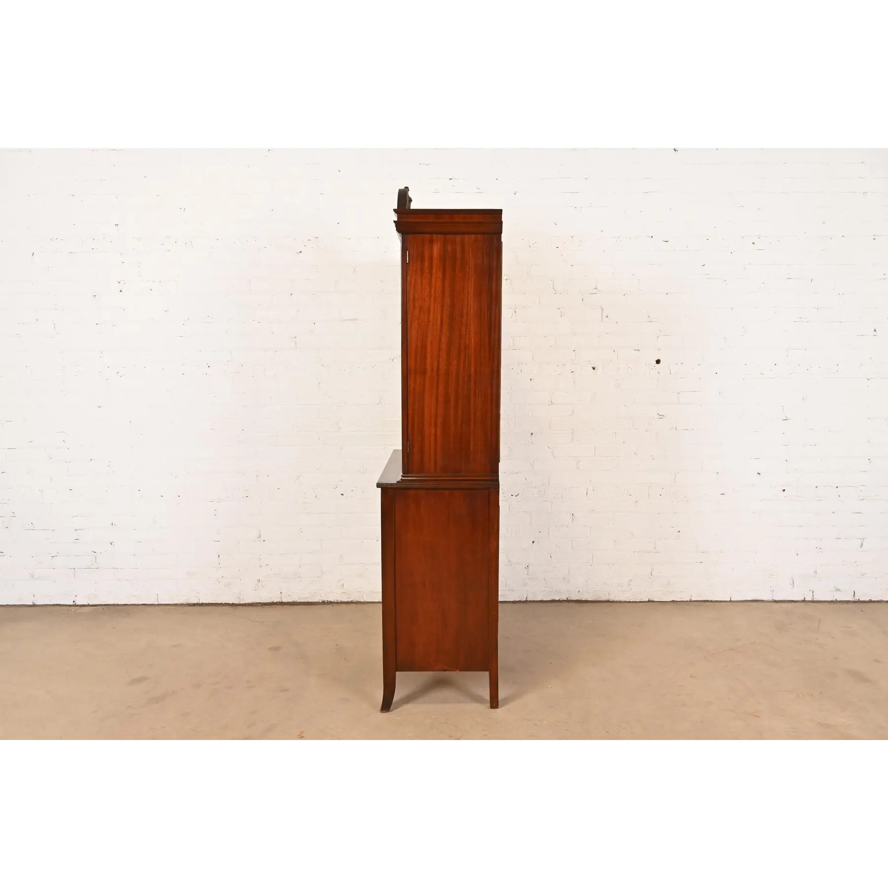 Baker Furniture Style Georgian Flame Mahogany Breakfront Bookcase Cabinet