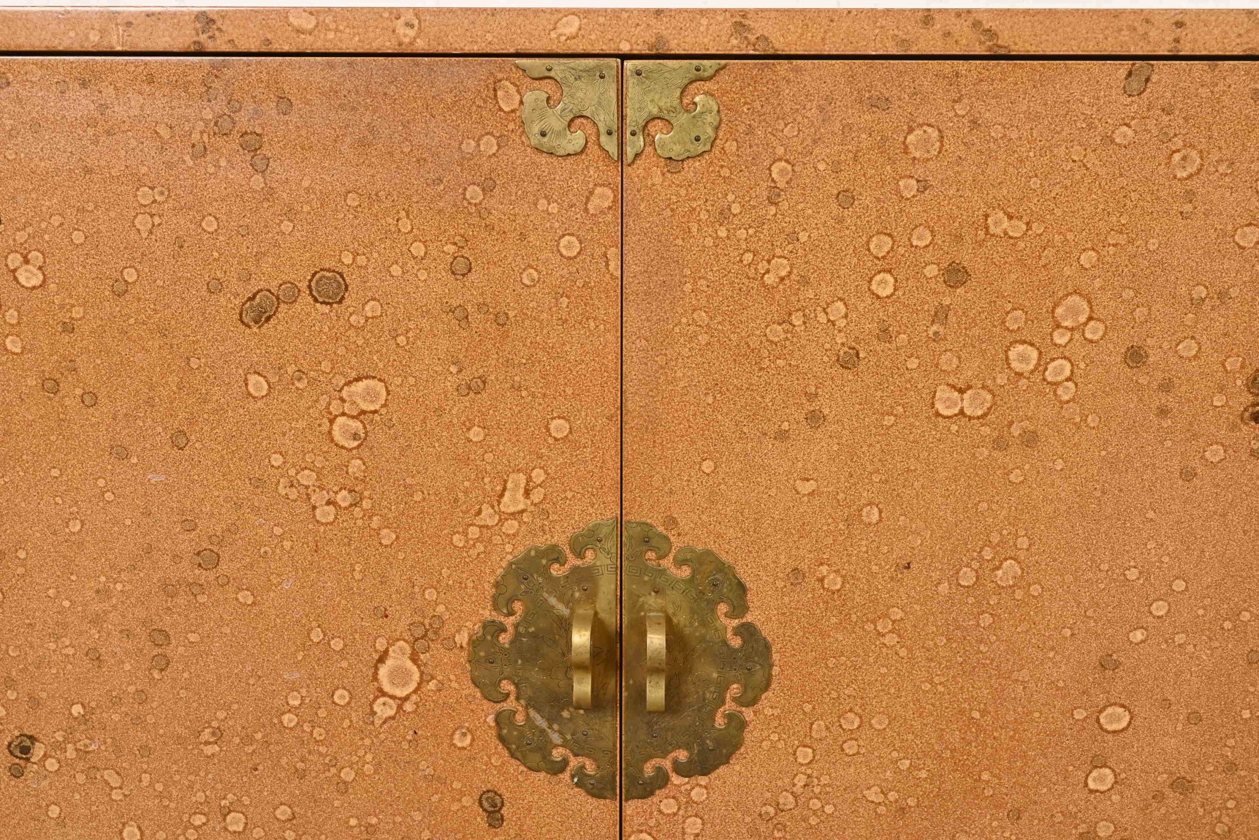 Carved walnut in faux burl wood lacquered finish, with original Asian-inspired brass hardware and accents.