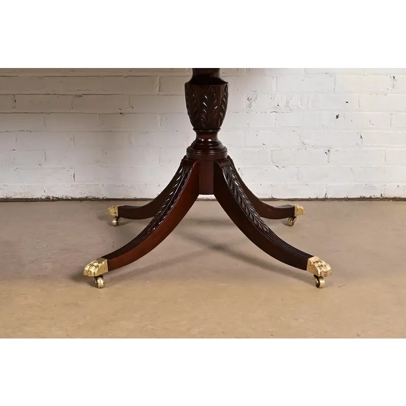 Beautiful banded mahogany, with carved solid mahogany pedestals, and brass-capped paw feet on brass casters.