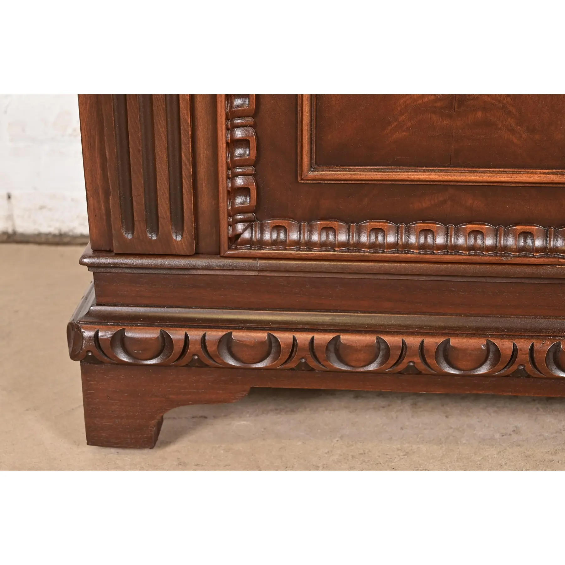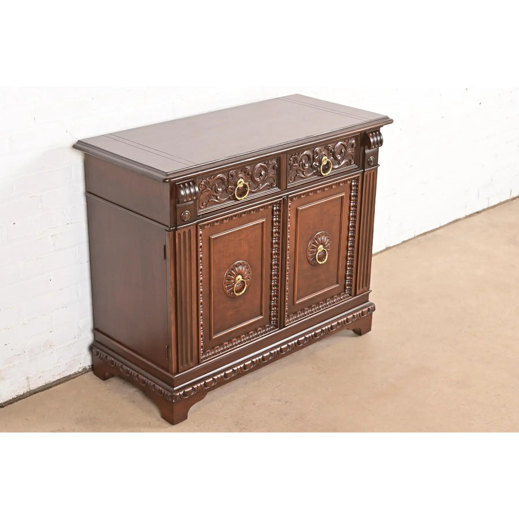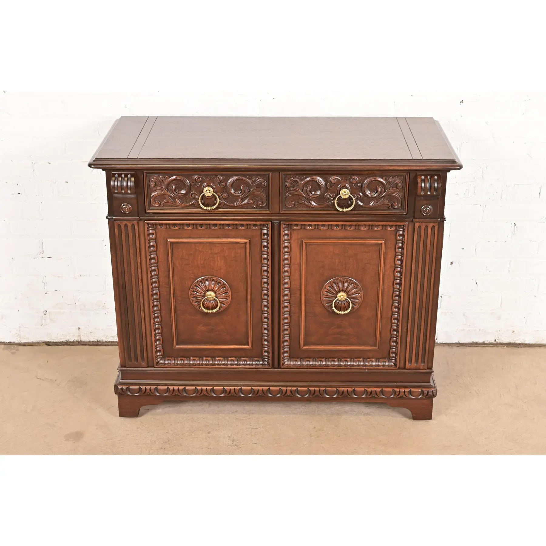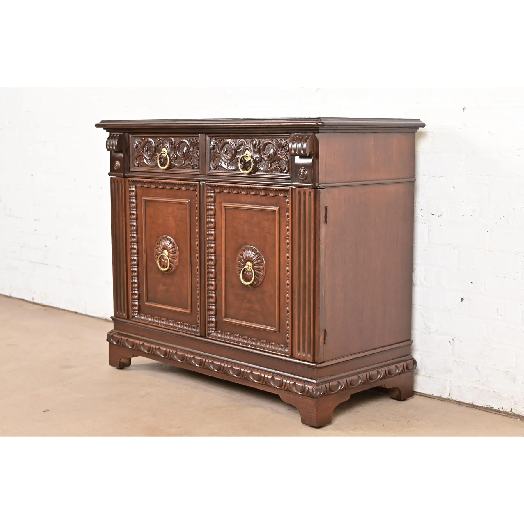 Berkey & Gay Antique English Tudor Carved Walnut and Burl Wood Bar Cabinet, Newly Refinished