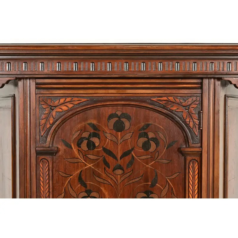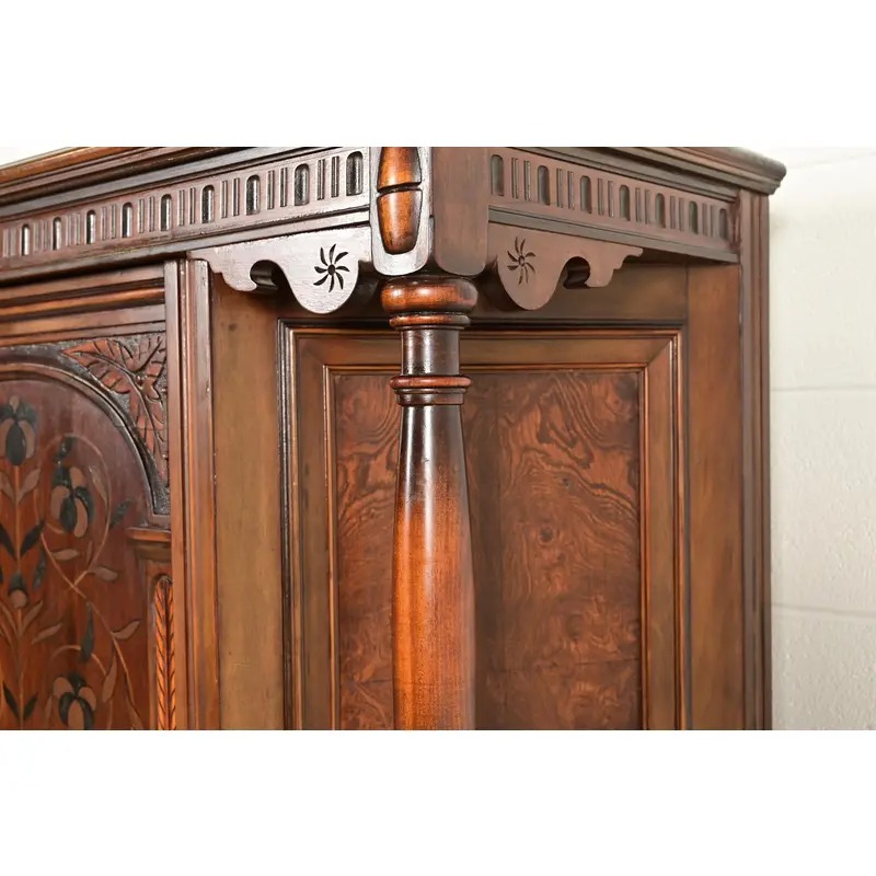 Ornate carved walnut, with burl wood panels, and original brass hardware.