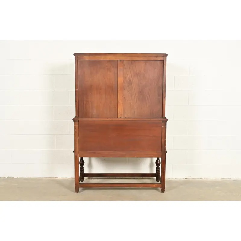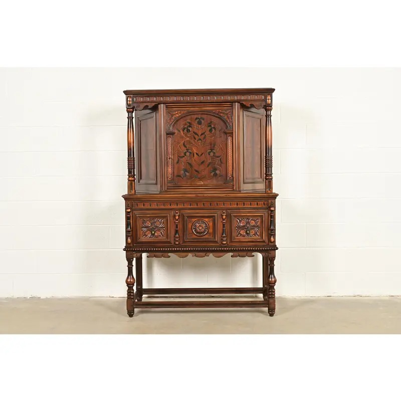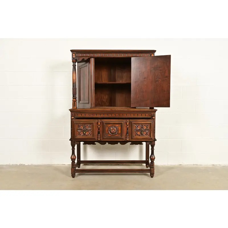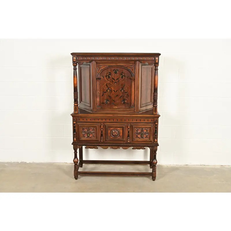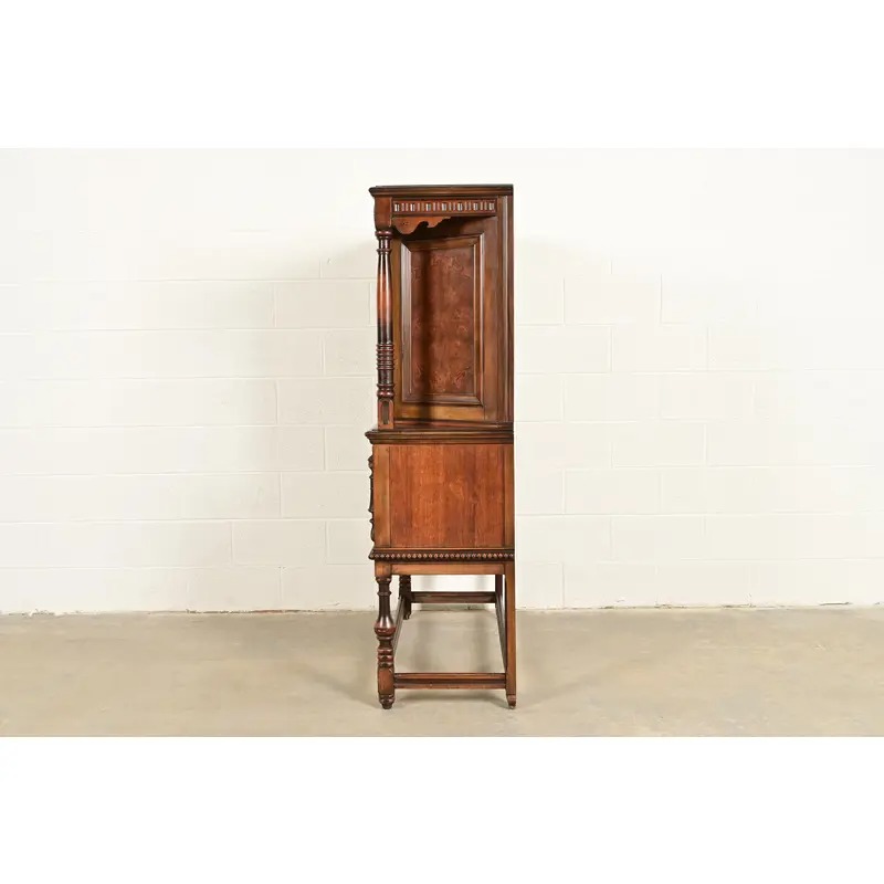 Berkey & Gay Antique English Tudor Carved Walnut and Burl Wood Bookcase or Bar Cabinet, Circa 1920s
