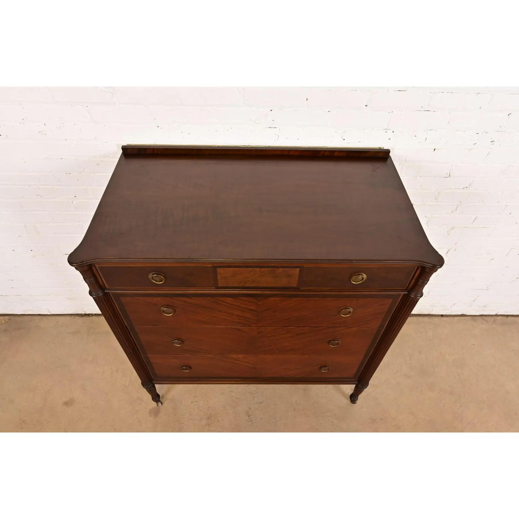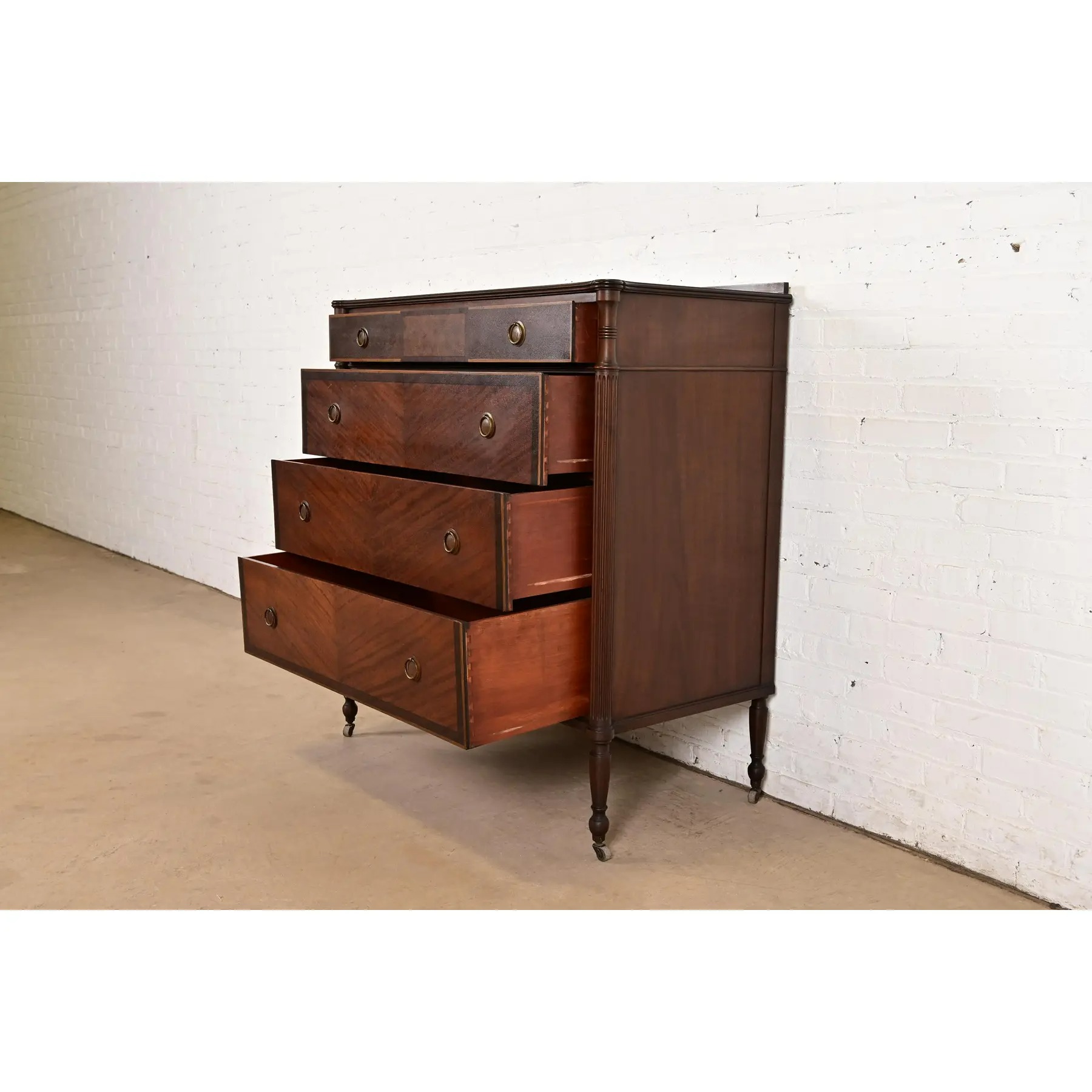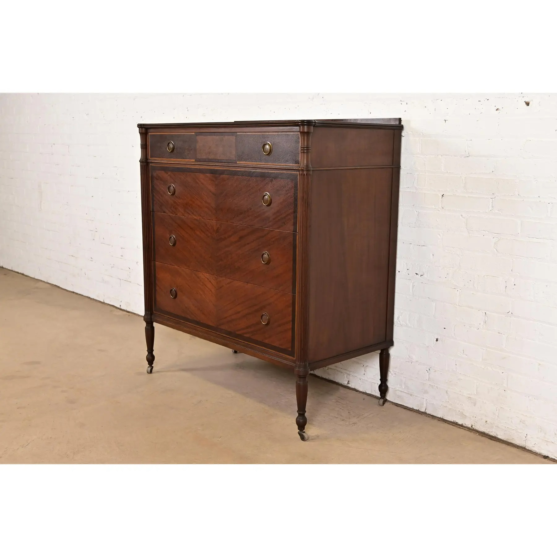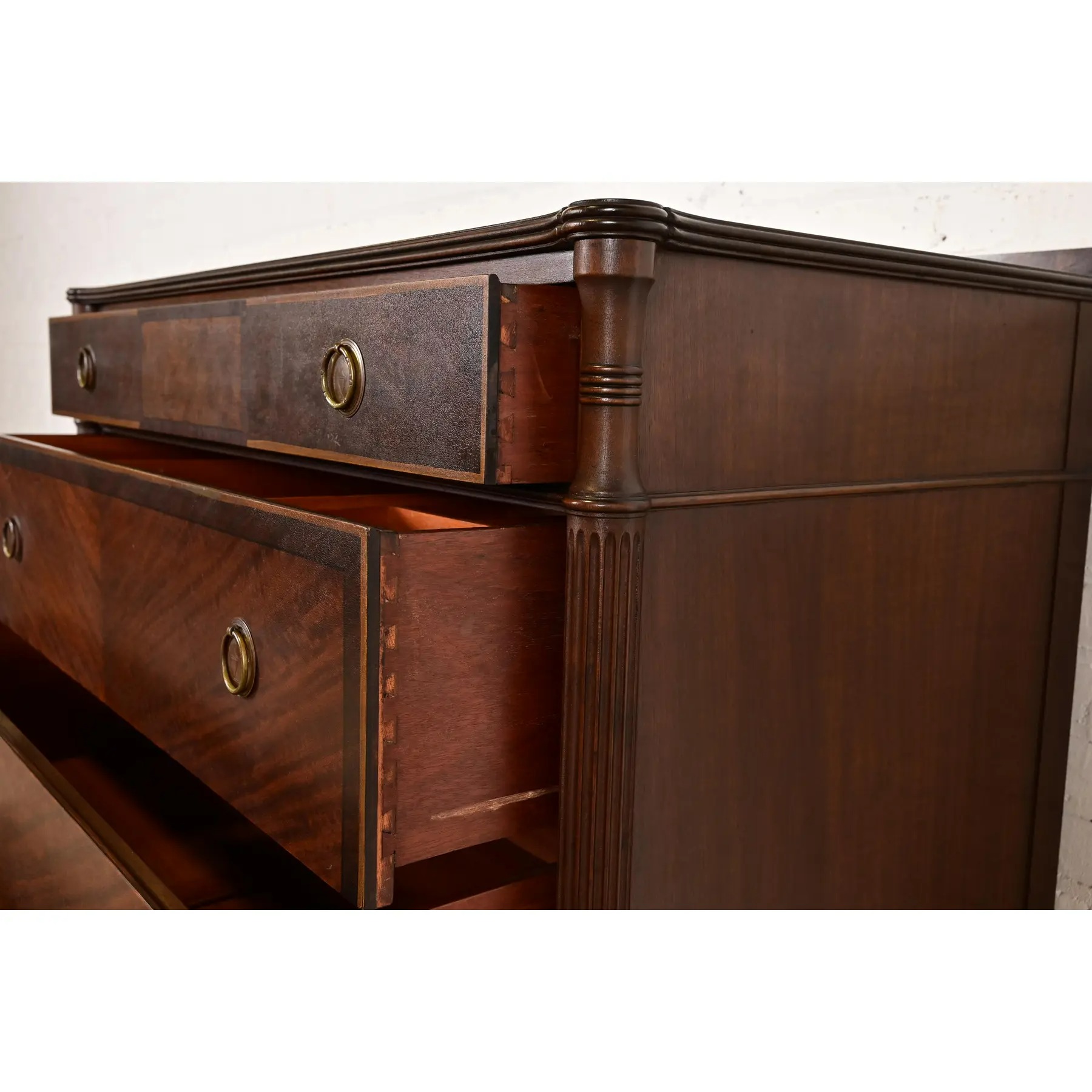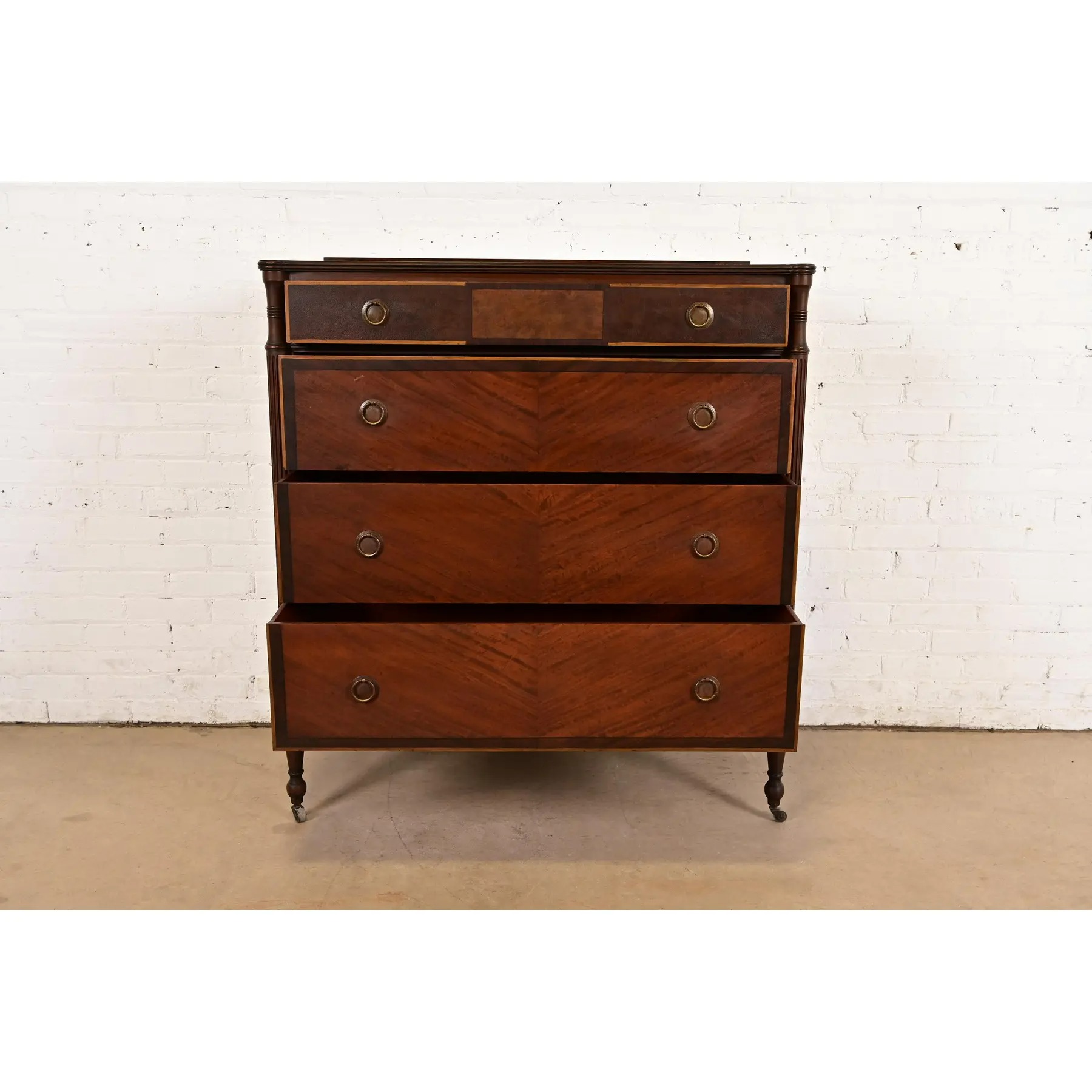 Berkey & Gay Antique French Regency Louis XVI Carved Mahogany and Burled Walnut Highboy Dresser, Circa 1920s