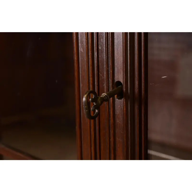 Carved flame mahogany and burl wood, with mullioned glass front doors, and original brass hardware. Cabinet locks, and key is included.